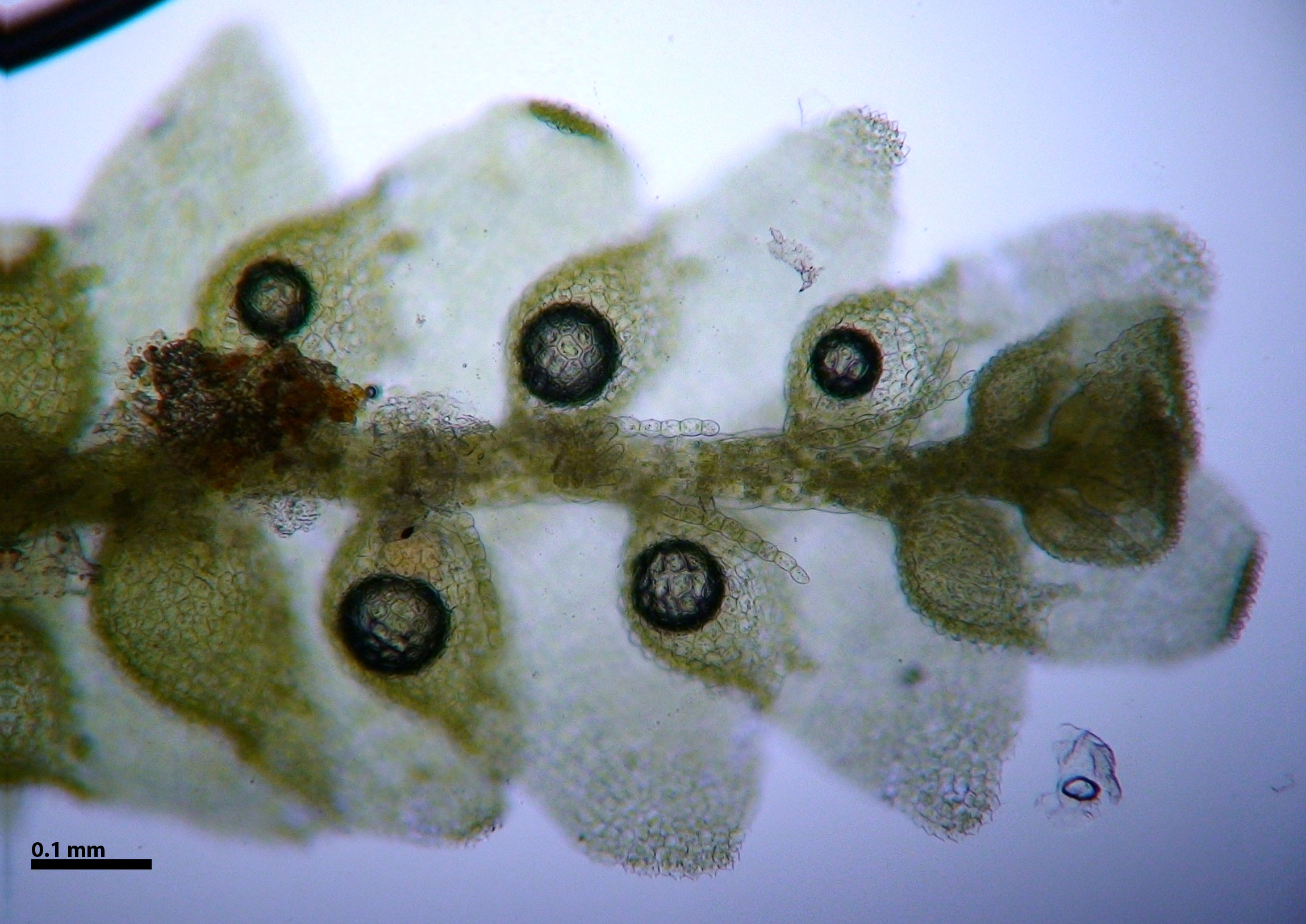 Occurring as isolated shoots over other bryophytes or forming thin mats over calcareous rock; individual shoots <0.5 mm wide; leaves complicate-bilobed with prominent styli (a stylus is a narrow appendage between the leaf lobule and the stem); underleaves absent. Outer surface of leaves and perianths papillose, each cell bearing a single, large papilla.