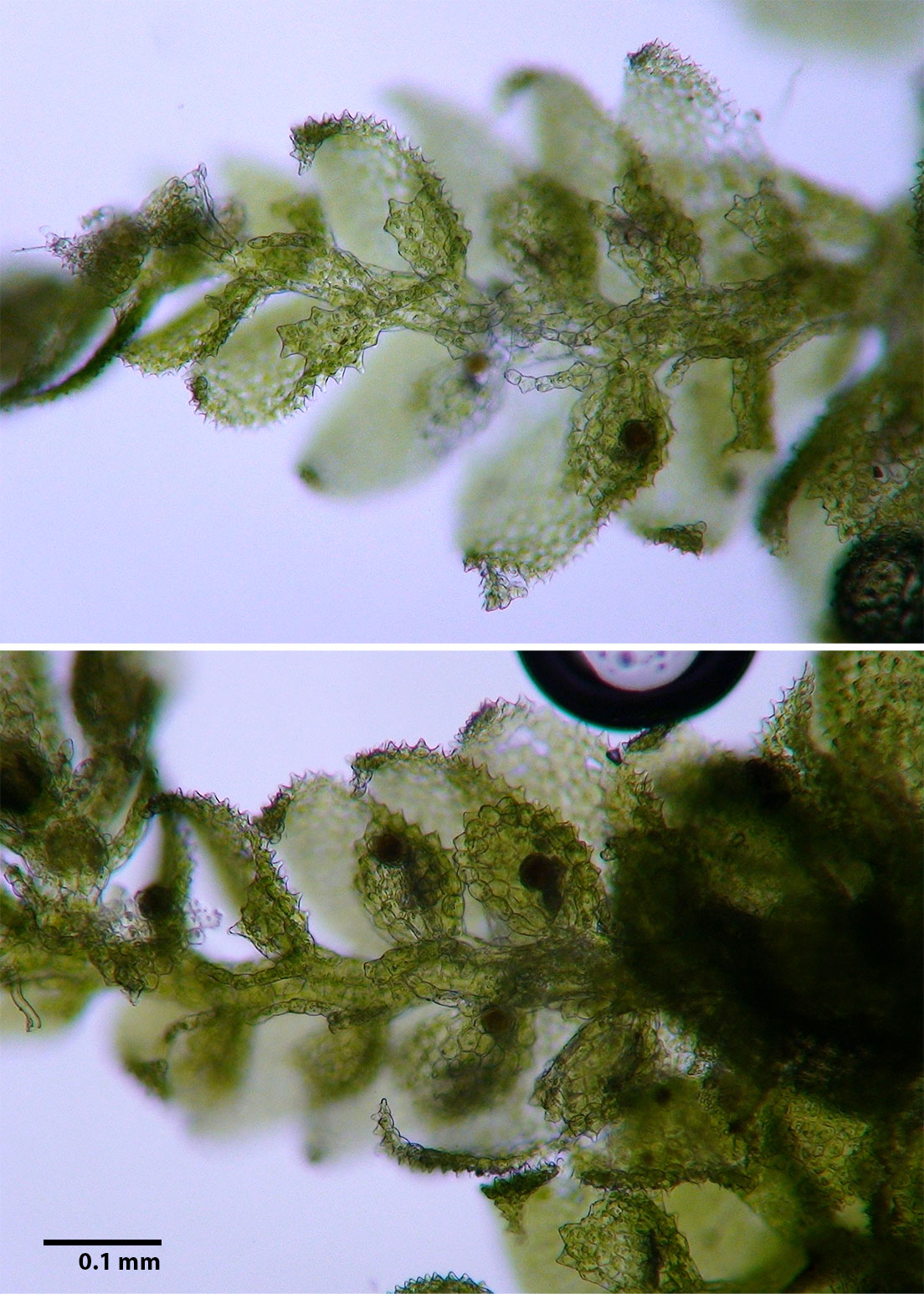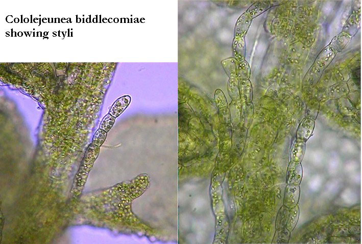Cololejeunea is one of six genera of Lejeuneaceae known to occur in the southern Appalachians. Unlike other regional Lejeuneaceae, Cololejeunea lacks underleaves. Of the four species of Cololejeunea known to occur in the southern Appalachians only two, C. biddlecomiae & C. ornata, possess papillose cells and well developed styli. Cololejeunea biddlecomiae, a very common species, lacks the distinctive, "sharp" texture of C. ornata. This textural distinctiveness is created by the combination of ornate vestiture and narrower leaf tips. The surface topography of exposed leaves appears sharply roughened due to the taller papillae. C. biddlecomiae is a slightly larger plant with less narrow leaf tips. Collectively, these distinctions as seen with a hand lens, create a recognizable pattern.