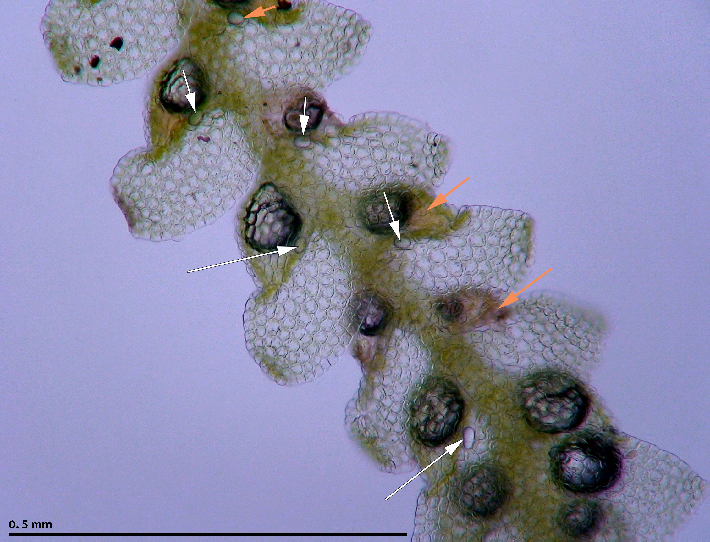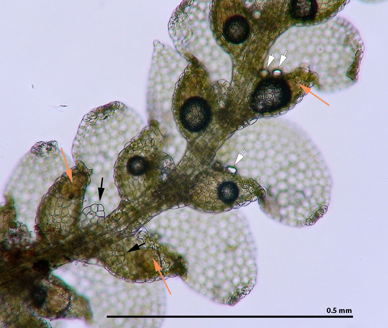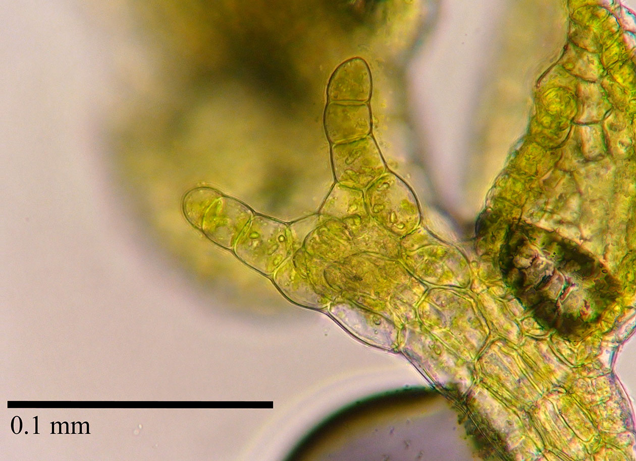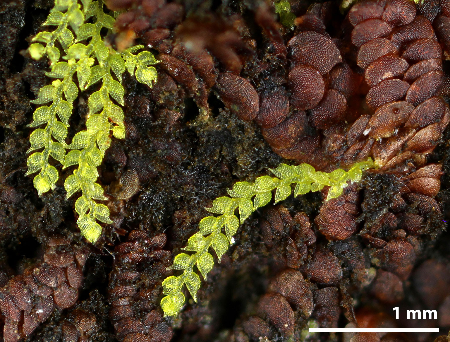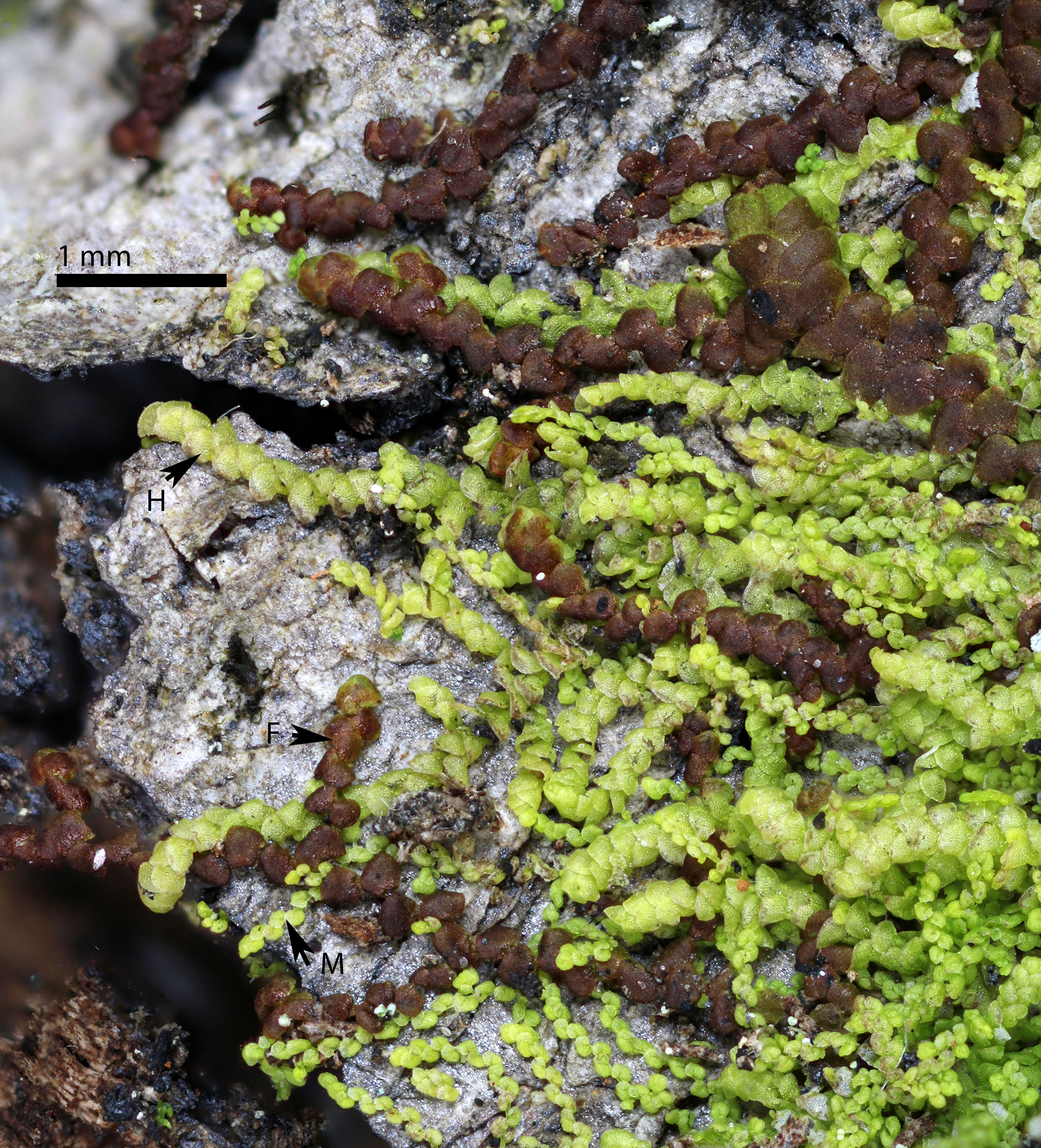 Occurring as isolated, prostrate shoots or shoots amassed forming thin mats. Individual shoots (leaves plus stem) 0.25 to 0.50 mm wide. Lateral leaves complicate-bilobed, the dorsal lobe falcate and quickly tapering to the apex (acuminate); one or two ocelli near the middle of some dorsal lobes of lateral leaves. Underleaves bilobed with wide spreading lobes, each lobe consisting of a single row of cells.