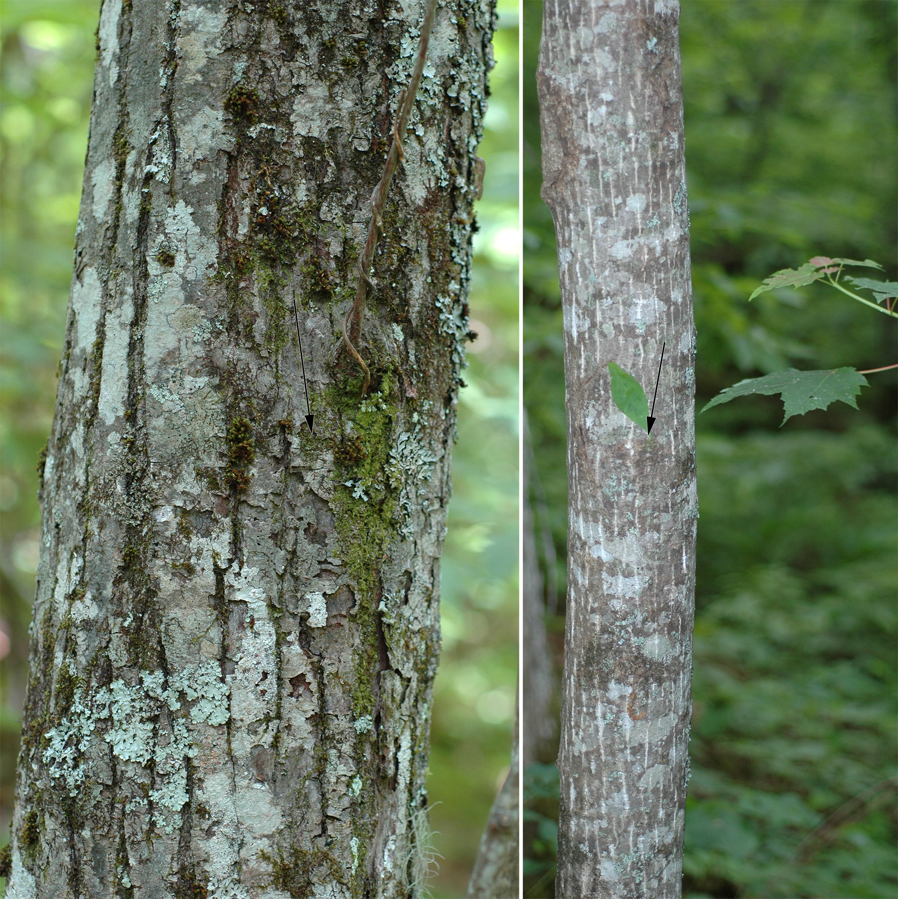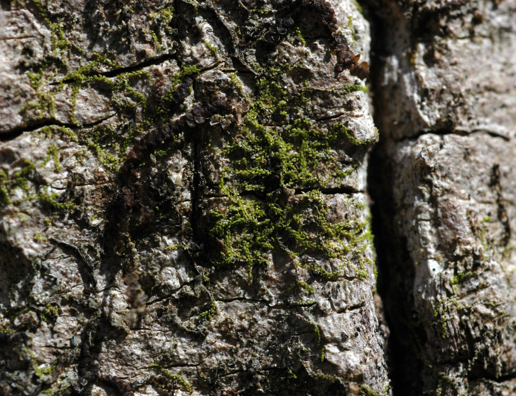 Pure patches are not uncommon on the bark of younger trees, while scattered strands amongst other bryophytes are typical of older trees with rough bark. On young trees it appears to colonize the recessed crevices and slight irregularities of otherwise smooth bark. From these shaded micro-ravines of bark, shoots may spread out across the exposed flat bark surfaces forming pure patches of several square centimeters. Such robust, thin mats appear on trunks of young Liriodendron and other woody plants in close proximity to streams.