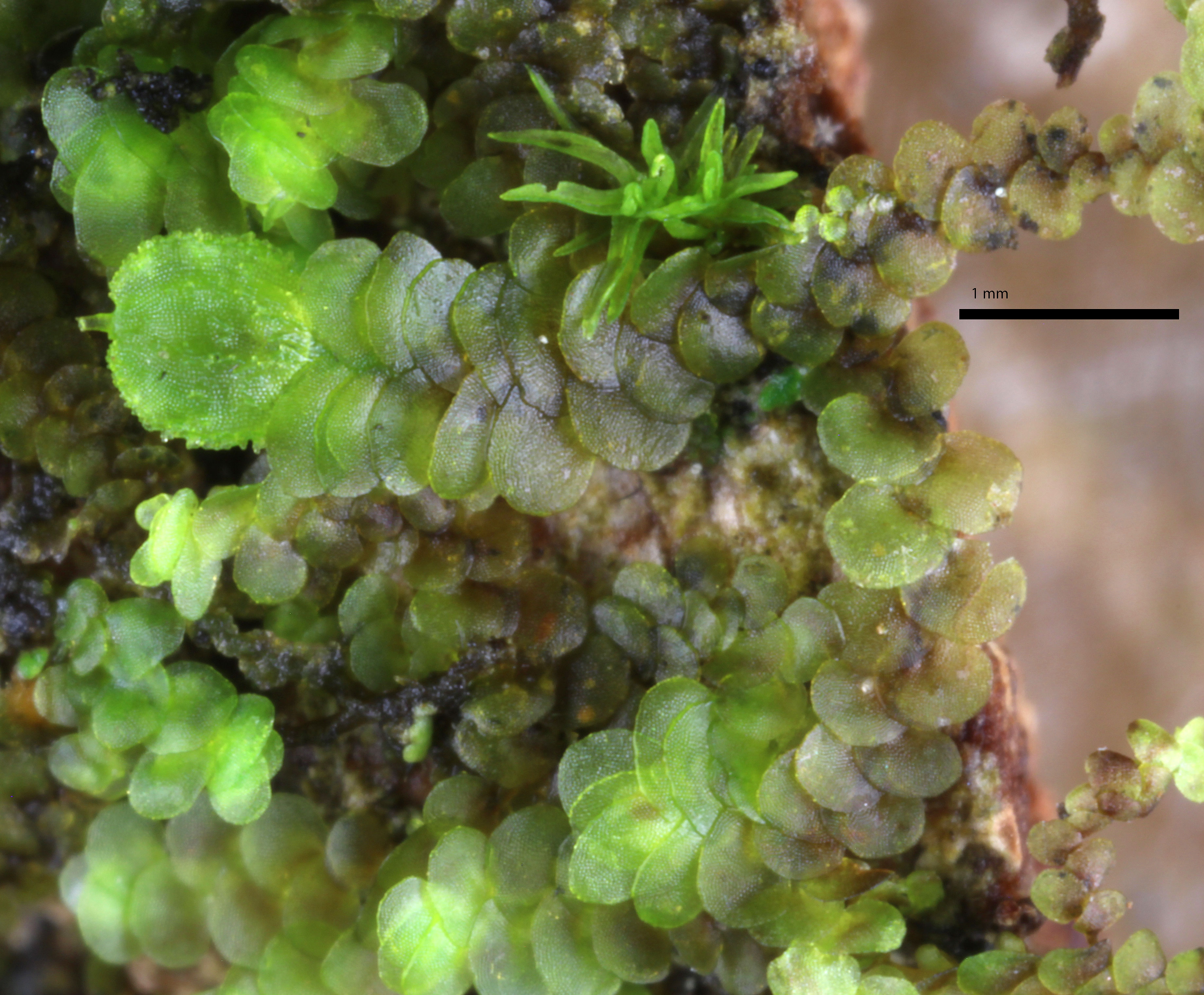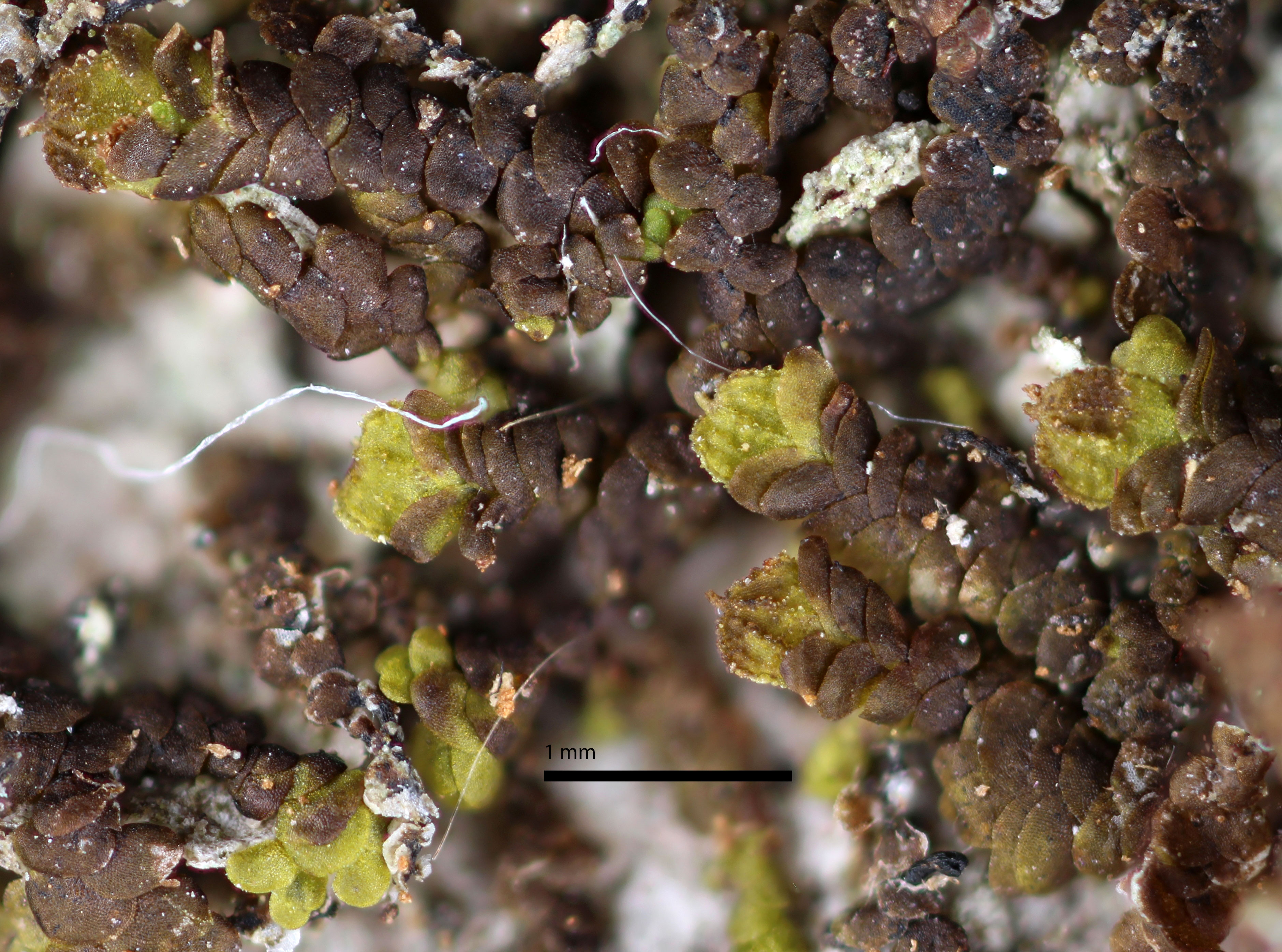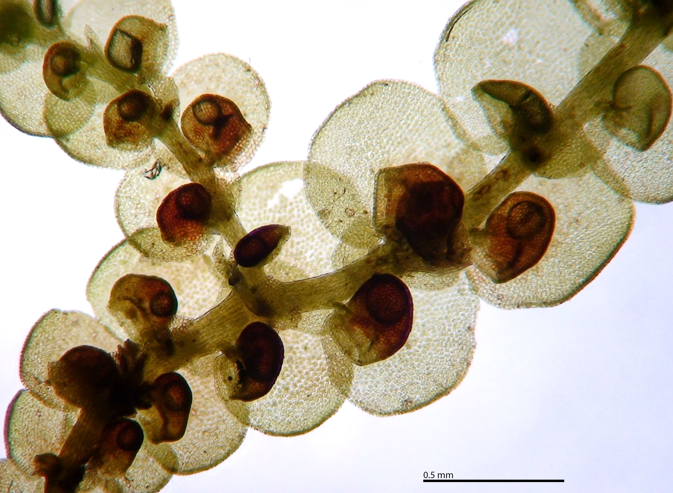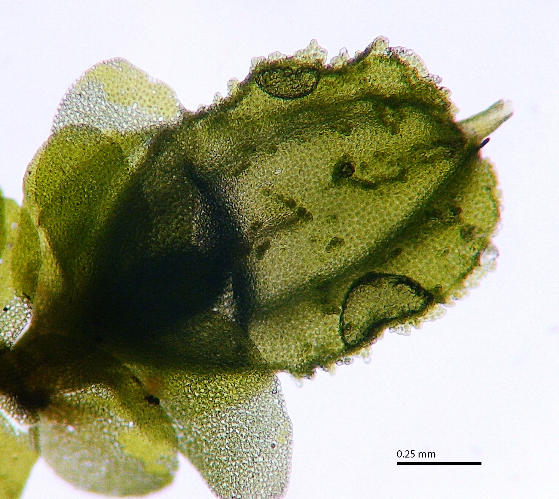 Well developed underleaves are very helpful in confirming identifications, especially in long-dead plants lacking oil bodies. The shape of underleaves is distinctive in the wide, toothed shoulders that quickly narrow to the insertion on the stem.