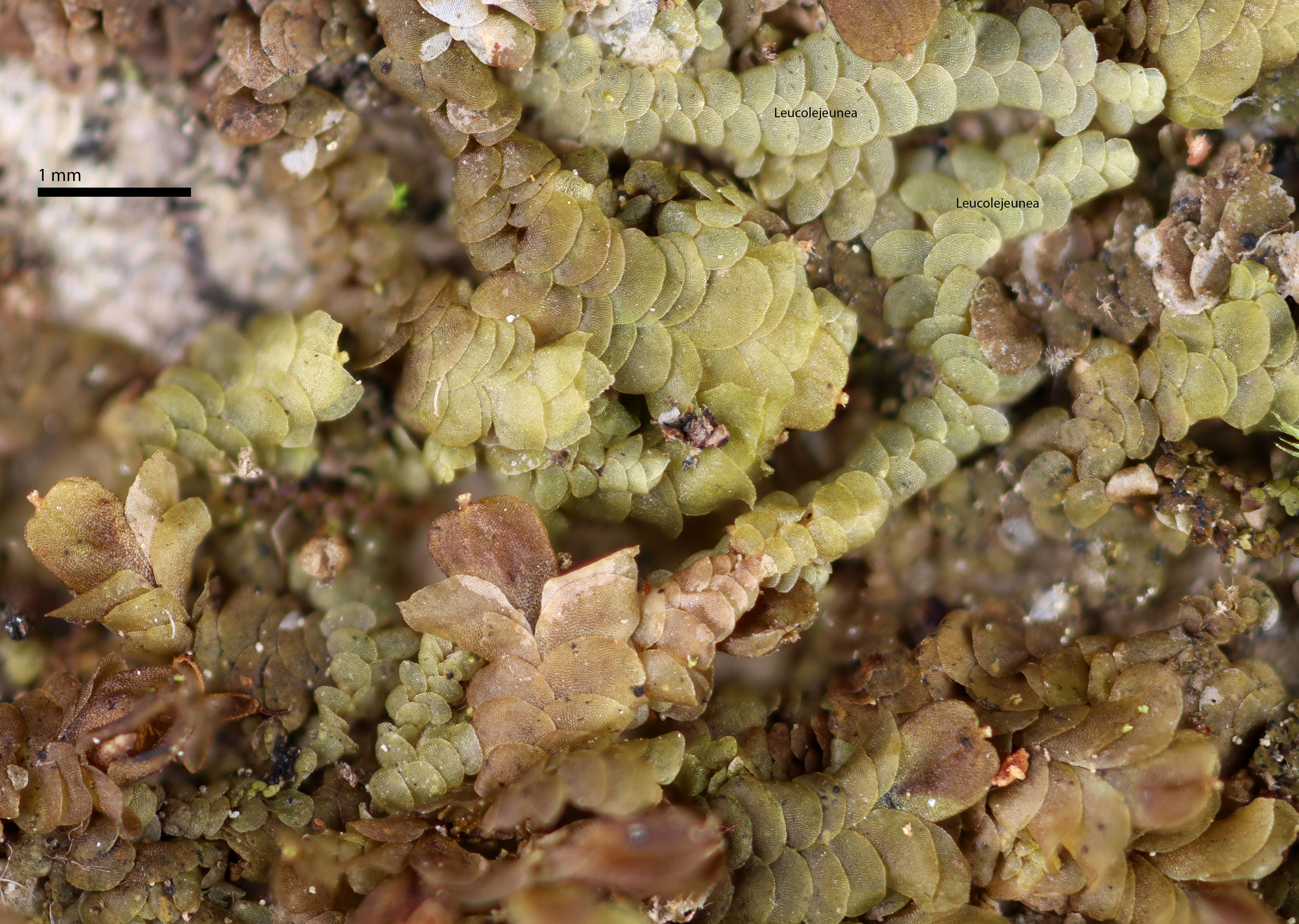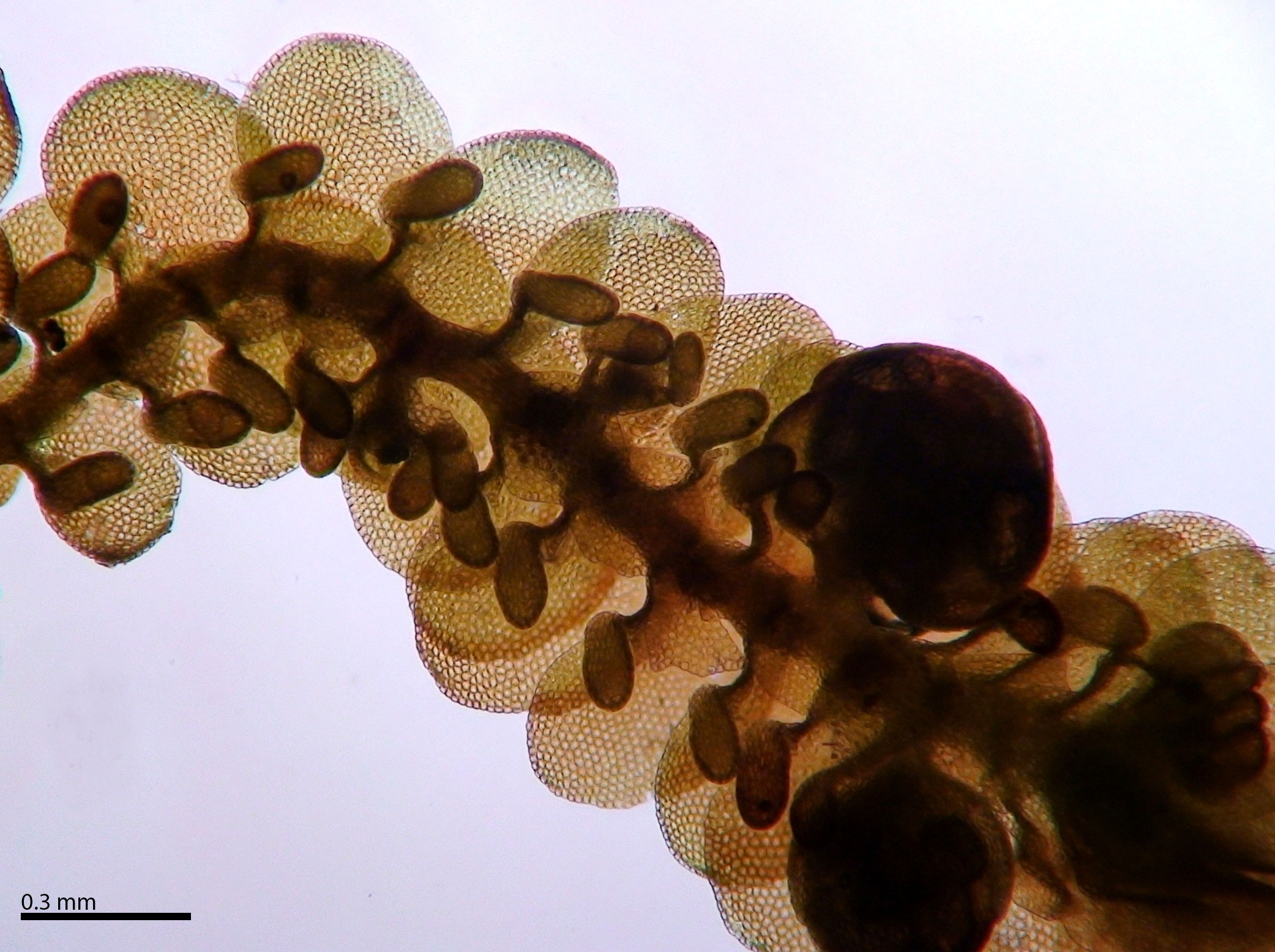 Shoot width: to 1-1.5 mm. Color: light brownish. Cell walls in leaf lobe: with intermediate thickenings. Dorsal lobe insertion: truncate. Lobules: always inflated, longer than wide, angled away from the stem and notably distant to the stem.