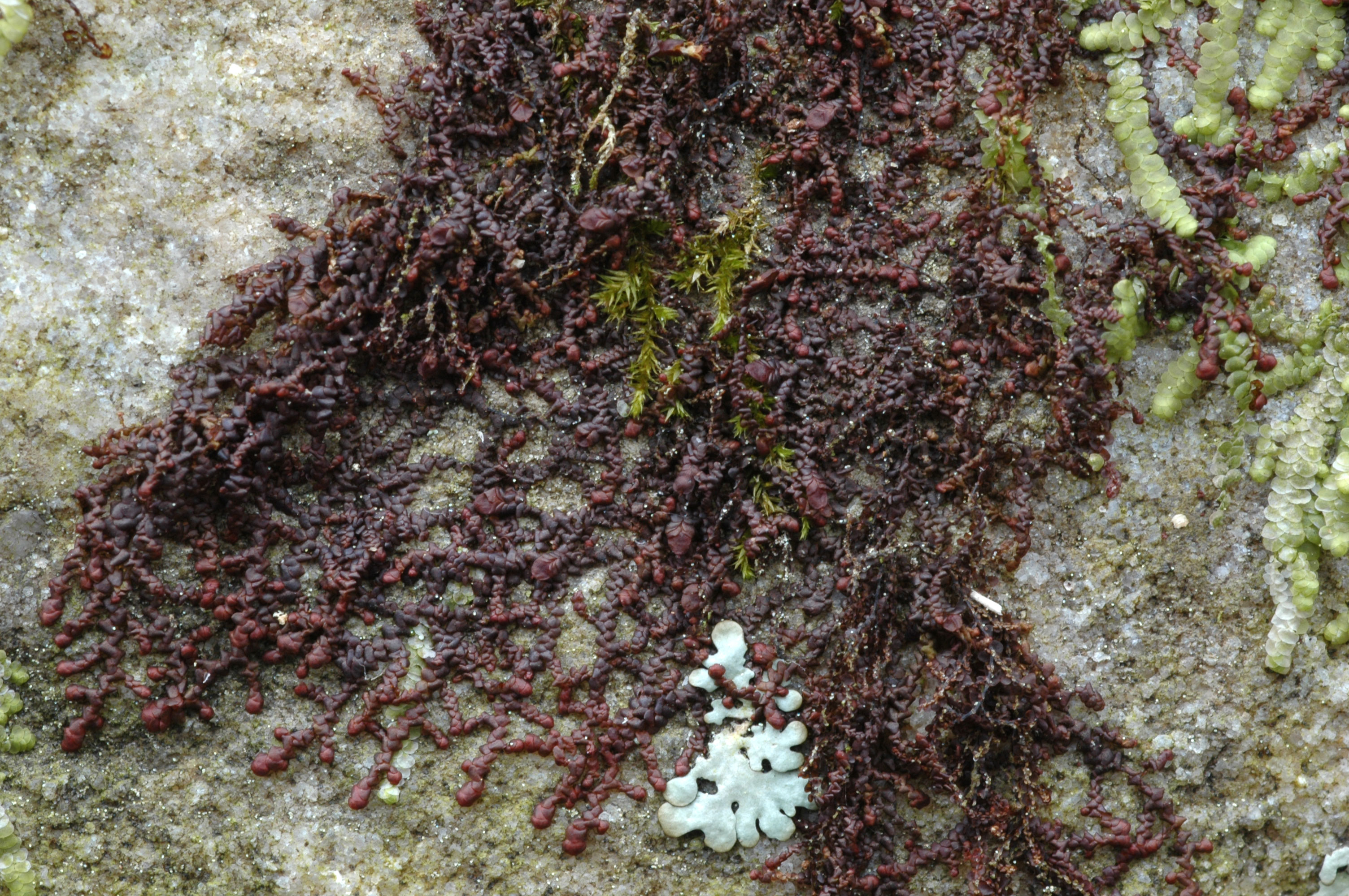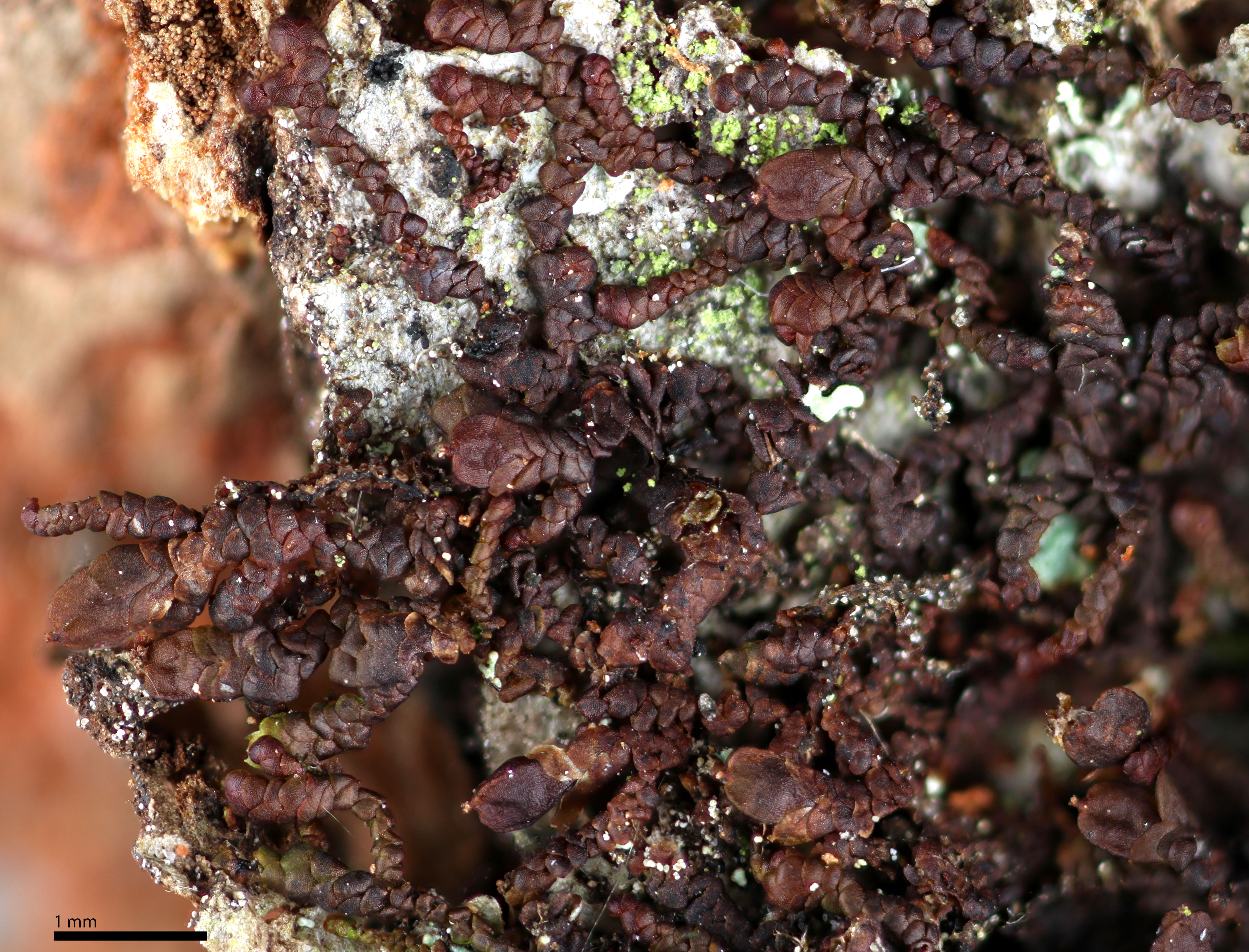 Shoot width: <1 mm. Color: reddish to nearly black. Cell walls in leaf lobe: without intermediate thickenings. Dorsal lobe insertion: slightly cordate. Lobules: longer than wide.