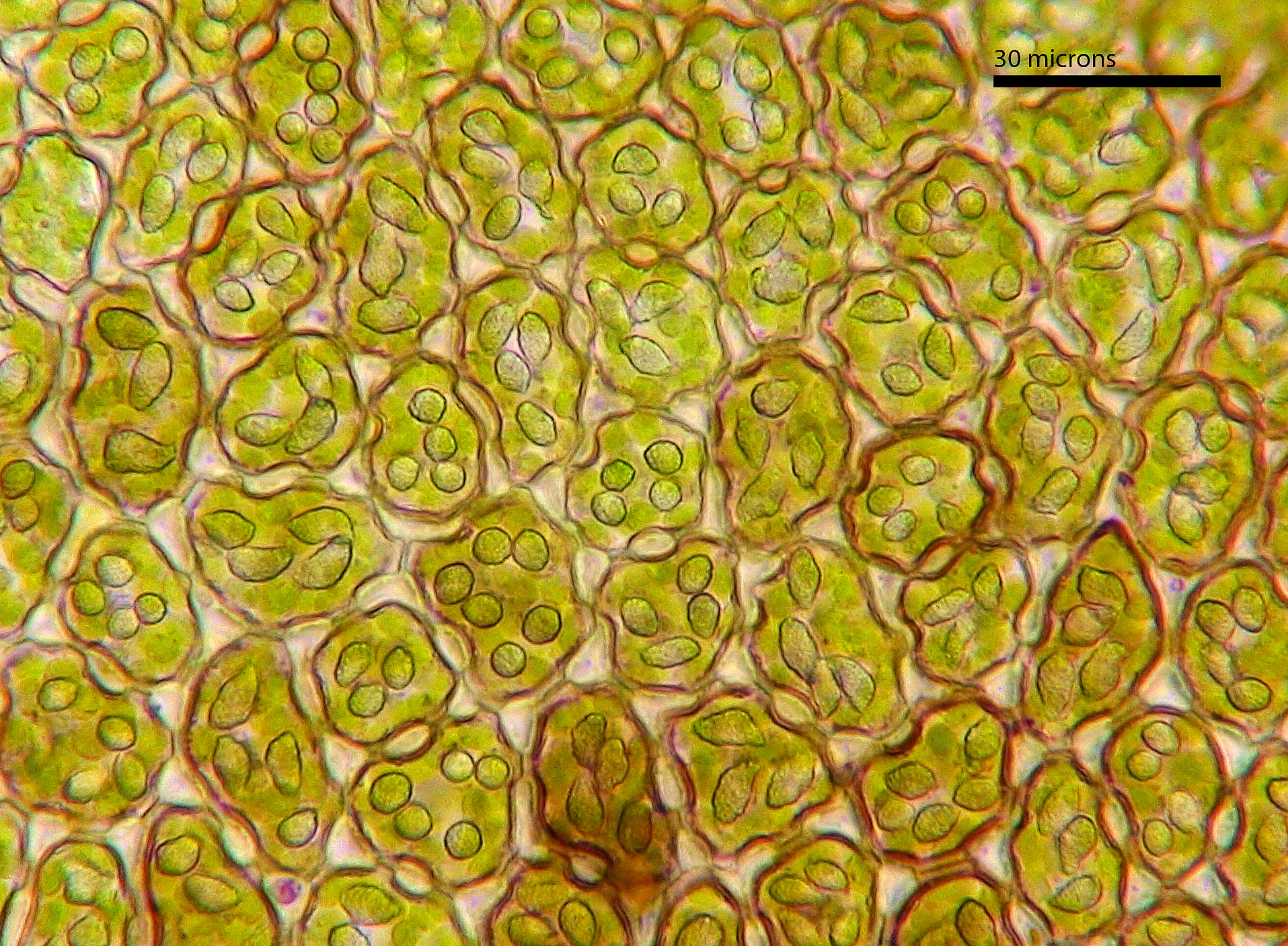 Shoot width: to just over 1 mm wide. Color: predominantly green. Cell walls in leaf lobe: with intermediate thickenings. Dorsal lobe insertion: cordate. Lobules: inflated lobules about as wide as long.