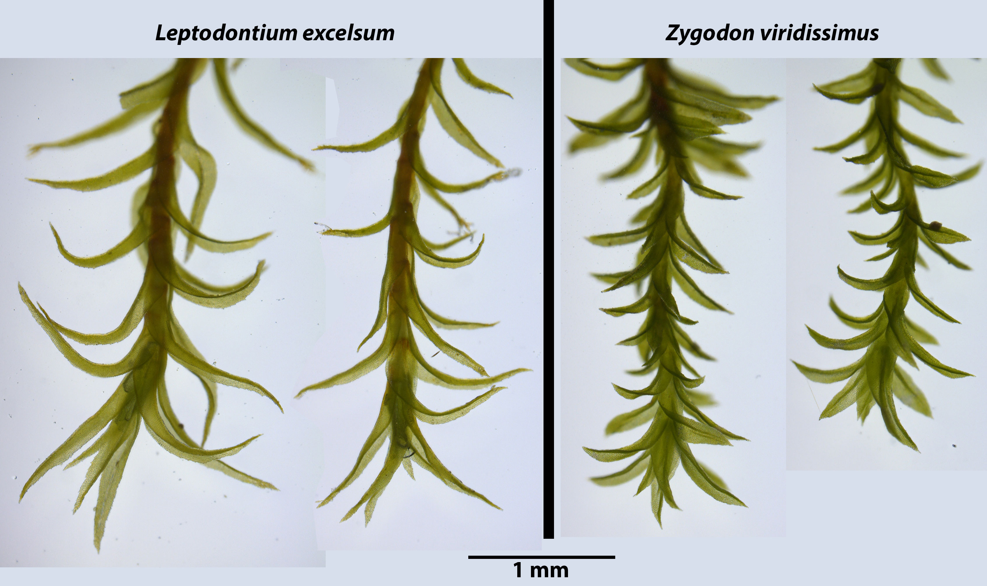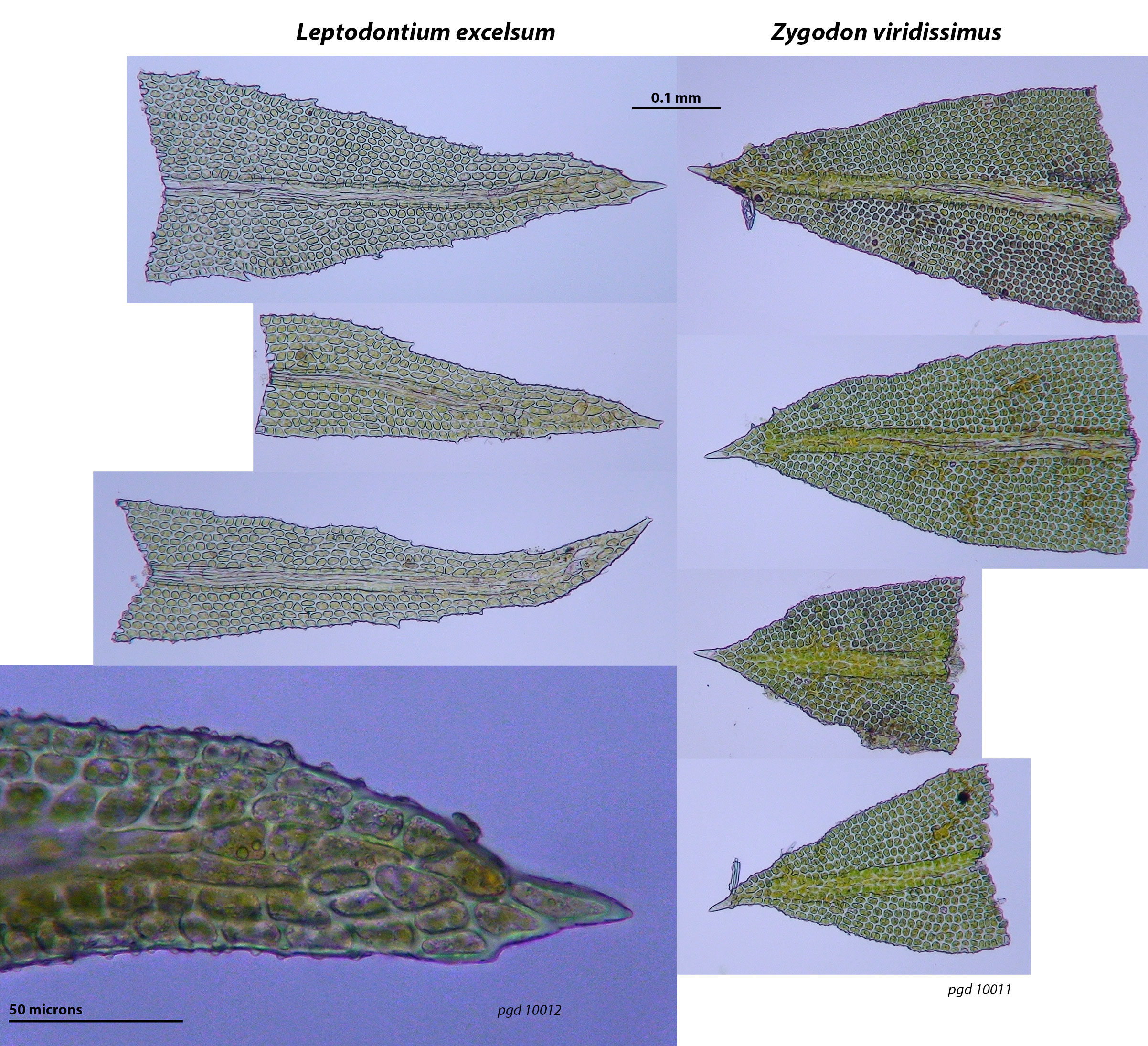Leptodontium viticulosoides can be reliably identified in the field. It is most likely to be confused with co-occurring Zygodon viridissimus which differs in having more closely spaced leaves with leaf margins entire or rarely with an isolated tooth. Zygodon viridissimus typically forms small cushions consisting of closely spaced shoots with closely spaced leaves as compared to the loose tufts of elongated shoots with distant leaves characteristic of Leptodontium excelsum.