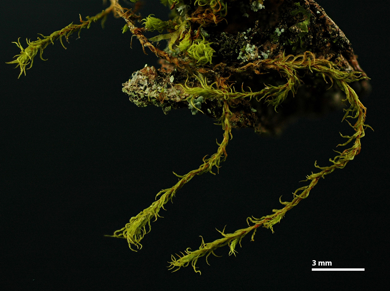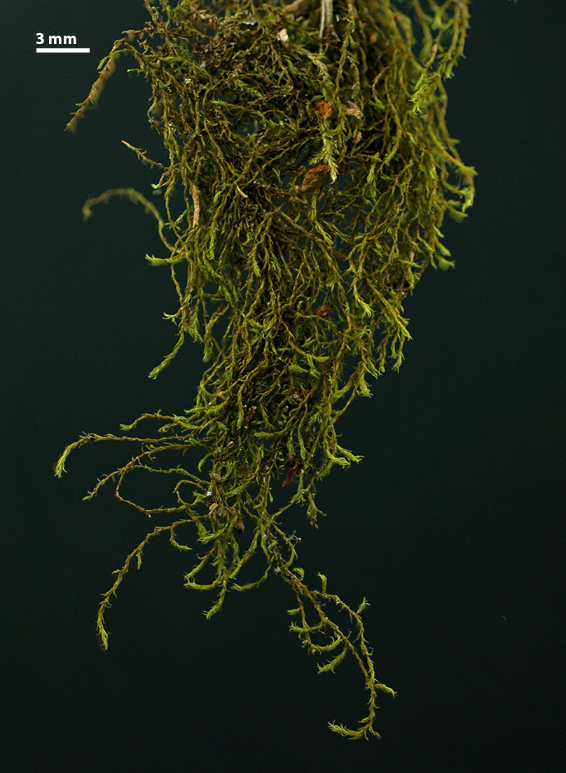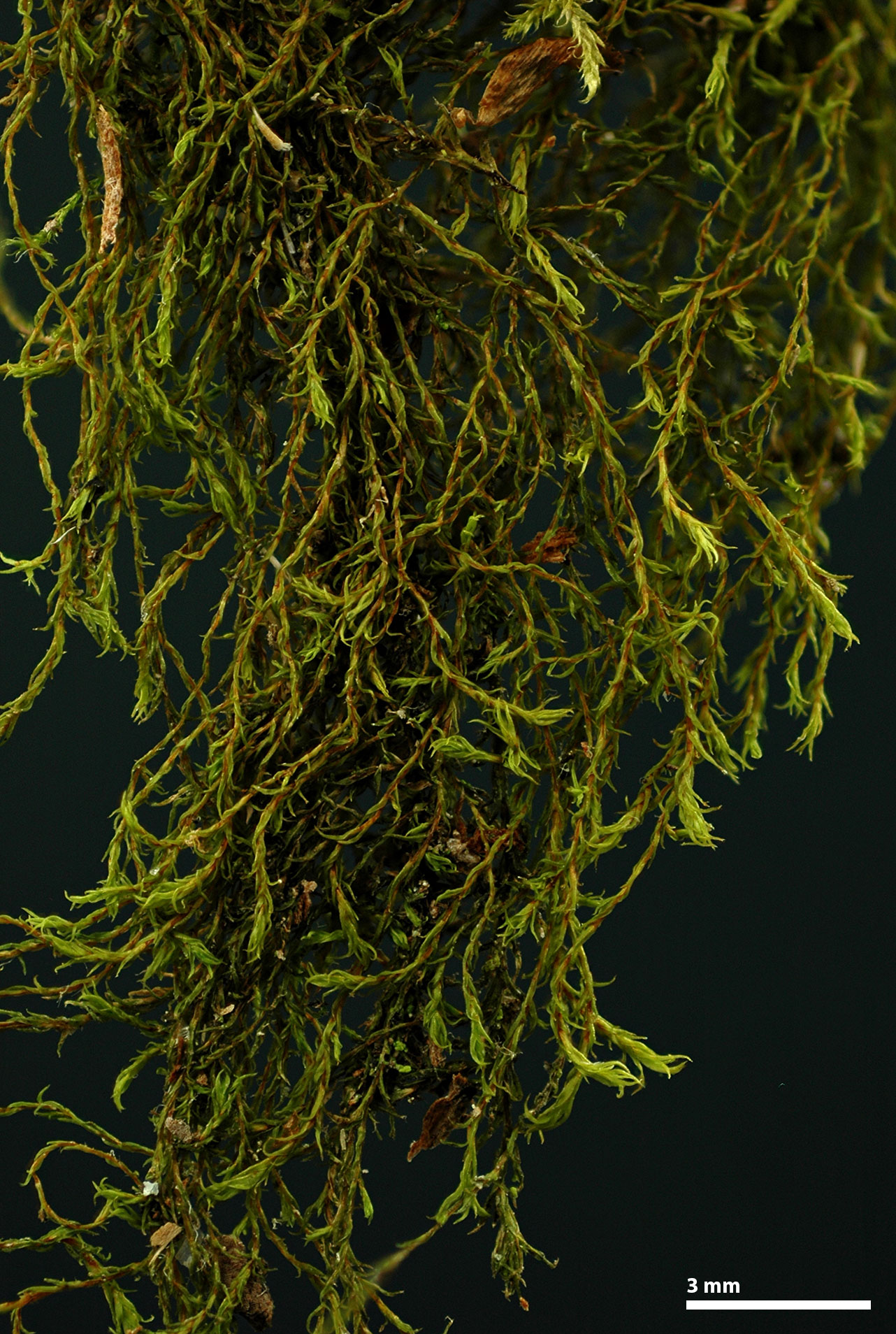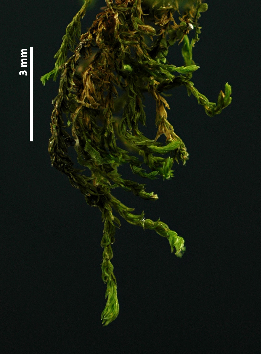 Shoots slender, flexuose, up to 7 cm long, usually yellow green occurring as isolated strands or forming large, loose tufts, often pendent. Leaves typically widely spreading, rather distant, long-lanceolate, apex narrowly acute, decurrent at base, costa extending to the leaf apex. Leaf margin coarsely serrate in the upper half of the leaf, recurved below. Leaf cells pluripapillose. Occasional leaves with rhizoids growing from leaf apices.