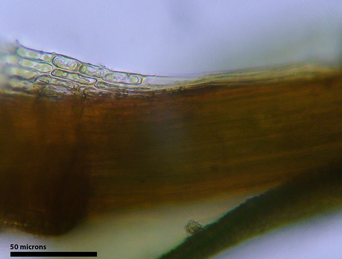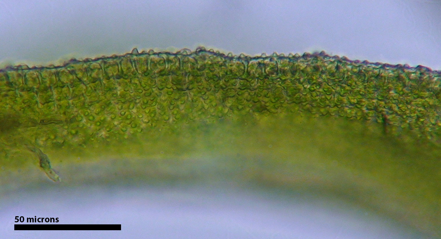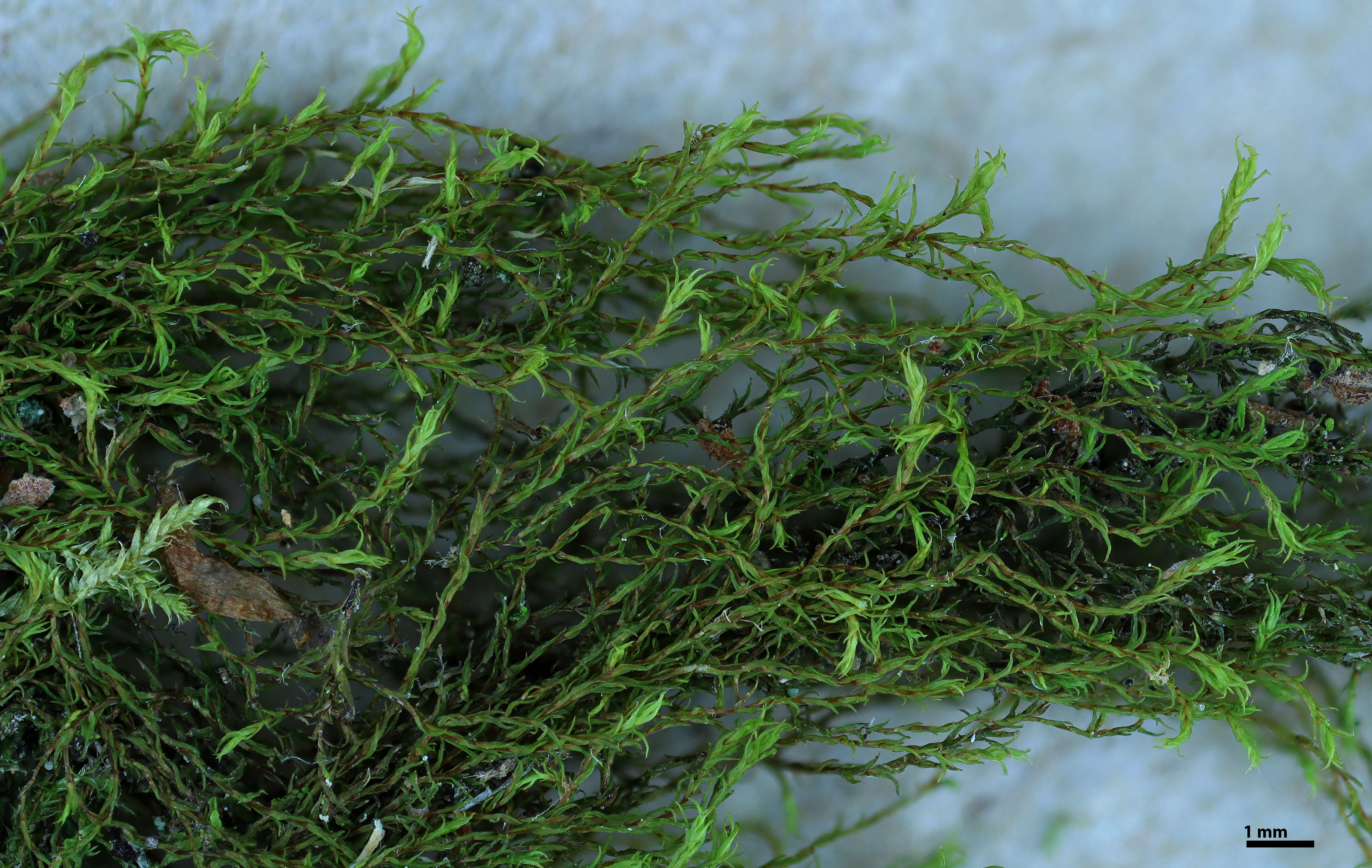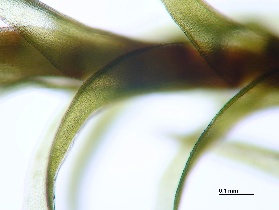 Shoots slender, flexuose, up to 7 cm long, usually yellow green occurring as isolated strands or forming large, loose tufts, often pendent. Leaves typically widely spreading, rather distant, long-lanceolate, apex narrowly acute, decurrent at base, costa extending to the leaf apex. Leaf margin coarsely serrate in the upper half of the leaf, recurved below. Leaf cells pluripapillose. Occasional leaves with rhizoids growing from leaf apices.