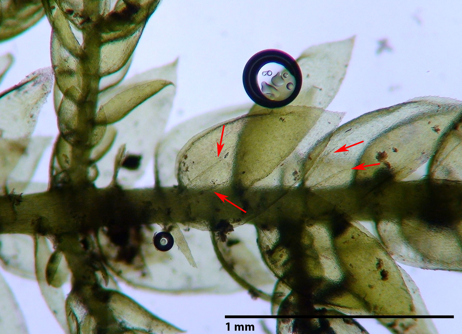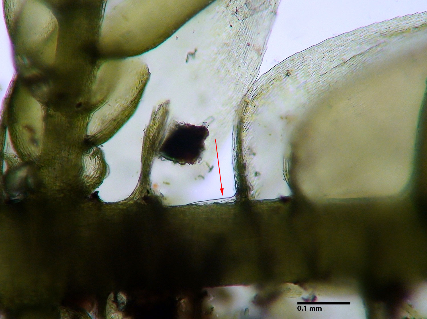 Leaf tips in the left column from larger leaves of robust stem sectors; right column from flagelliform sectors. In confirming the identification of this collection, Bill Buck (NY) commented (e-mail, October 2018), "Note the fairly prominent prorulose cells and how the leaf apex is often a pair of cells rather than just a single cell." Prorulose cells are shown in the next photograph.