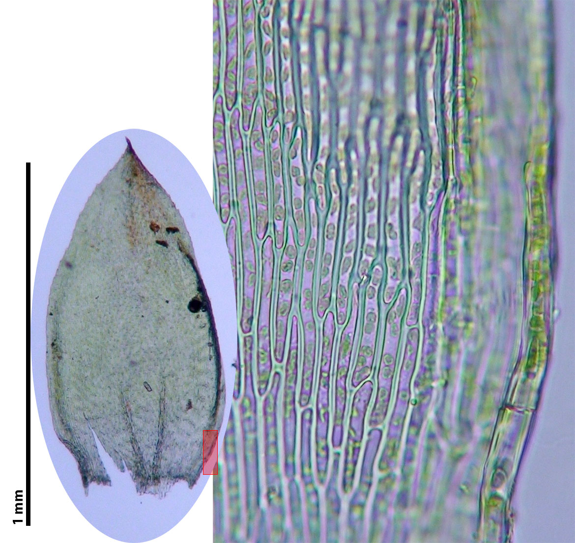 Leaf apices (left) showing thick-walled leaf cells; outer corner of leaf base (right) showing alar cells and leaf decurrency. Alar cells tend to be more numerous in P. filiforme than in L. sharpii.