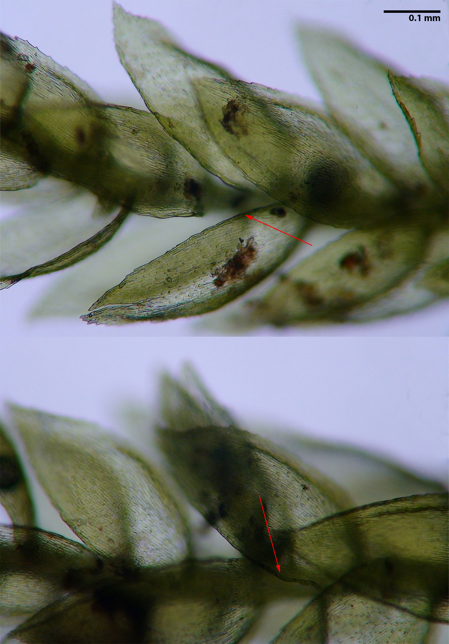 Alar cells are small, quadrate and inconspicuous. The leaf bases in the left column were taken from robust shoot sectors (notice the discoloration); leaf bases in the right column were taken from flagelliform sectors of the same specimen.