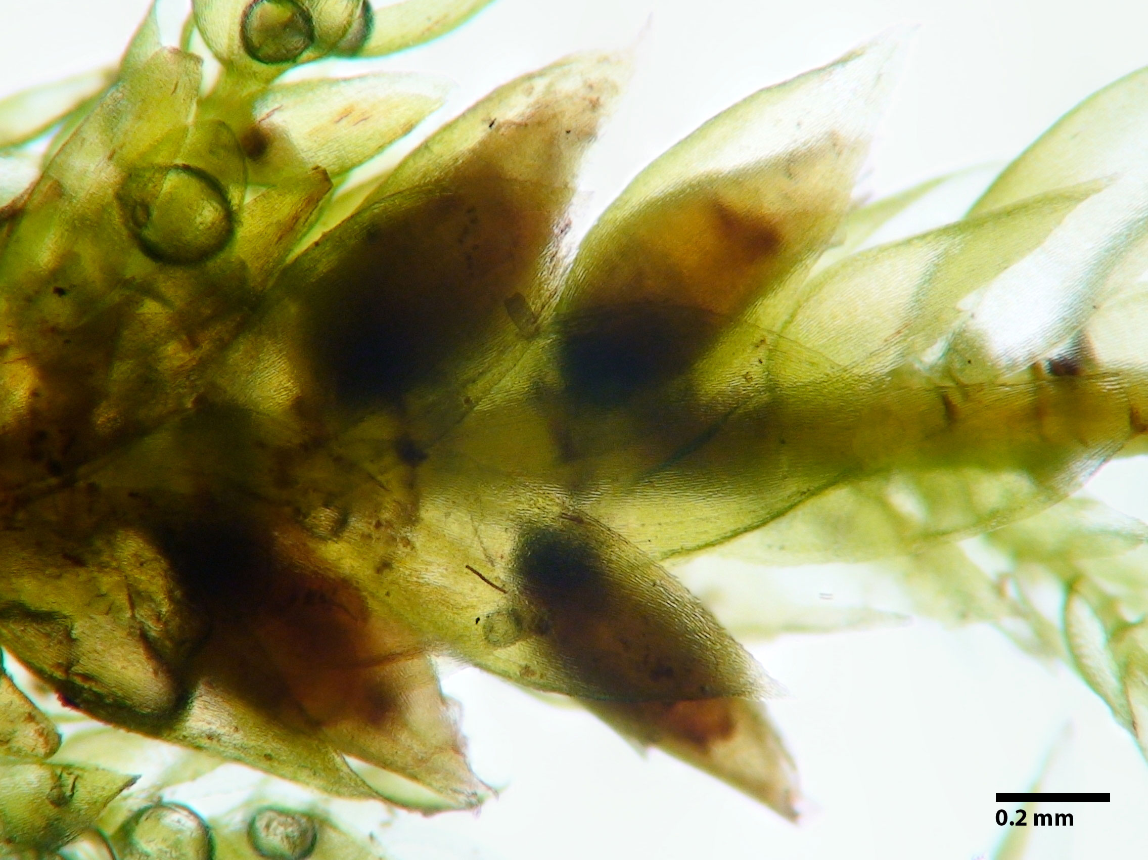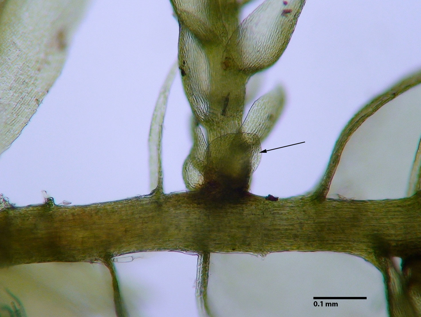 "Small, slender plants in flat, shiny, bright-green, yellow-green, or yellow-brown mats, creeping, freely and irregularly branched, scarcely recognizable in the field. Stems creeping or curved-ascending; branches straight, horizontal, slender and often nearly filiform; pseudoparaphyllia and brood branches none. Stem leaves erect, not particularly crowded, 0.5-1.0 mm long, moderately concave, oblong-ovate or oblong-lanceolate, sharply or bluntly acute; costae often 1/4 - 1/2 the leaf length; cells oblong-linear, somewhat flexuose, not thick-walled, finely prorulose at back; subquadrate alar cells few and inconspicuous. Branch leaves similar, small, 0.25-0.5 mm long. Inflorescences and sporophytes unknown." Quoted text from Anderson (1996). In addition, leaf margins are serrulate especially towards the leaf apex and narrowly recurved towards the leaf base; leaves are narrowly decurrent.