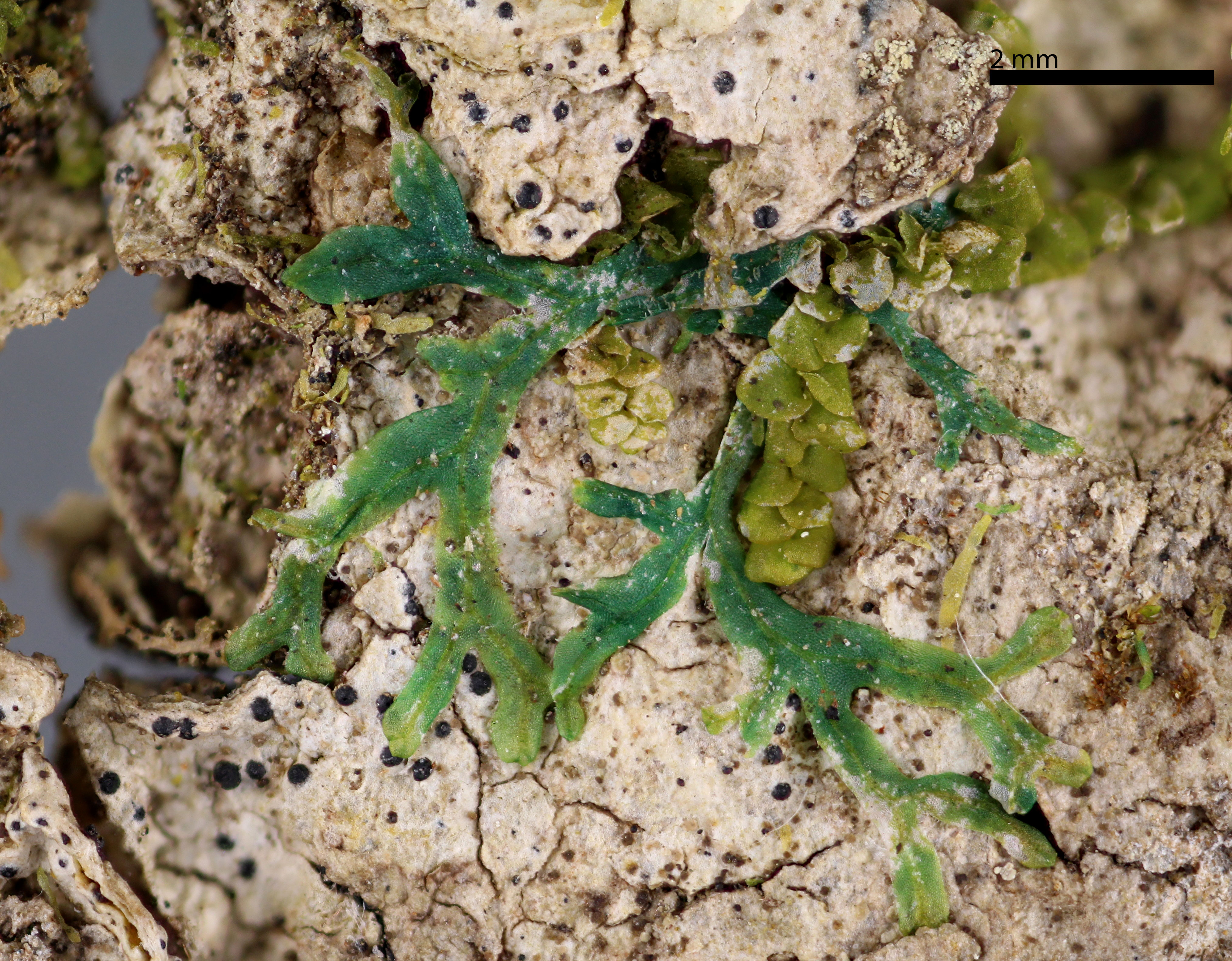 Plants yellow-green, ribbon-like, furcately branched, thalli up to ca. 1.5 mm wide forming thin mats. Thalli costate with hairs mostly limited to thallus margins and the ventral side of the costa. Plants producing erect, ascending, attenuate branches bearing gemmae near the branch apex, gemmae originate from the laminal margins of attenuate branches and from the dorsal and ventral surfaces of the costa of attenuate branches. Costa of attenuate branches with 3-4 rows of epidermal cells on both the dorsal and ventral sides. Plants usually developing a blue coloration in all or part of the thallus after preservation by drying.