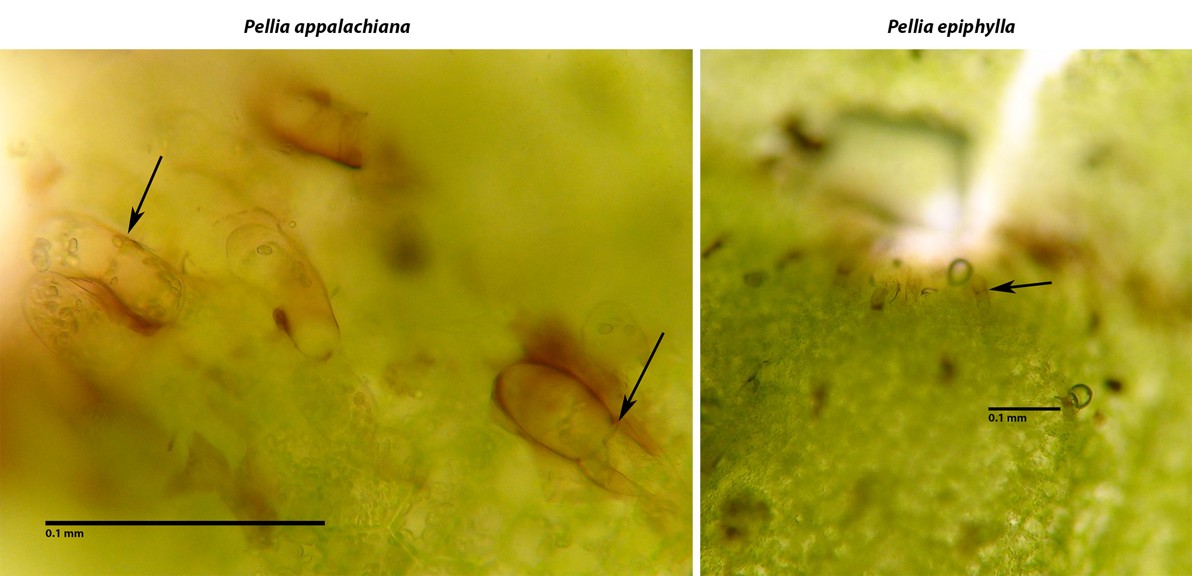 There may be distinctions in cell size between our southeastern species of Pellia, but the potential for size overlap and atypical dimensions when growing under particularly wet conditions, makes cell size less than an ideal marker. In plants found growing together, the cells of P. appalachiana are clearly larger than those of P. epiphylla.