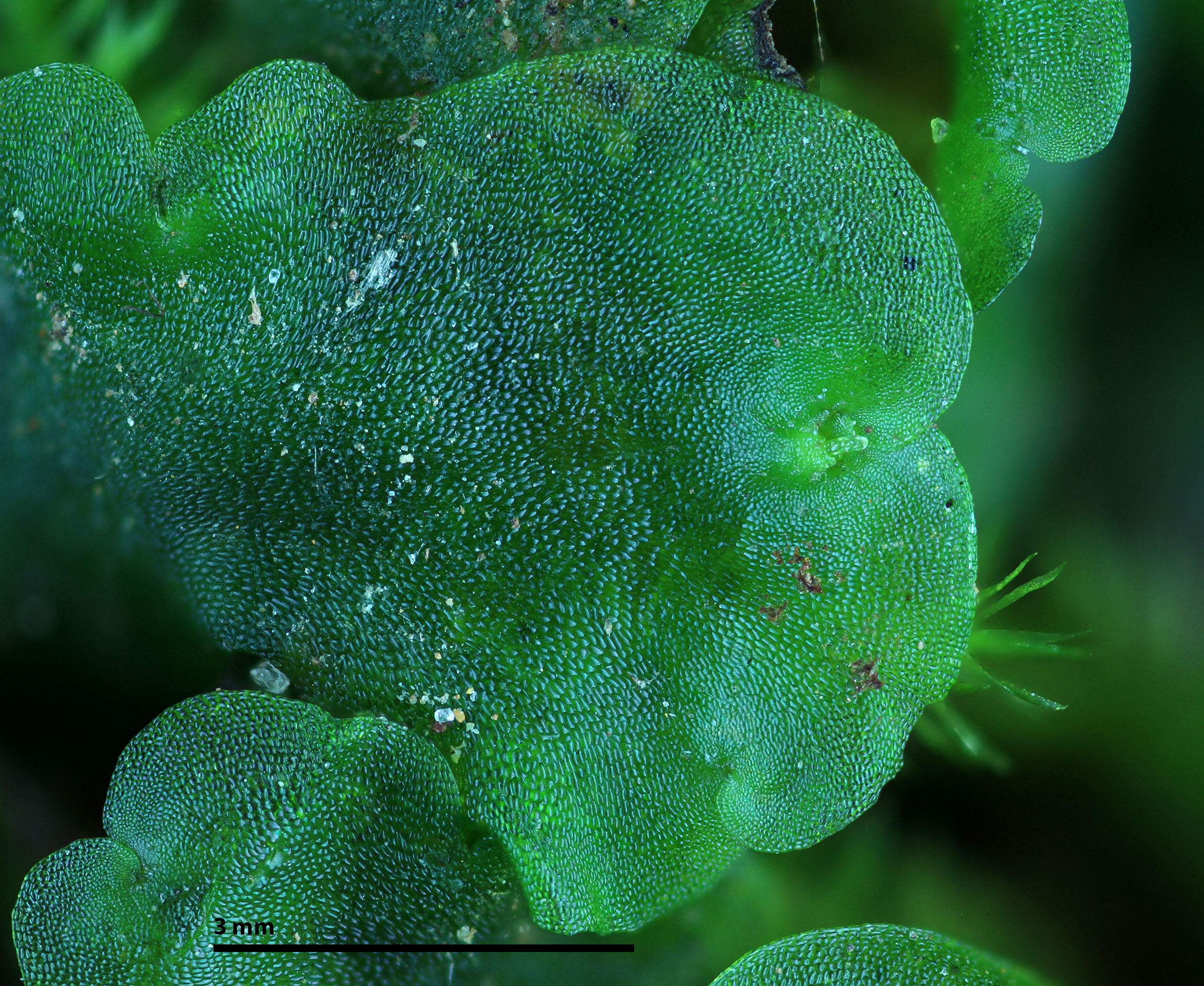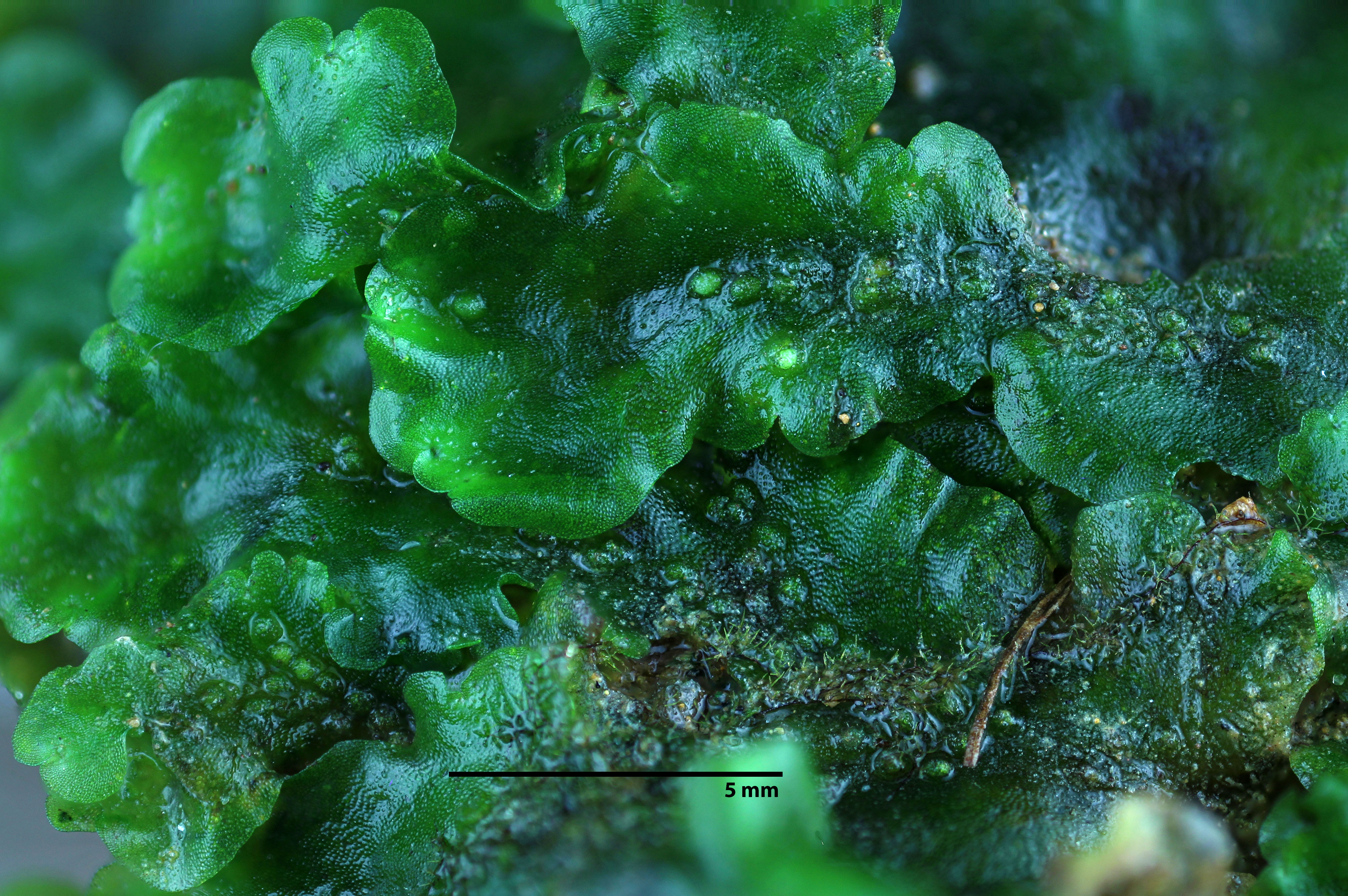 Antheridial pustules are rather subtle in this mat found growing in a shaded, protected rock shelter.