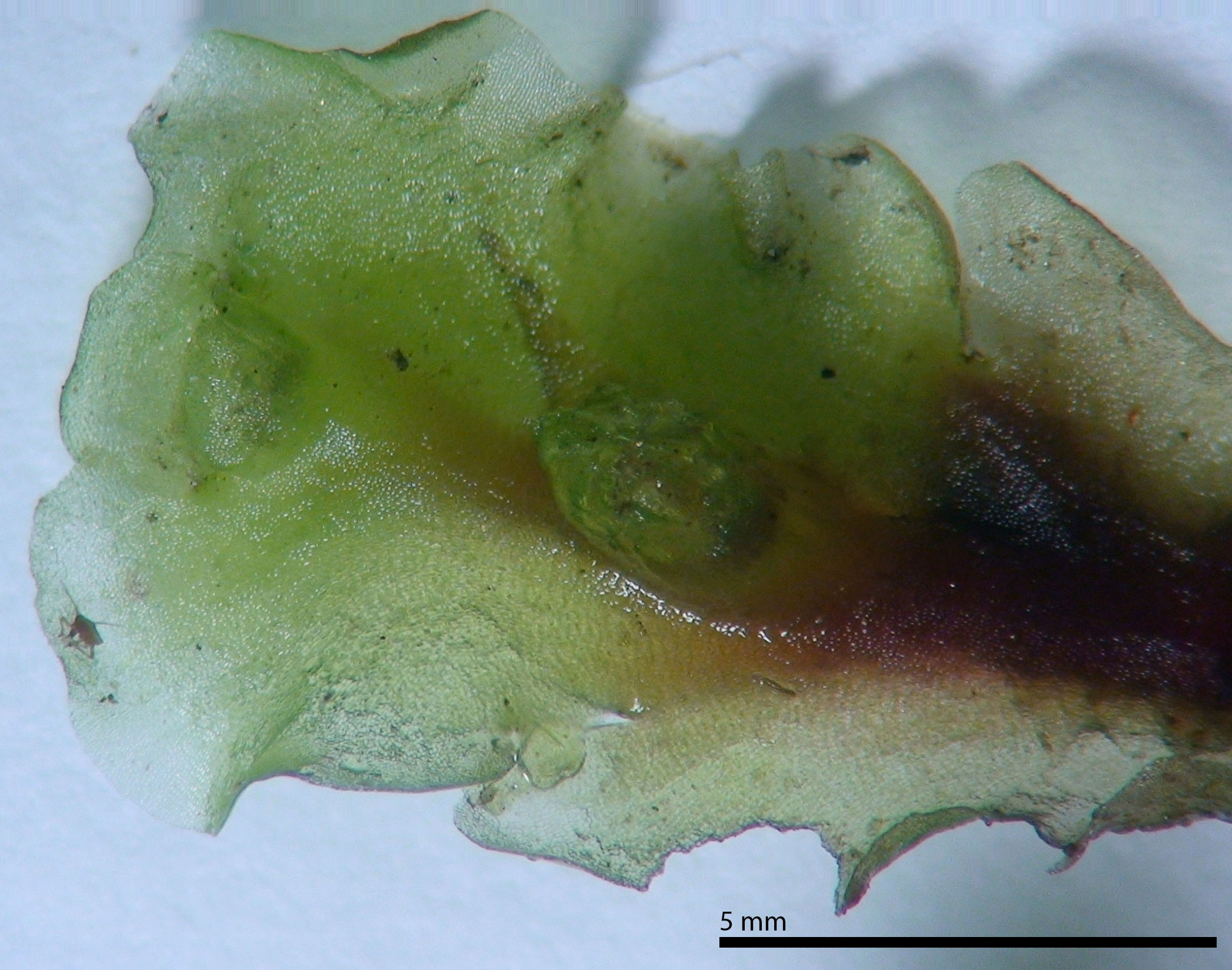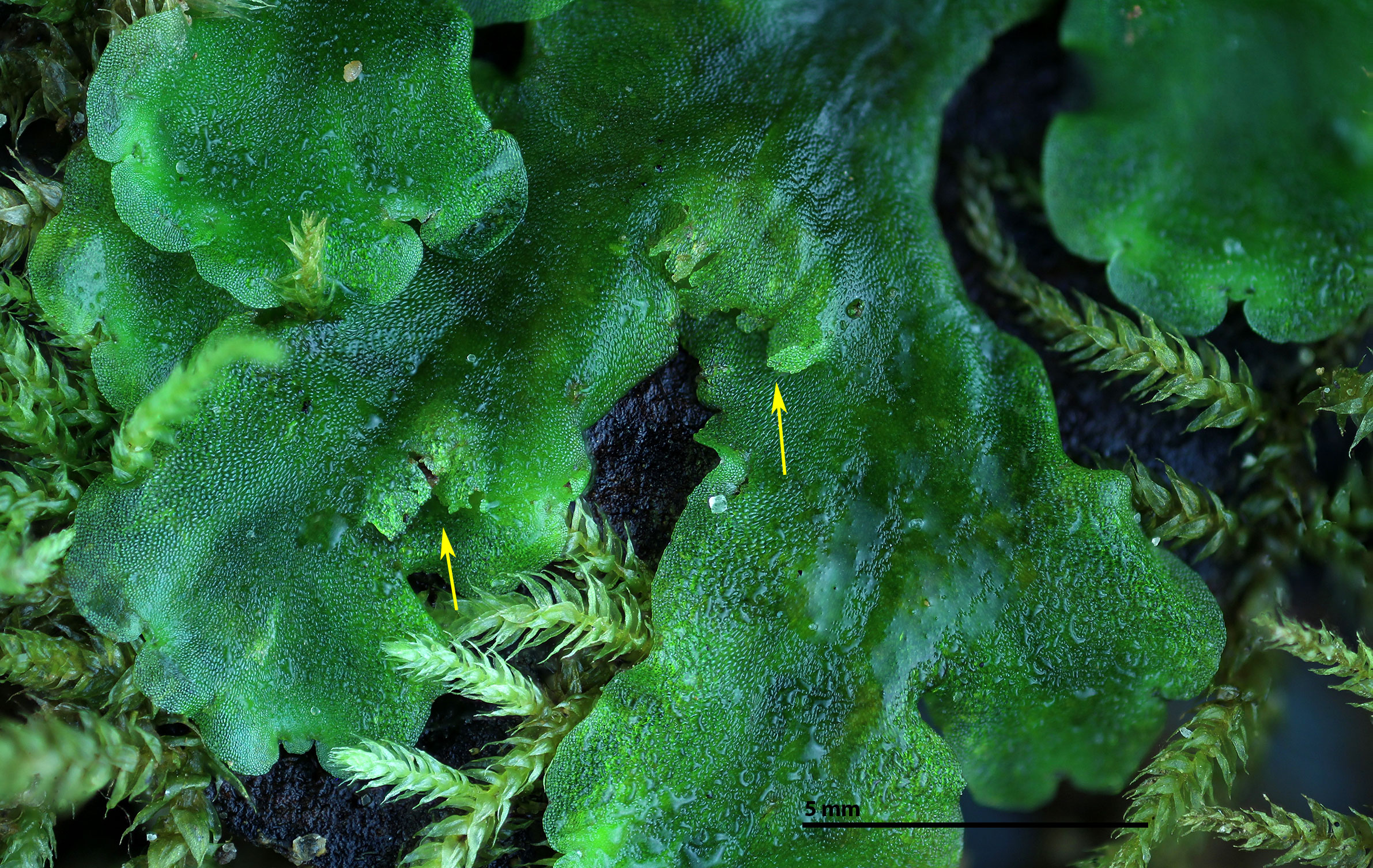 The costa of the thallus is more sharply demarcated than in Pellia and a narrow central strand within the costa is easily seen with transmitted light (central strand just visible at the two most left arrows).