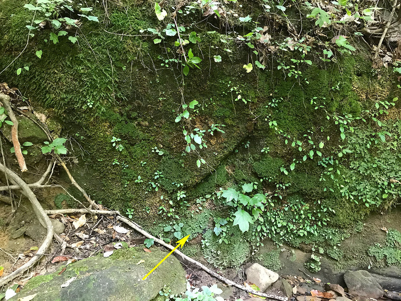 On the vertical face of a creekside rock and on rocky soil on the edge of the creek bank