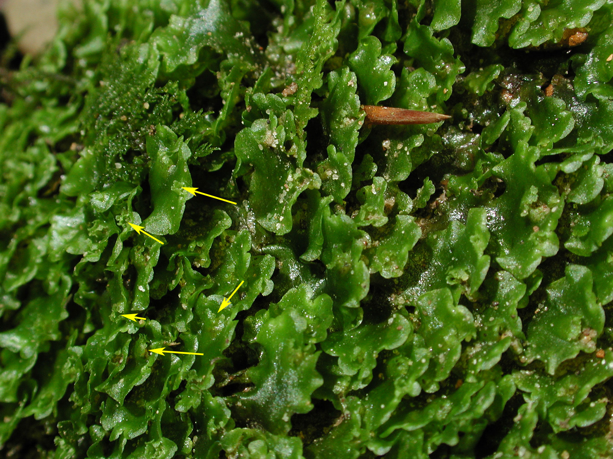 The yellow arrows indicate female involucres; the rosette growth on bare soil suggests this mat originated from very few spores.