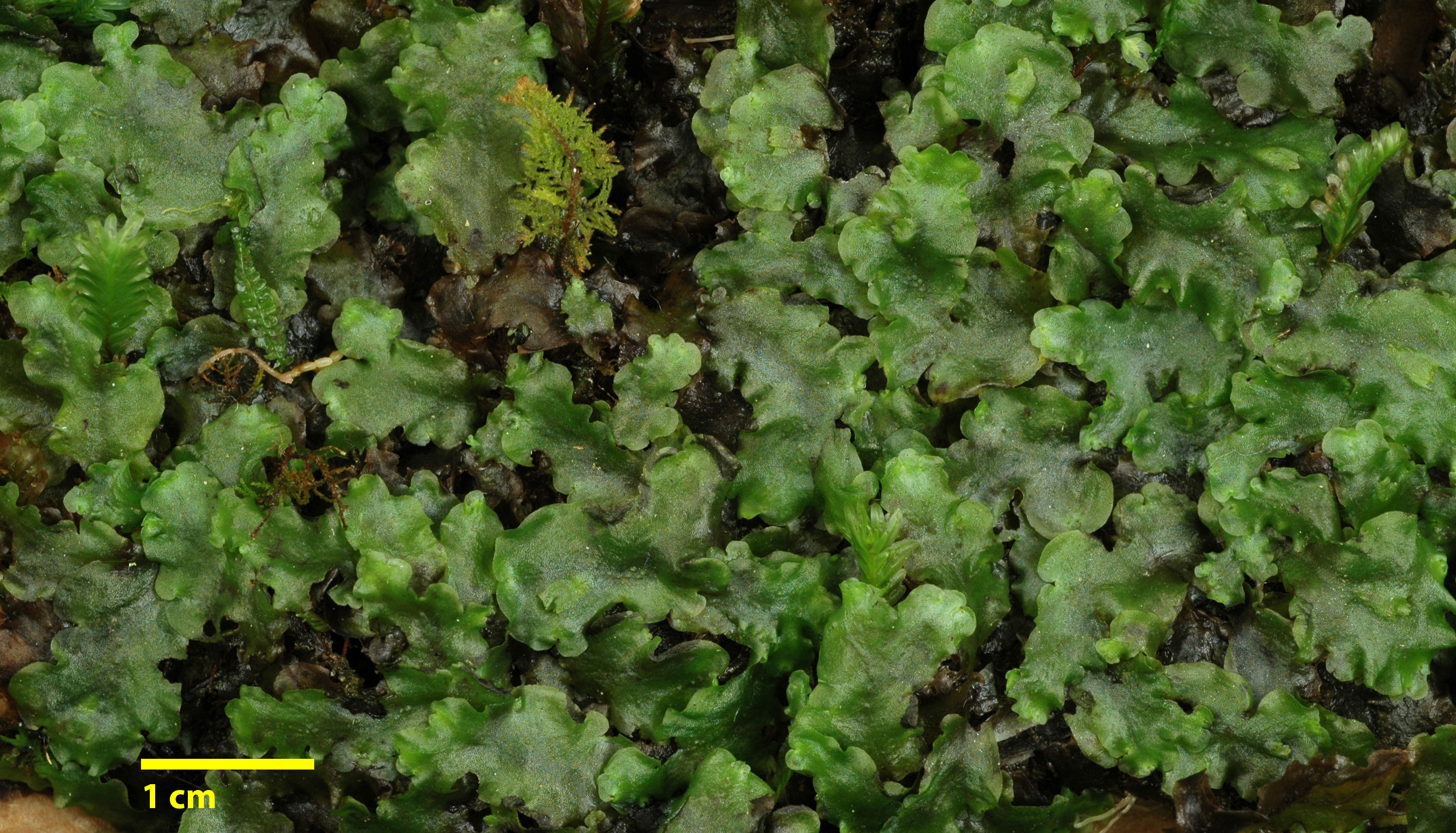 Occurring with Pallavicinia lyellii (notice the narrow central strand running through the thallus costa), Pellia epiphylla somewhat duller with slightly smaller cells, and the leafy liverwort Nardia lescurii.