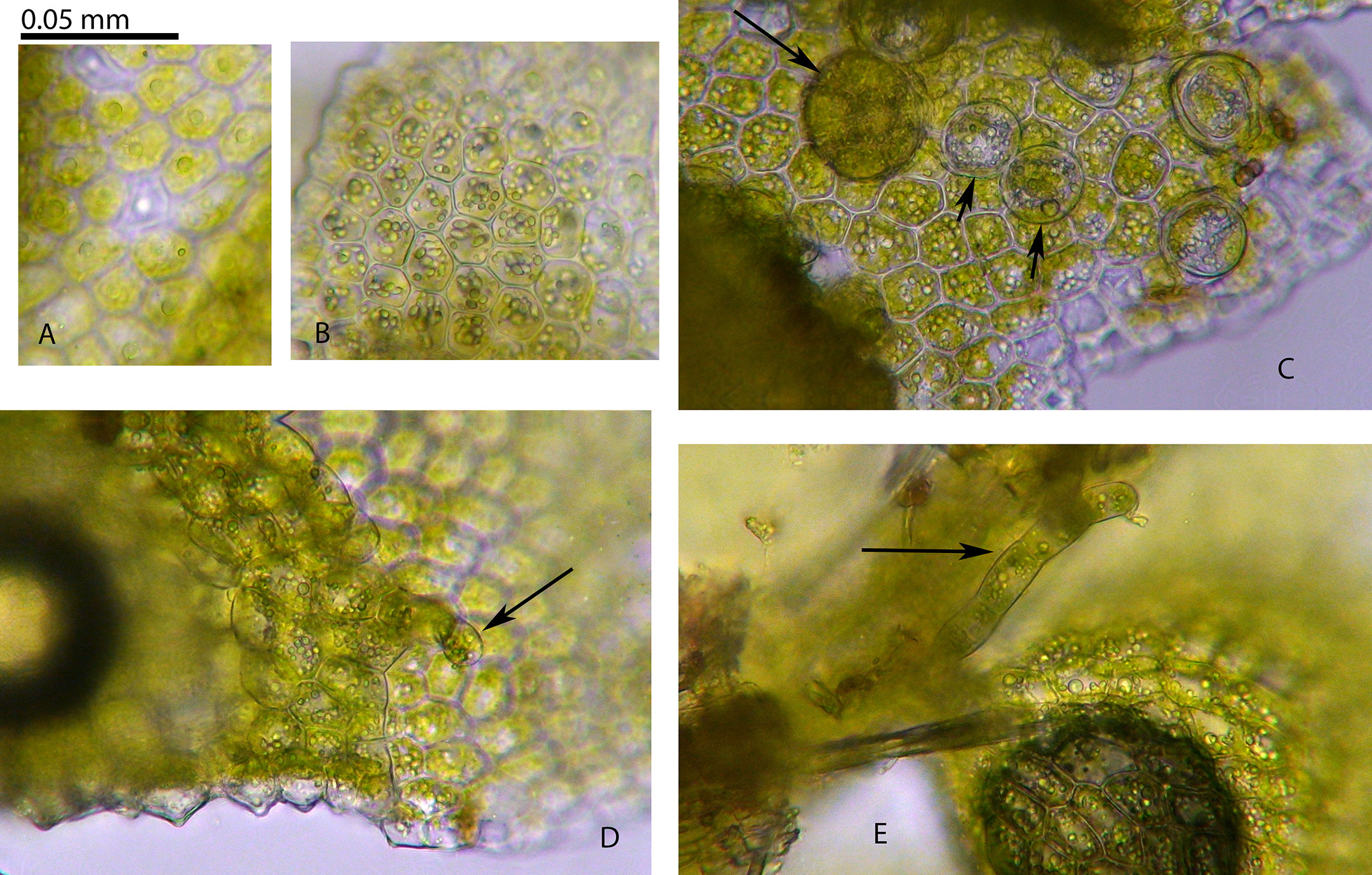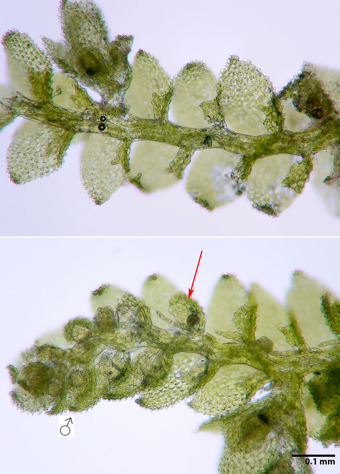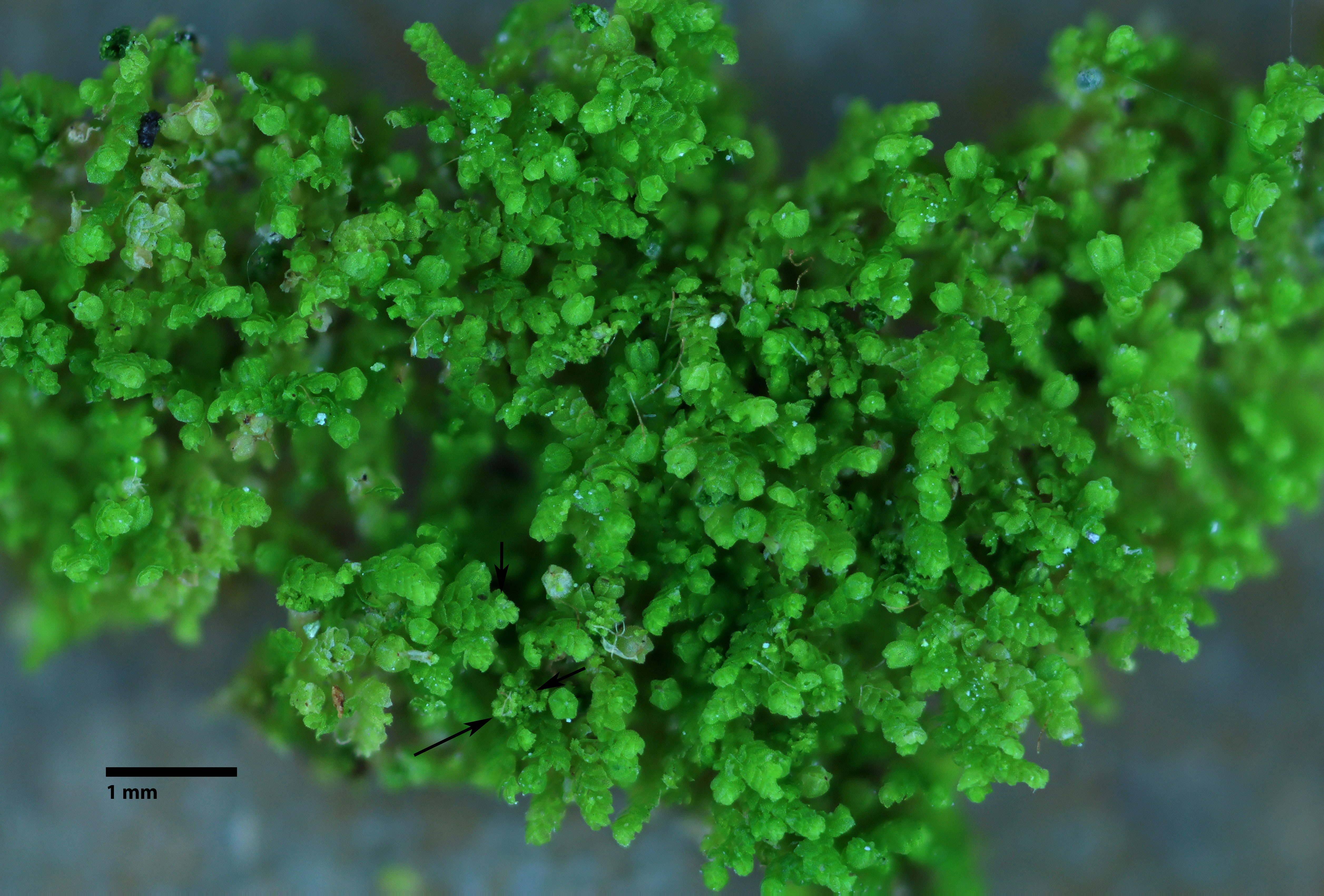 Occurring as isolated shoots over other bryophytes or forming thin mats over calcareous rock; individual shoots <0.5 mm wide; leaves complicate-bilobed with prominent styli (a stylus is a narrow appendage between the leaf lobule and the stem); underleaves absent. Outer surface of leaves and perianths papillose, each cell bearing a single, large papilla.