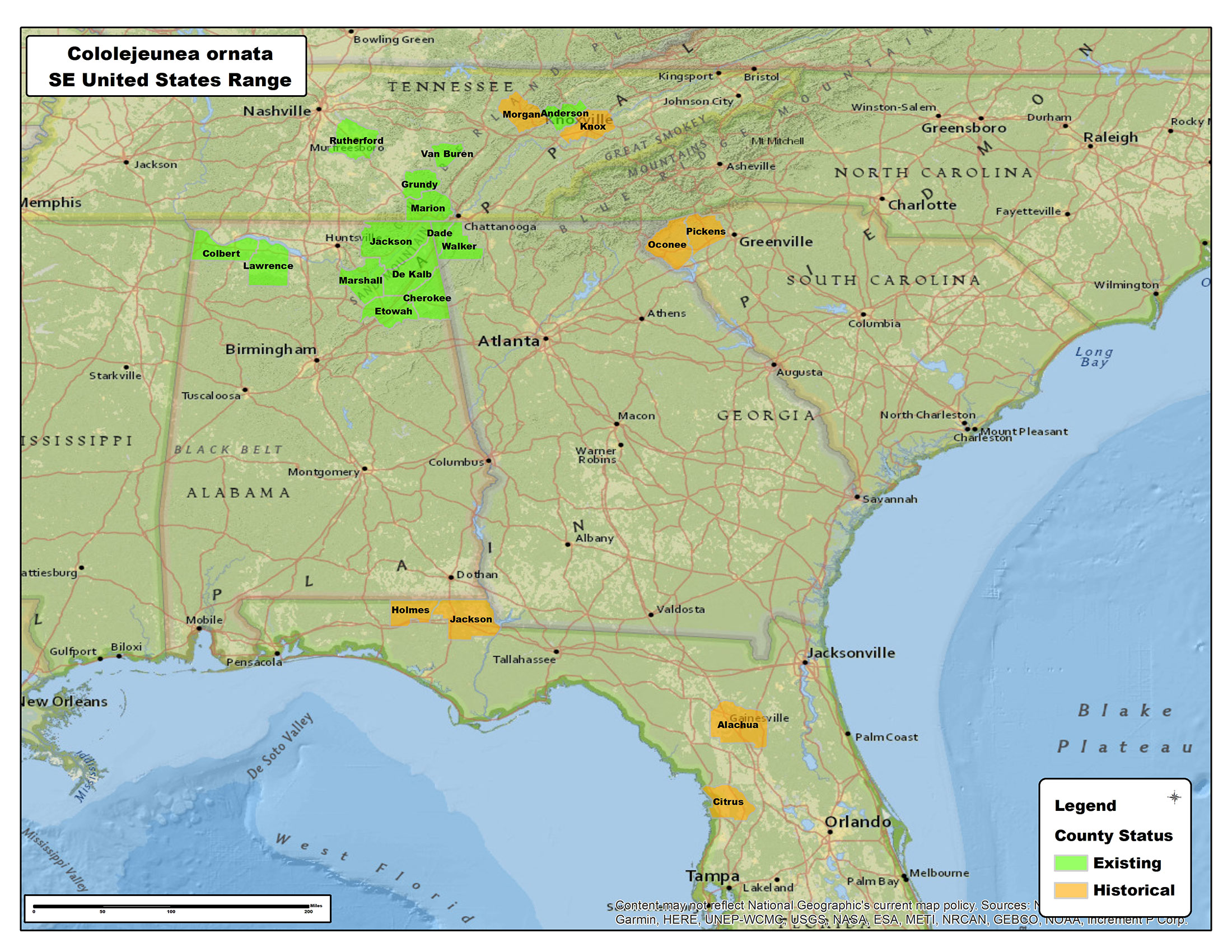 Known from a few locations in the Blue Rdige (more widespread elsewhere in the Southeastern U.S.): e.g. "weakly calcarious boulders," Eastatoe River gorge, Pickens County, South Carolina; occurring with Cololejeunea biddlecomiae & Porella japonica subsp. appalachiana (Schuster 1980), ca. 1400 ft. elevation.