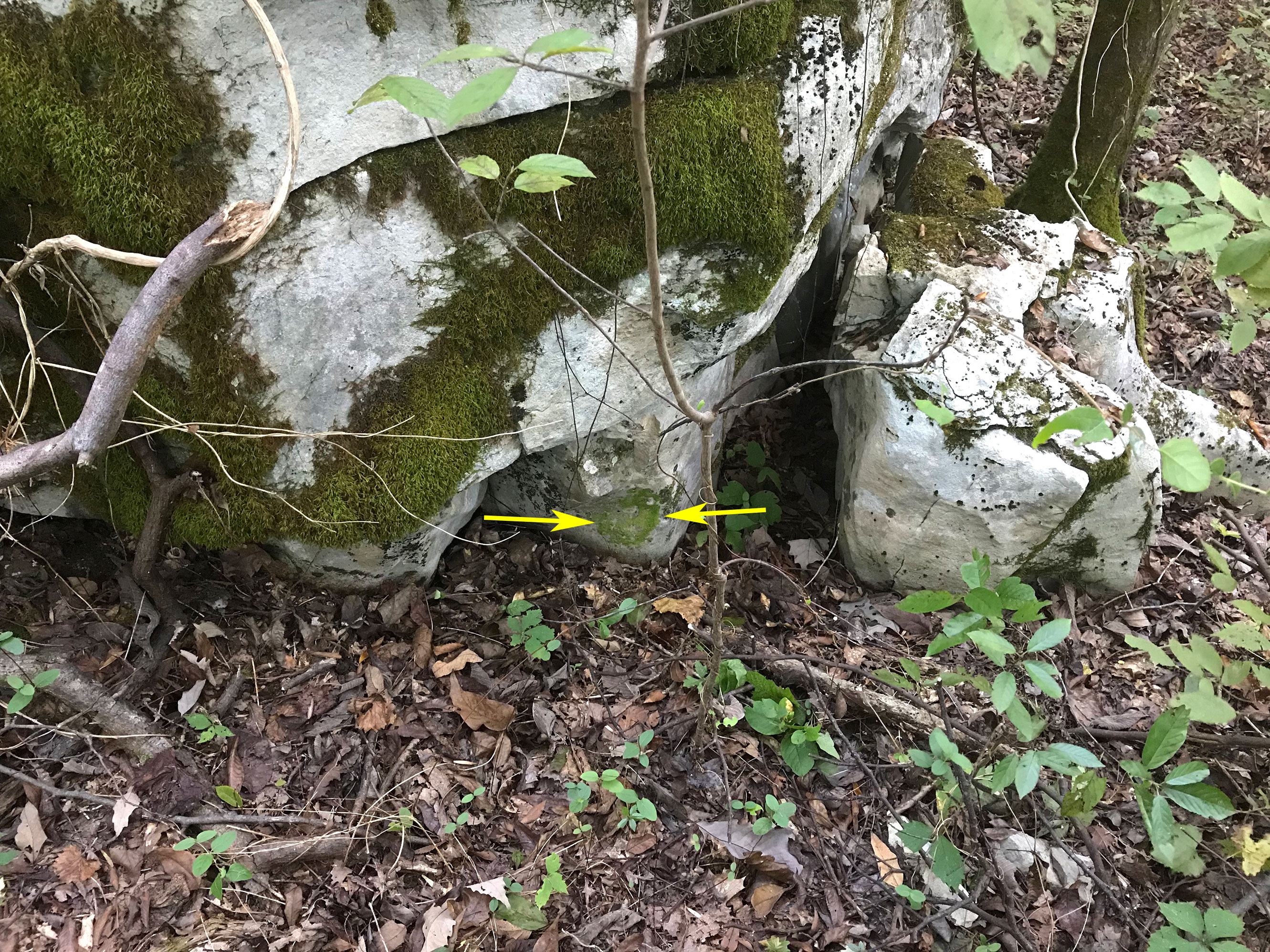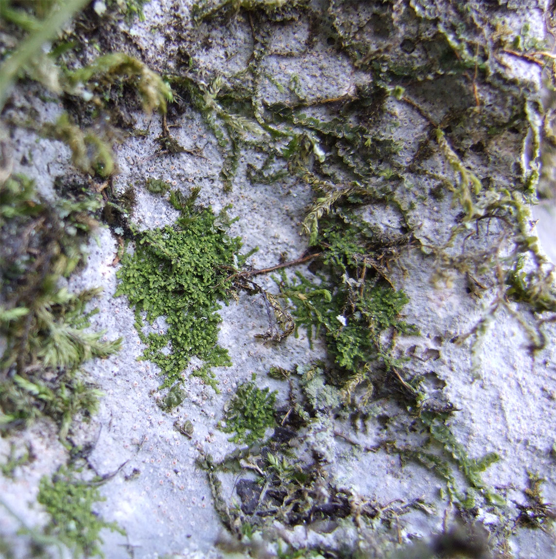 In the Southeastern U.S., the species appears confined to calcareous rock, occurring either directly on the rock or upon other bryophytes (mosses, leafy and thalloid liverworts) growing on rock. In China, known to occur as an epiphyll upon the leaves of vascular plants (Zhu and So 2001). An epiphyllous occurrence may yet be discovered in the U.S. (Risk et al. 2011), and in fact a specimen, M.L. Hicks 8405 DUKE, bryophyteportal, is labeled as "epiphyllous on Trichomanes petersii."