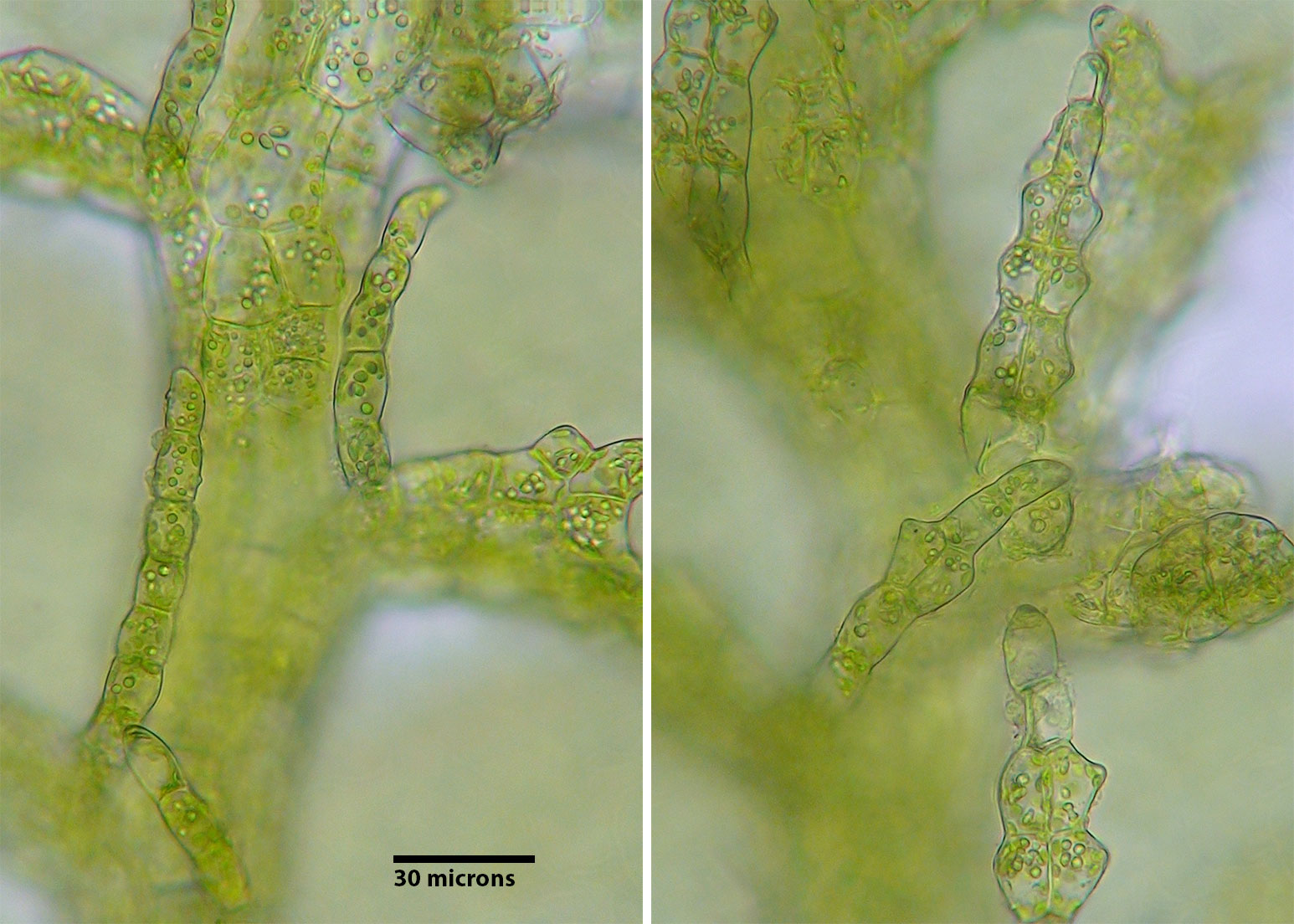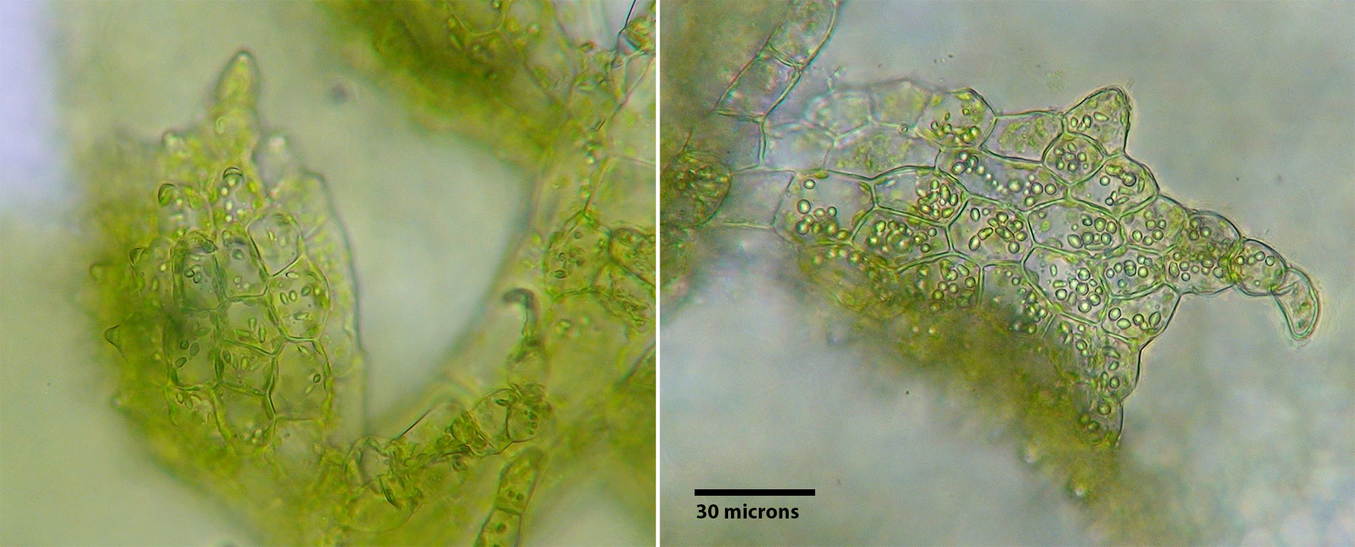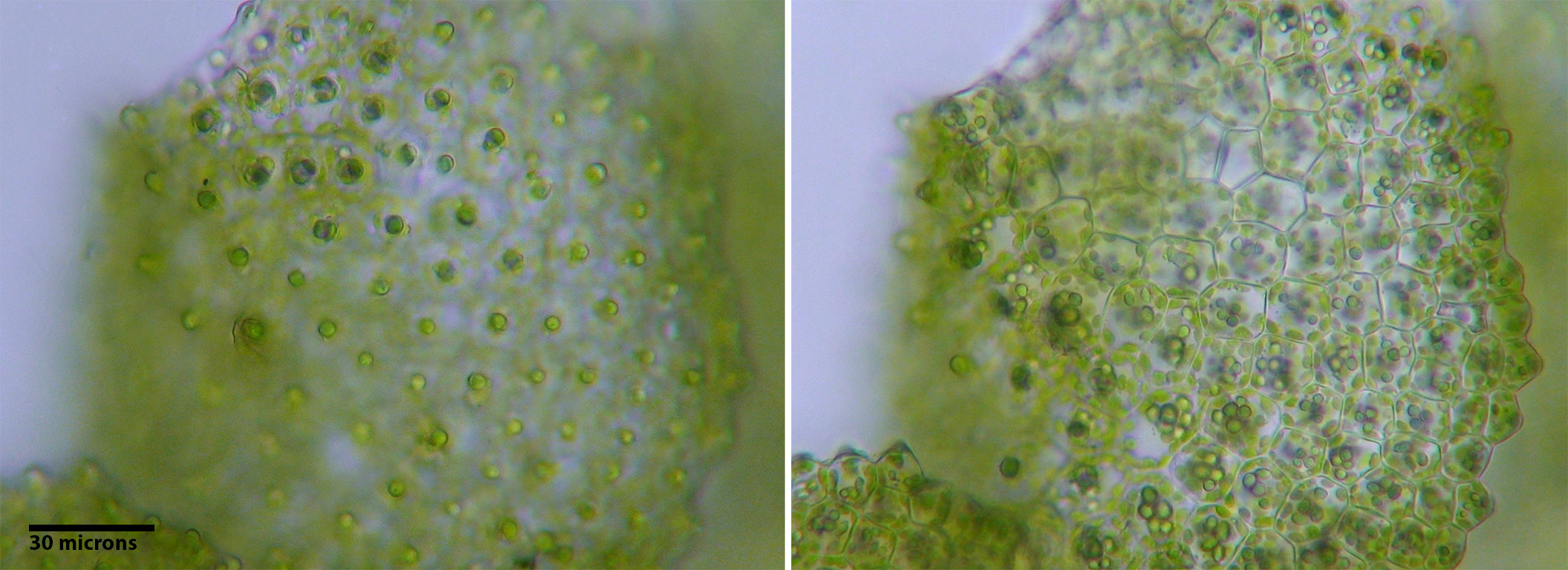 Cololejeunea is one of six genera of Lejeuneaceae known to occur in the southern Appalachians. Unlike other regional Lejeuneaceae, Cololejeunea lacks underleaves. Of the four species of Cololejeunea known to occur in the southern Appalachians only two, C. biddlecomiae & C. ornata, possess papillose cells and well developed styli. Cololejeunea biddlecomiae, a very common species, lacks the distinctive, "sharp" texture of C. ornata. This textural distinctiveness is created by the combination of ornate vestiture and narrower leaf tips. The surface topography of exposed leaves appears sharply roughened due to the taller papillae. C. biddlecomiae is a slightly larger plant with less narrow leaf tips. Collectively, these distinctions as seen with a hand lens, create a recognizable pattern.