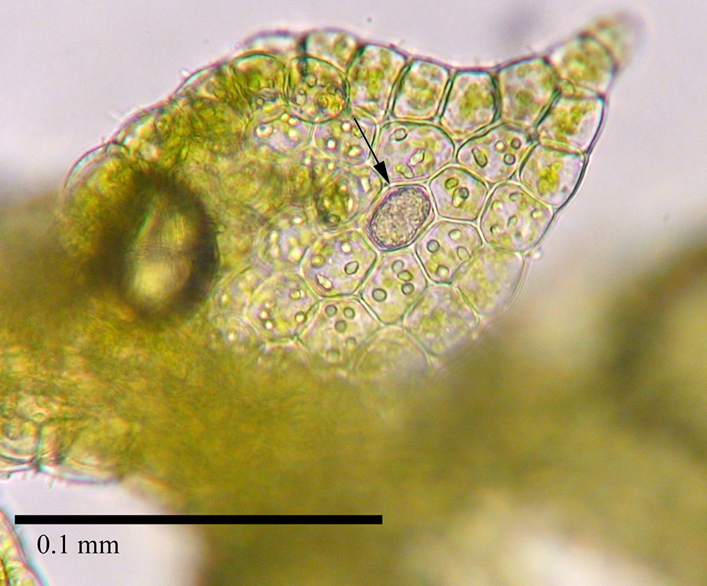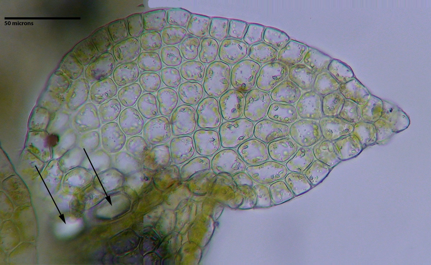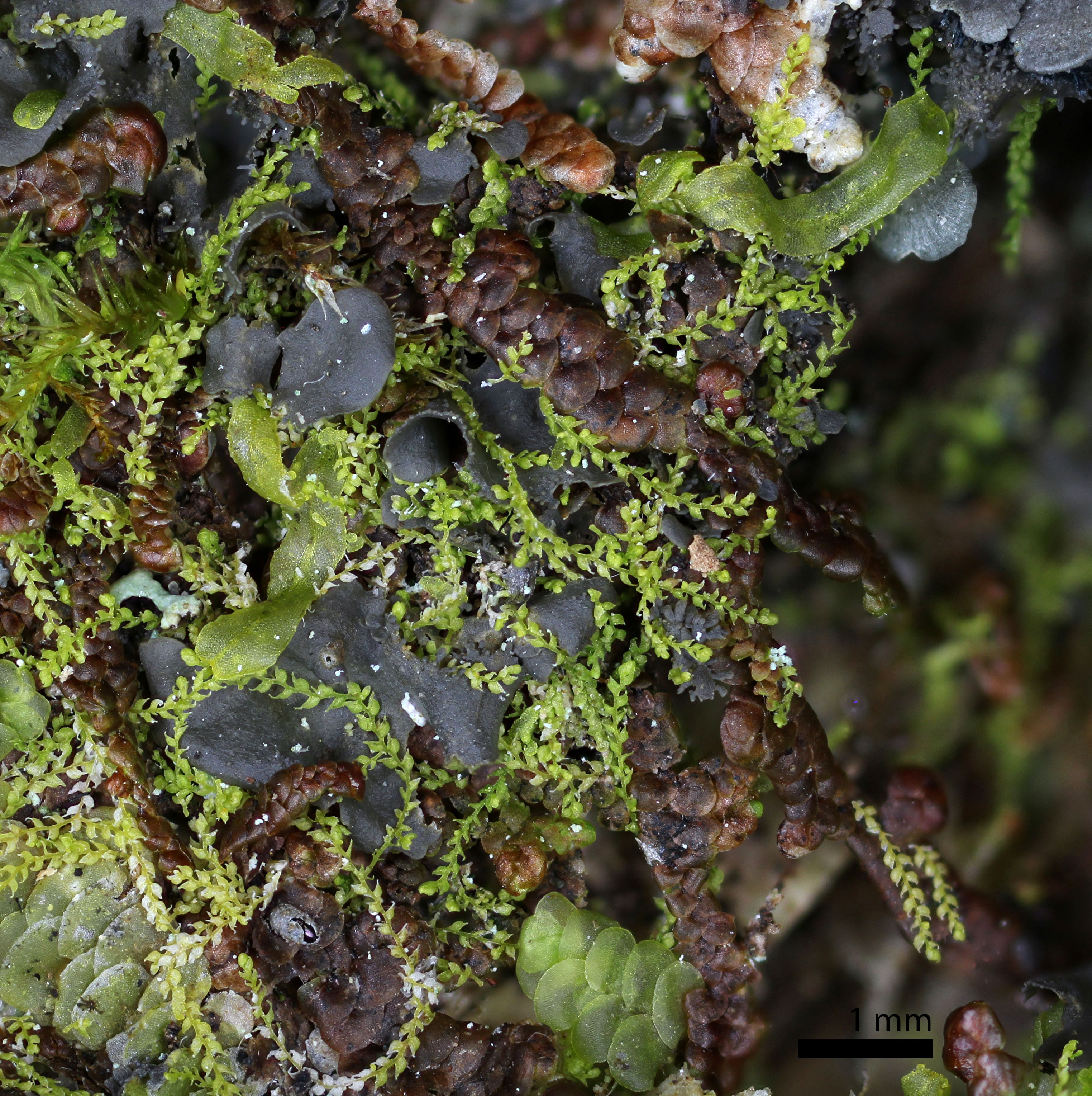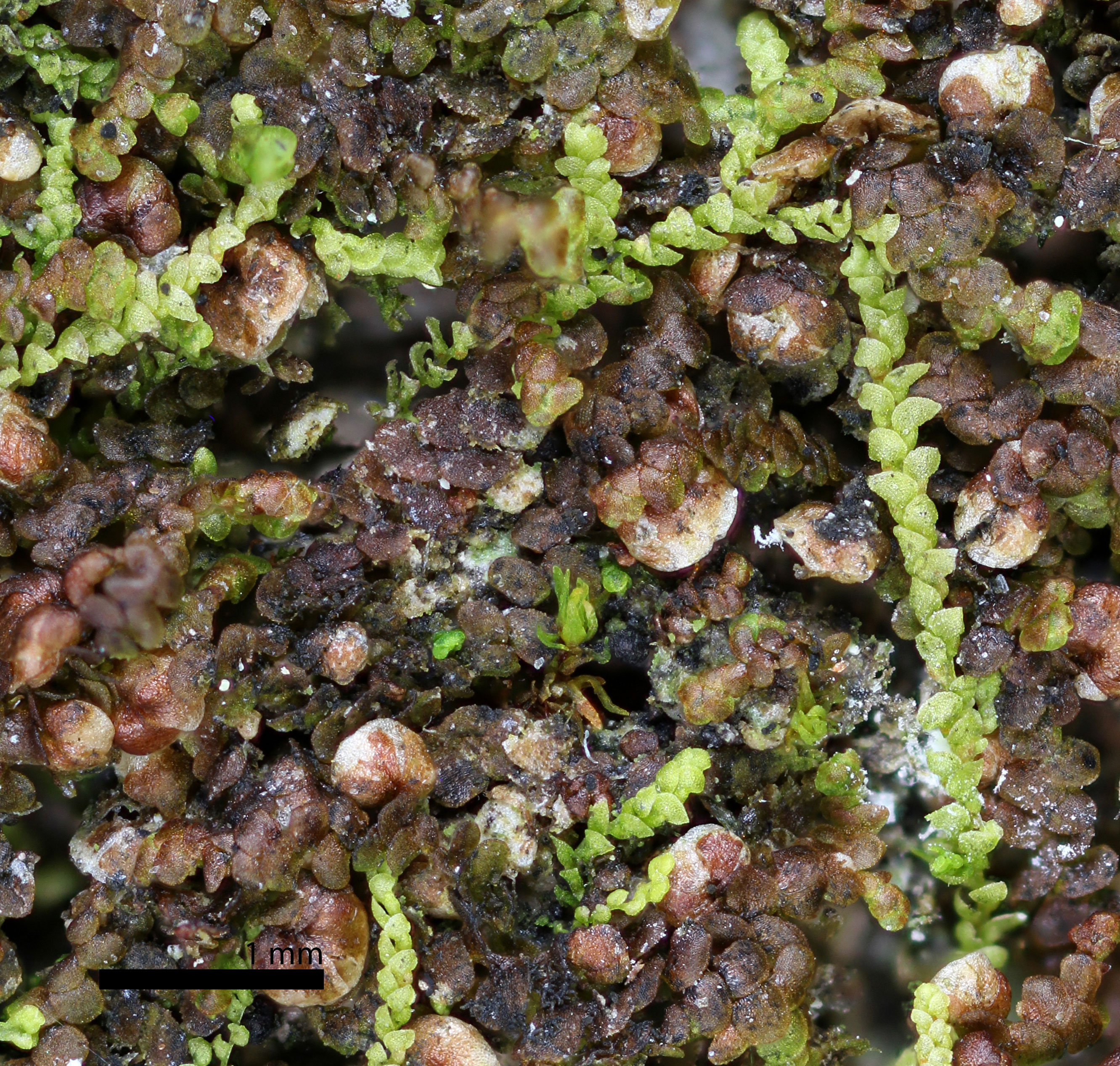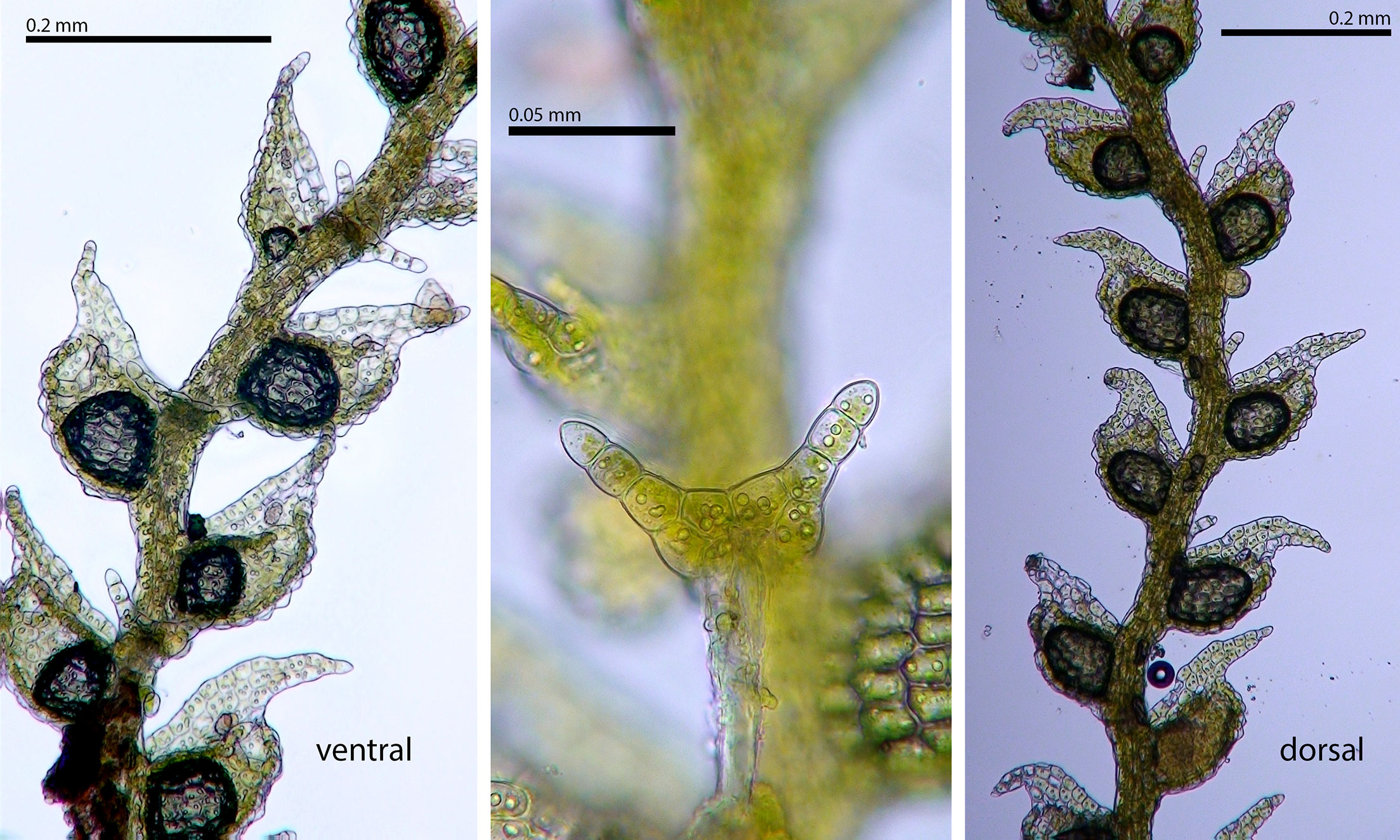 Occurring as isolated, prostrate shoots or shoots amassed forming thin mats. Individual shoots (leaves plus stem) 0.25 to 0.50 mm wide. Lateral leaves complicate-bilobed, the dorsal lobe falcate and quickly tapering to the apex (acuminate); one or two ocelli near the middle of some dorsal lobes of lateral leaves. Underleaves bilobed with wide spreading lobes, each lobe consisting of a single row of cells.