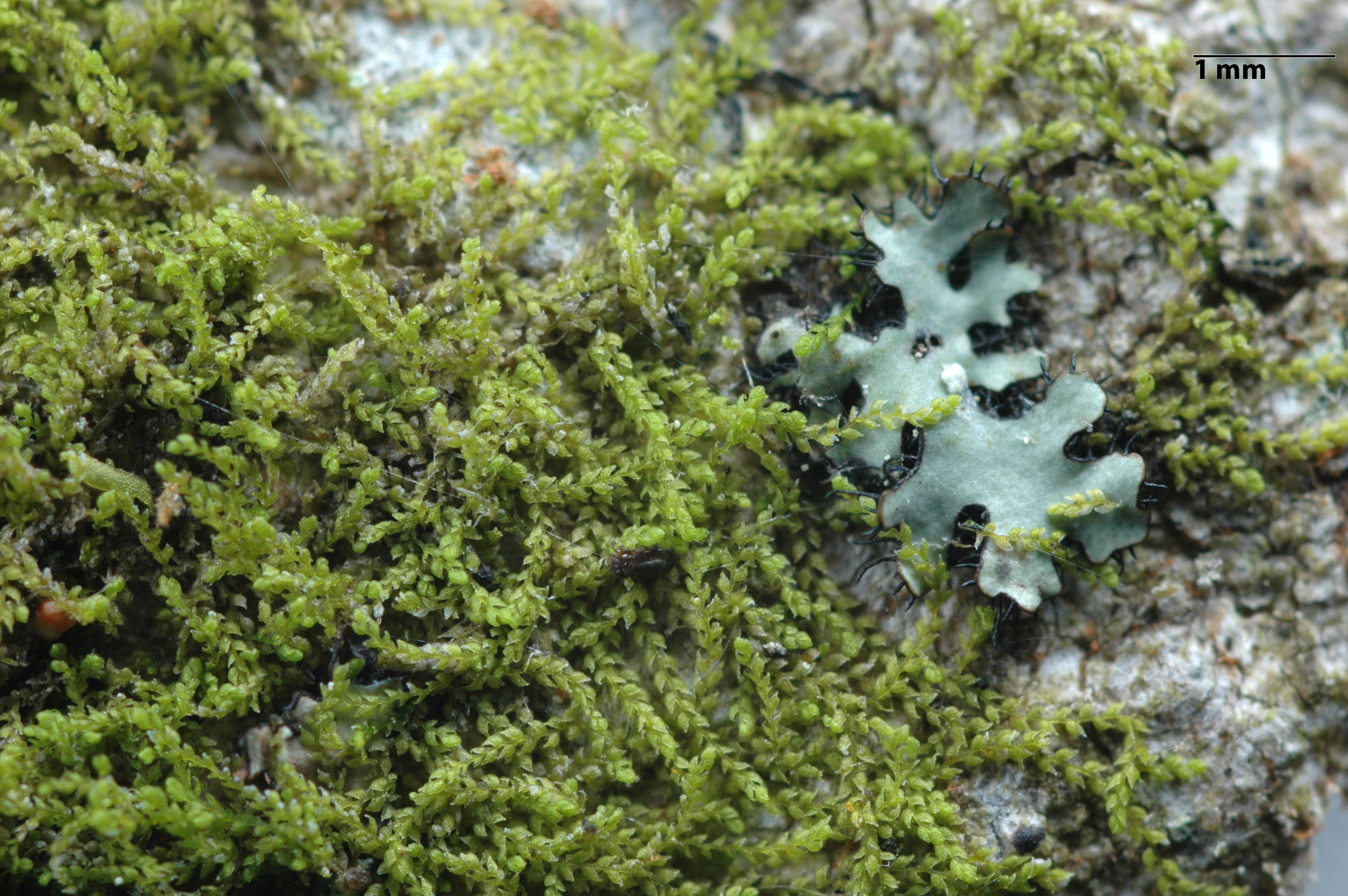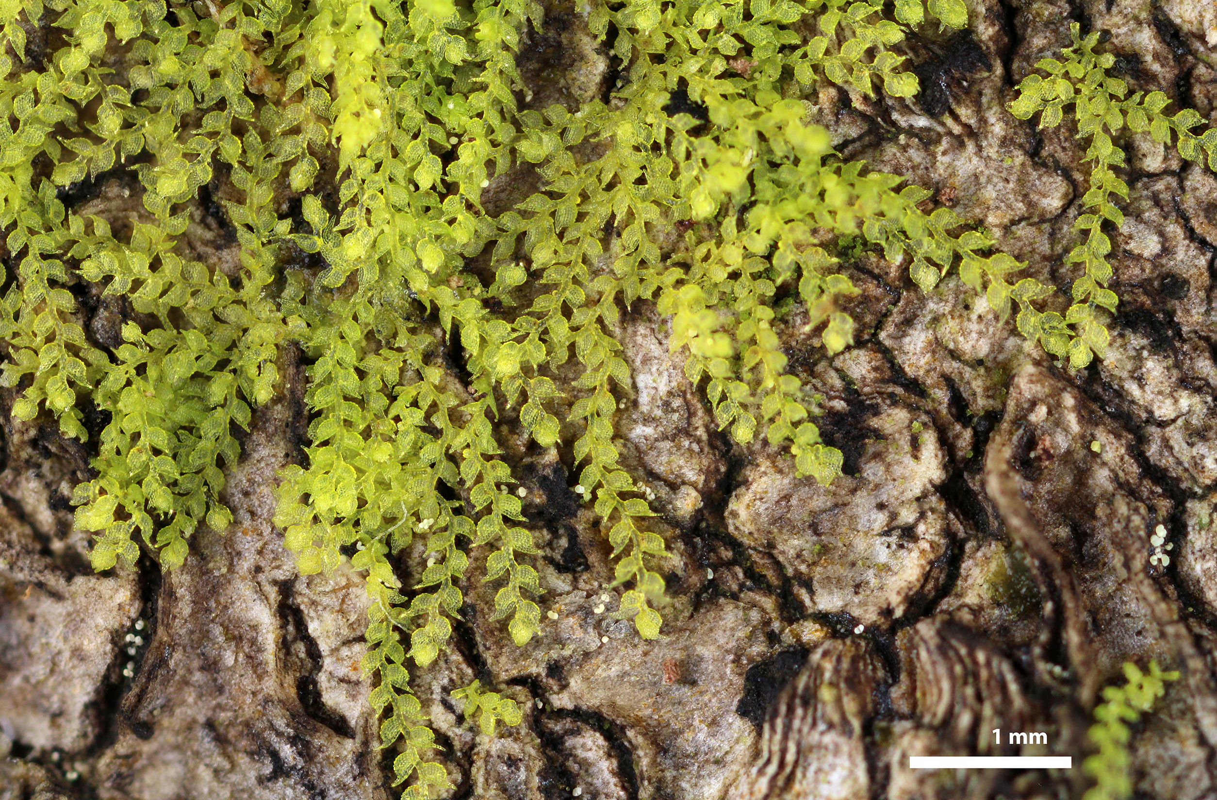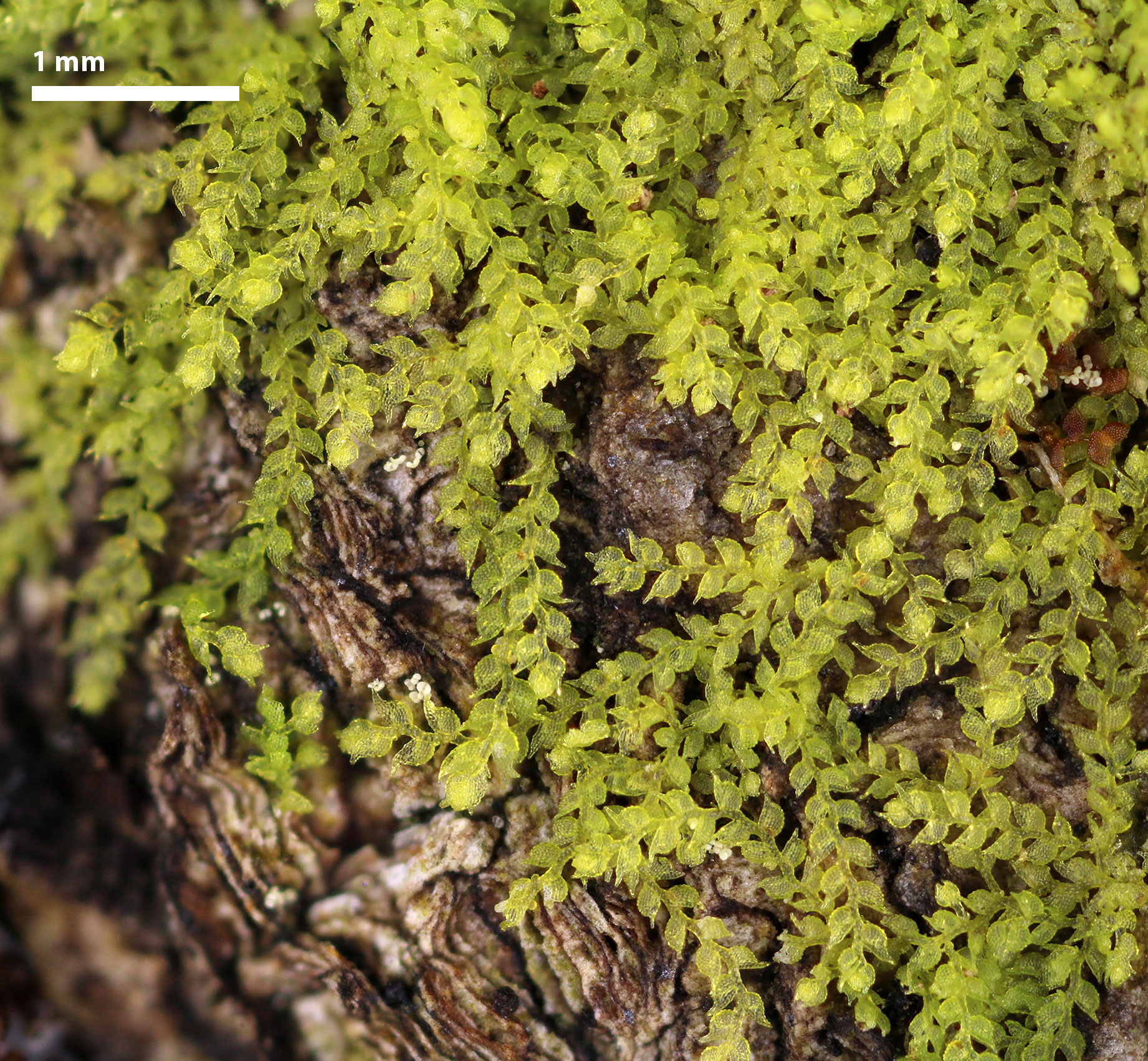 Pure patches are not uncommon on the bark of younger trees, while scattered strands amongst other bryophytes are typical of older trees with rough bark. On young trees it appears to colonize the recessed crevices and slight irregularities of otherwise smooth bark. From these shaded micro-ravines of bark, shoots may spread out across the exposed flat bark surfaces forming pure patches of several square centimeters. Such robust, thin mats appear on trunks of young Liriodendron and other woody plants in close proximity to streams.
