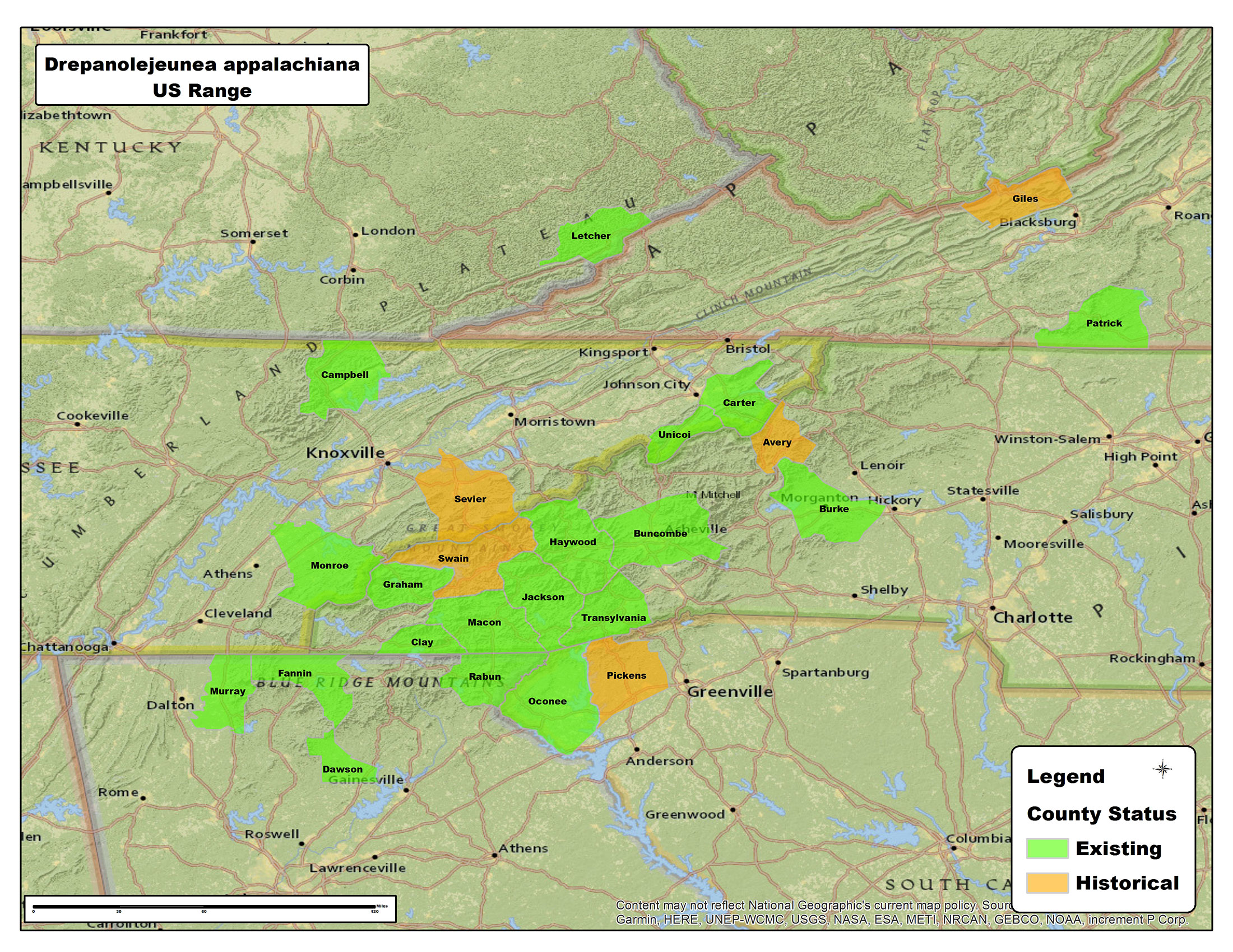 North America. U.S.A.. (Georgia, Kentucky, North Carolina, South Carolina, Tennessee, Virginia, Puerto Rico). That the species occurs in Puerto Rico was doubted by Schuster (1980). Predominately a species of the Southern Appalachians with rare occurrences westward in the Appalachian Plateaus of northern Tennessee and eastern Kentucky.