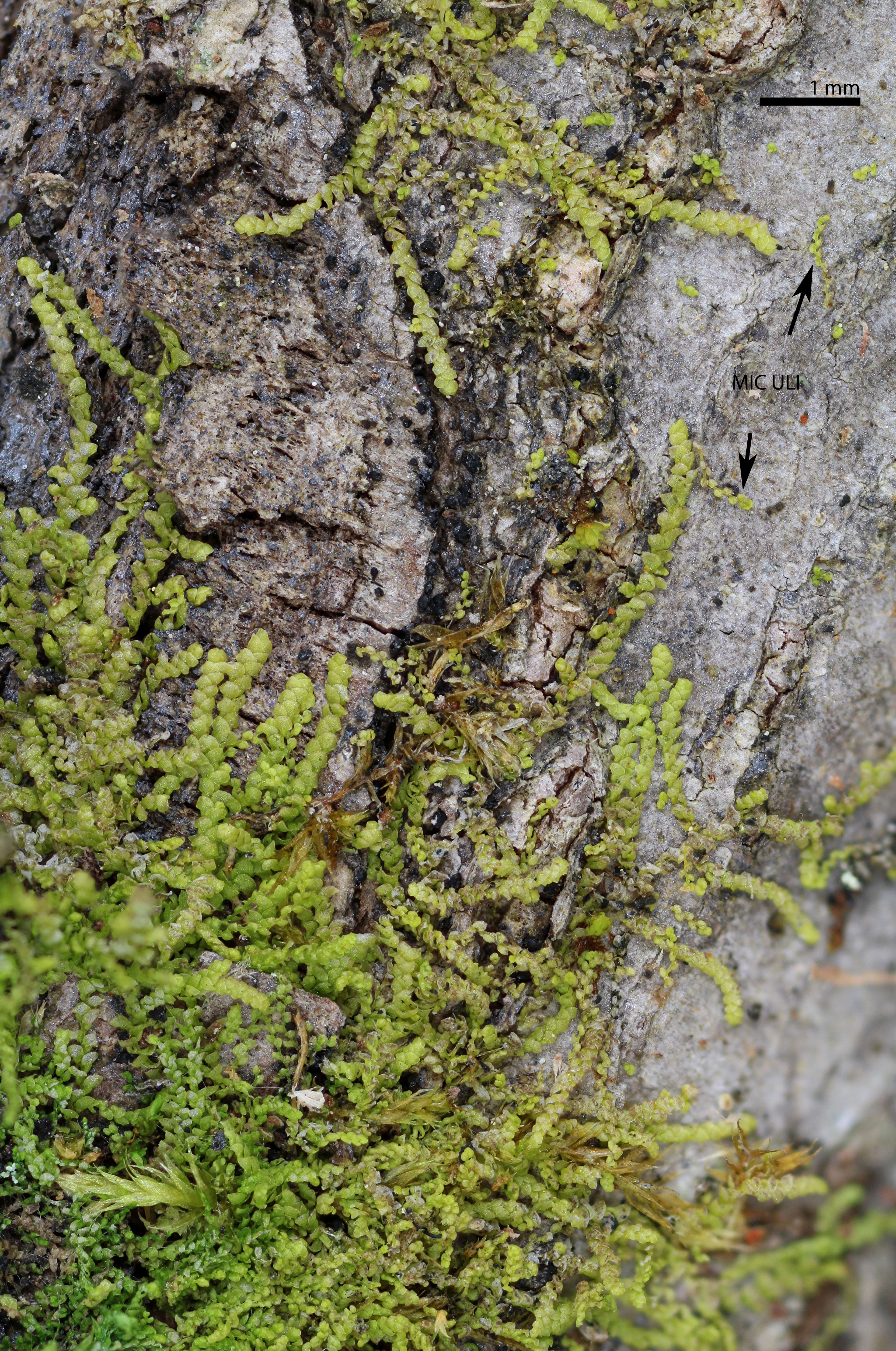 On trunk of yellow birch with Frullania asagrayana, Metzgeria, Radula and lichens. Also present in this specimen packet: Harpalejeunea, Microlejeunea ulicina, Porella, and Frullania eboracensis. there are two shoots of Harpalejeunea in the photo; one shoot is out of focus at the far upper right, the other is near the top of the photo at the midline, shoot pointed down and angling to the left between Frullania shoots.