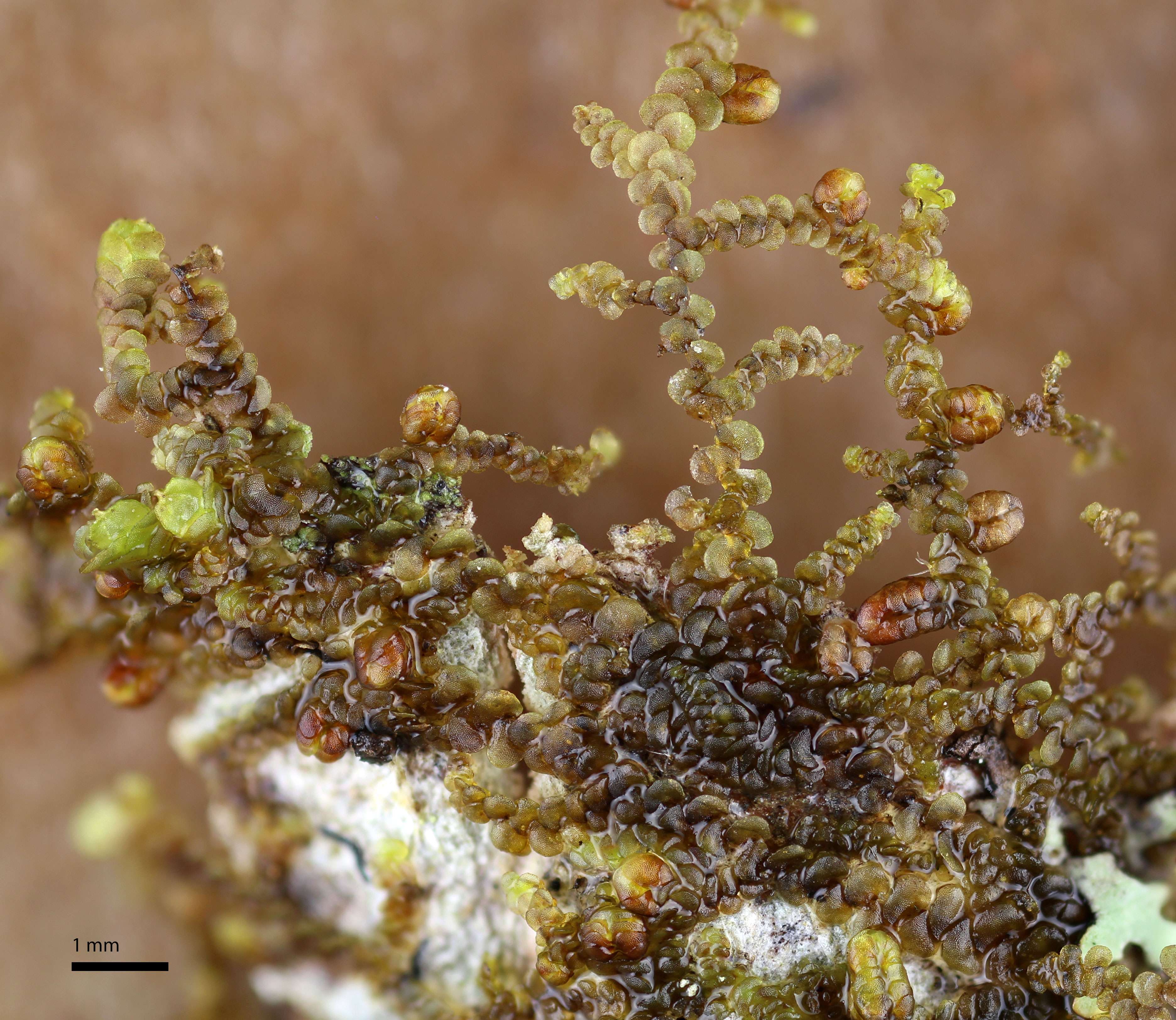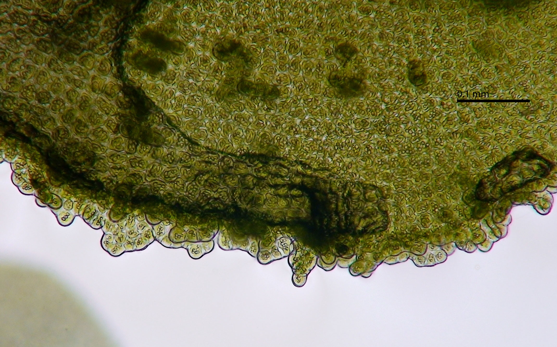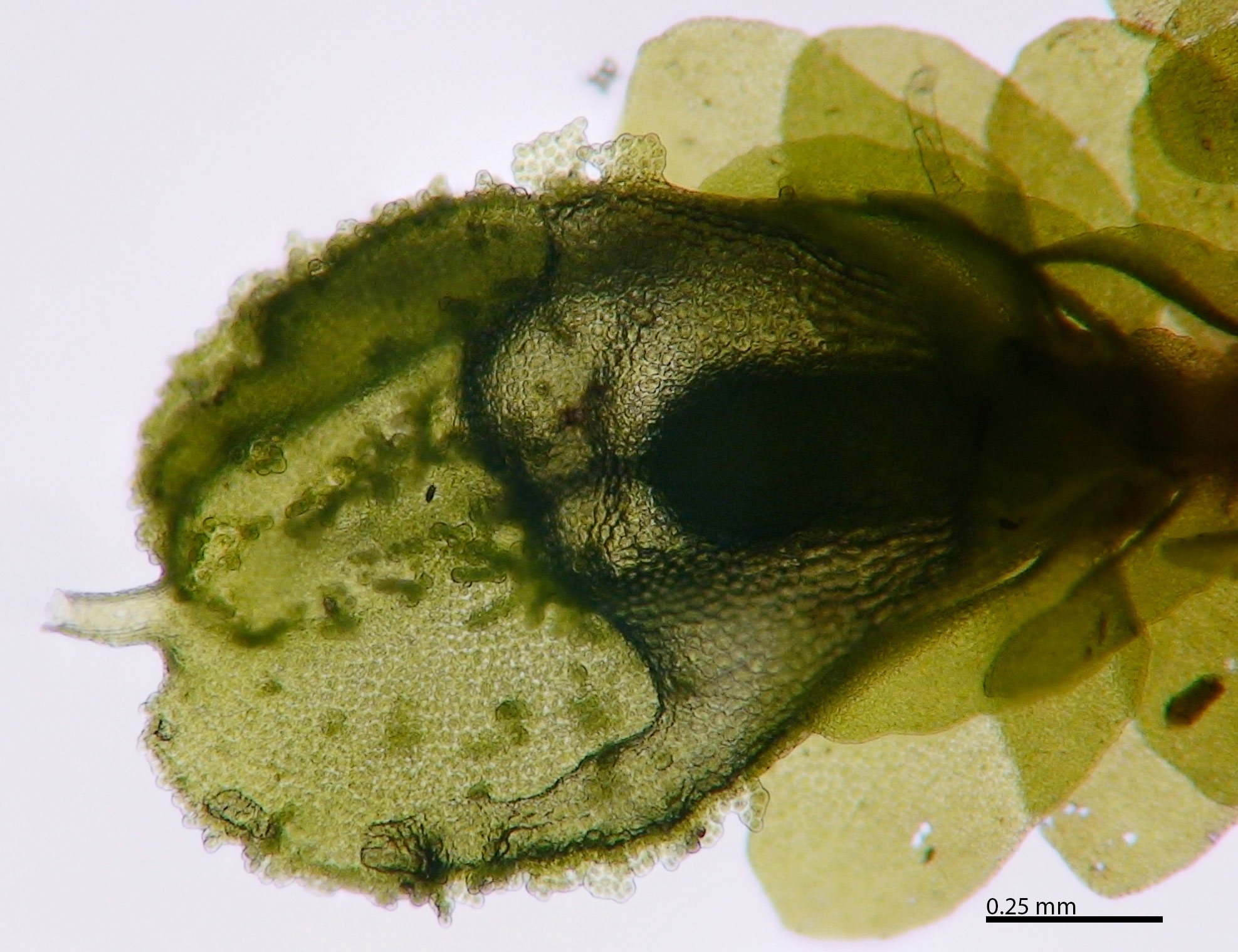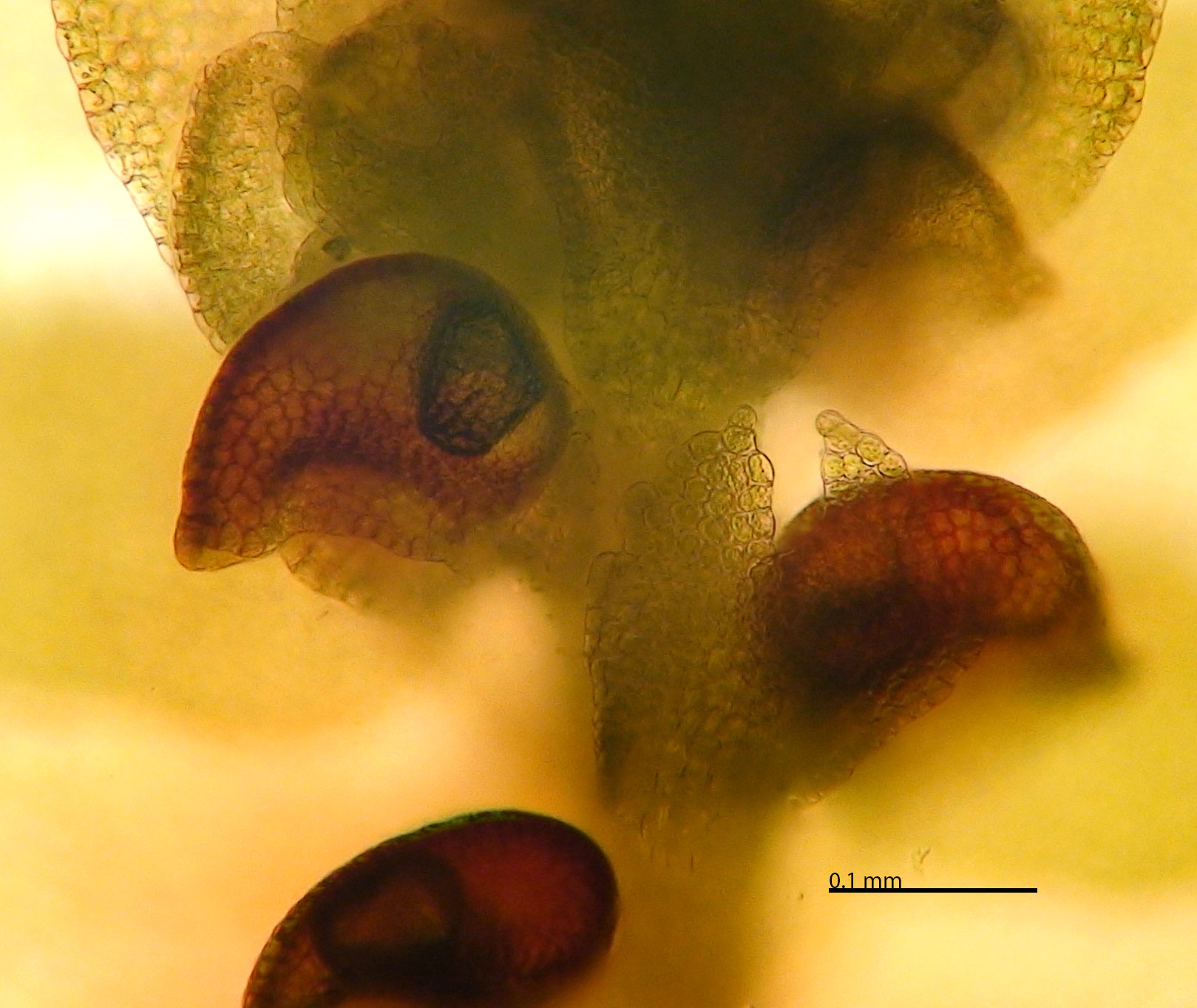 Well developed underleaves are very helpful in confirming identifications, especially in long-dead plants lacking oil bodies. The shape of underleaves is distinctive in the wide, toothed shoulders that quickly narrow to the insertion on the stem.