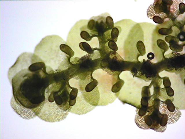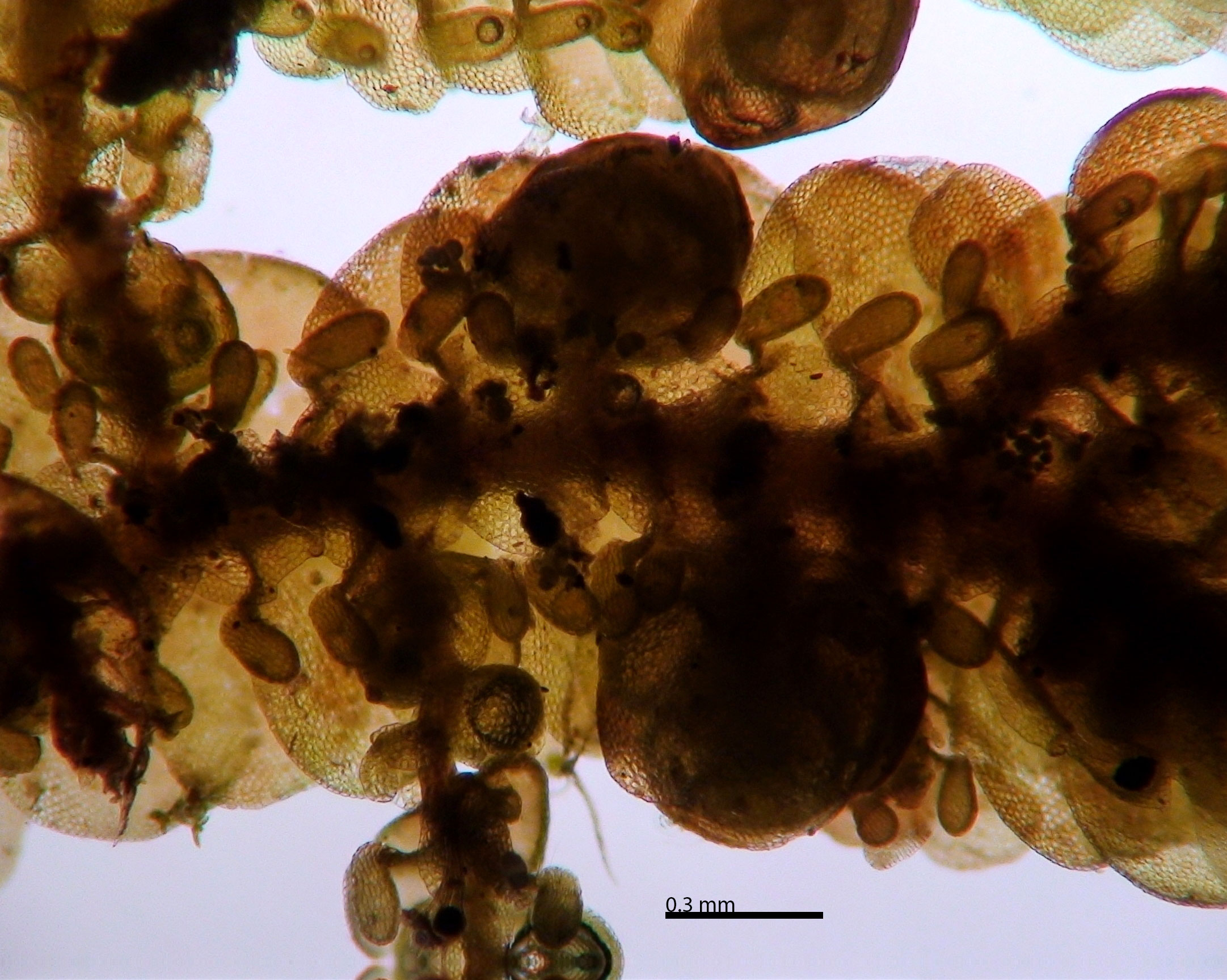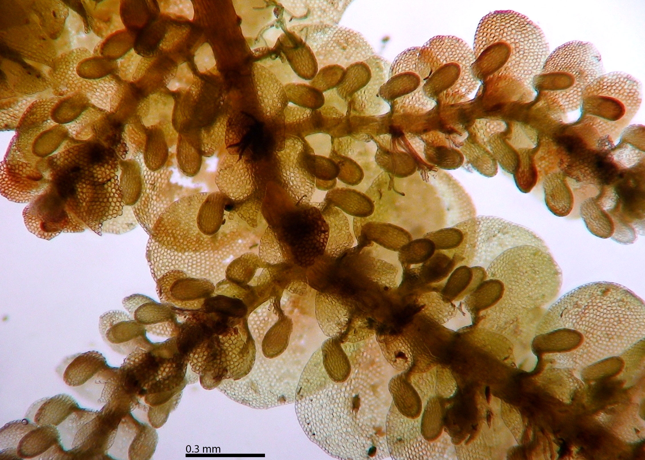 Shoot width: to 1-1.5 mm. Color: light brownish. Cell walls in leaf lobe: with intermediate thickenings. Dorsal lobe insertion: truncate. Lobules: always inflated, longer than wide, angled away from the stem and notably distant to the stem.