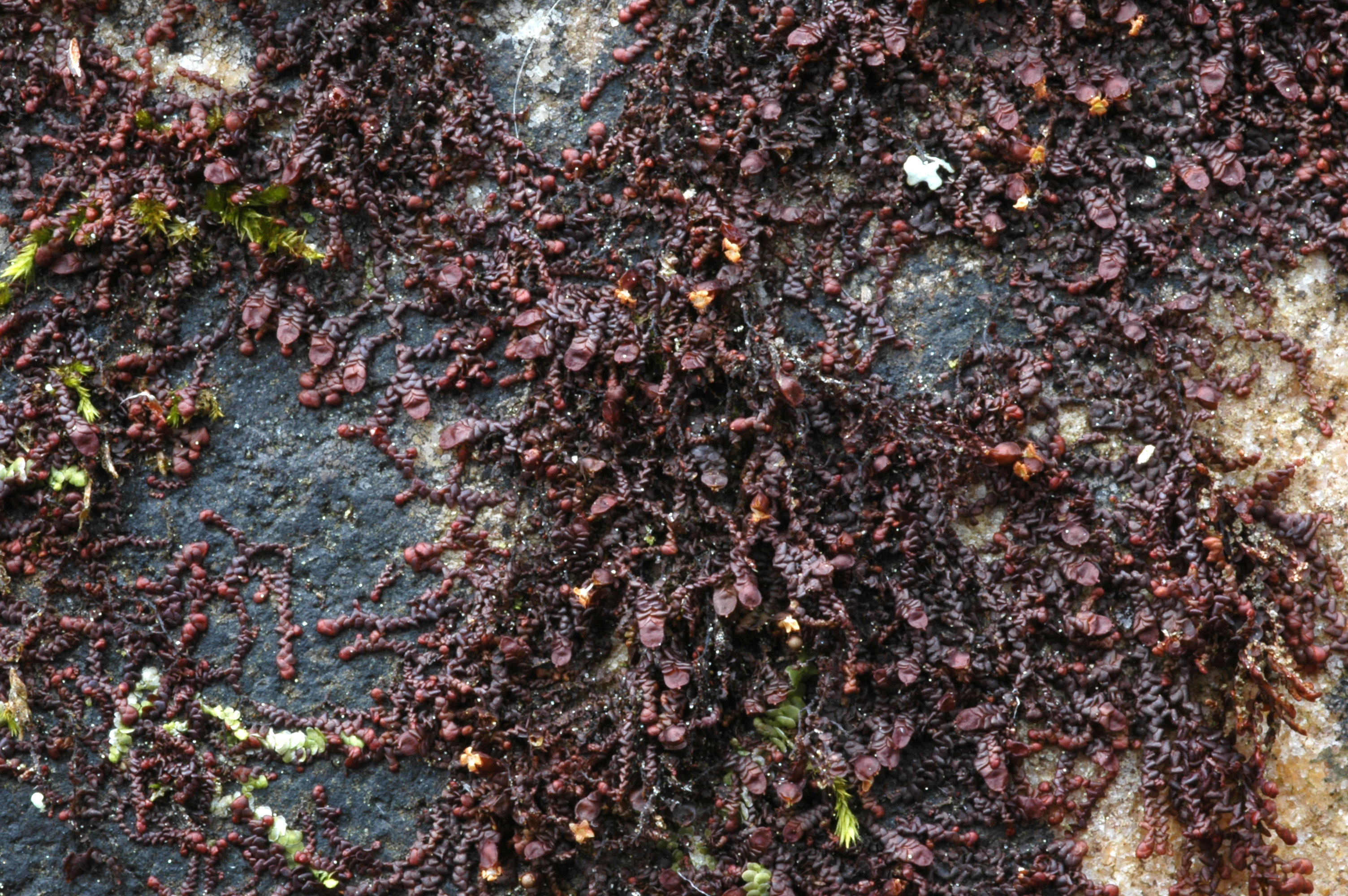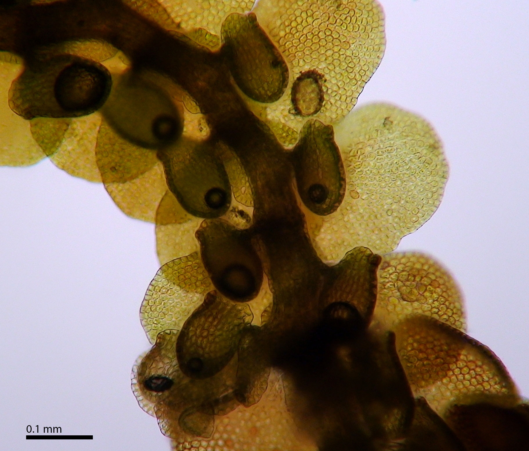Shoot width: <1 mm. Color: reddish to nearly black. Cell walls in leaf lobe: without intermediate thickenings. Dorsal lobe insertion: slightly cordate. Lobules: longer than wide.