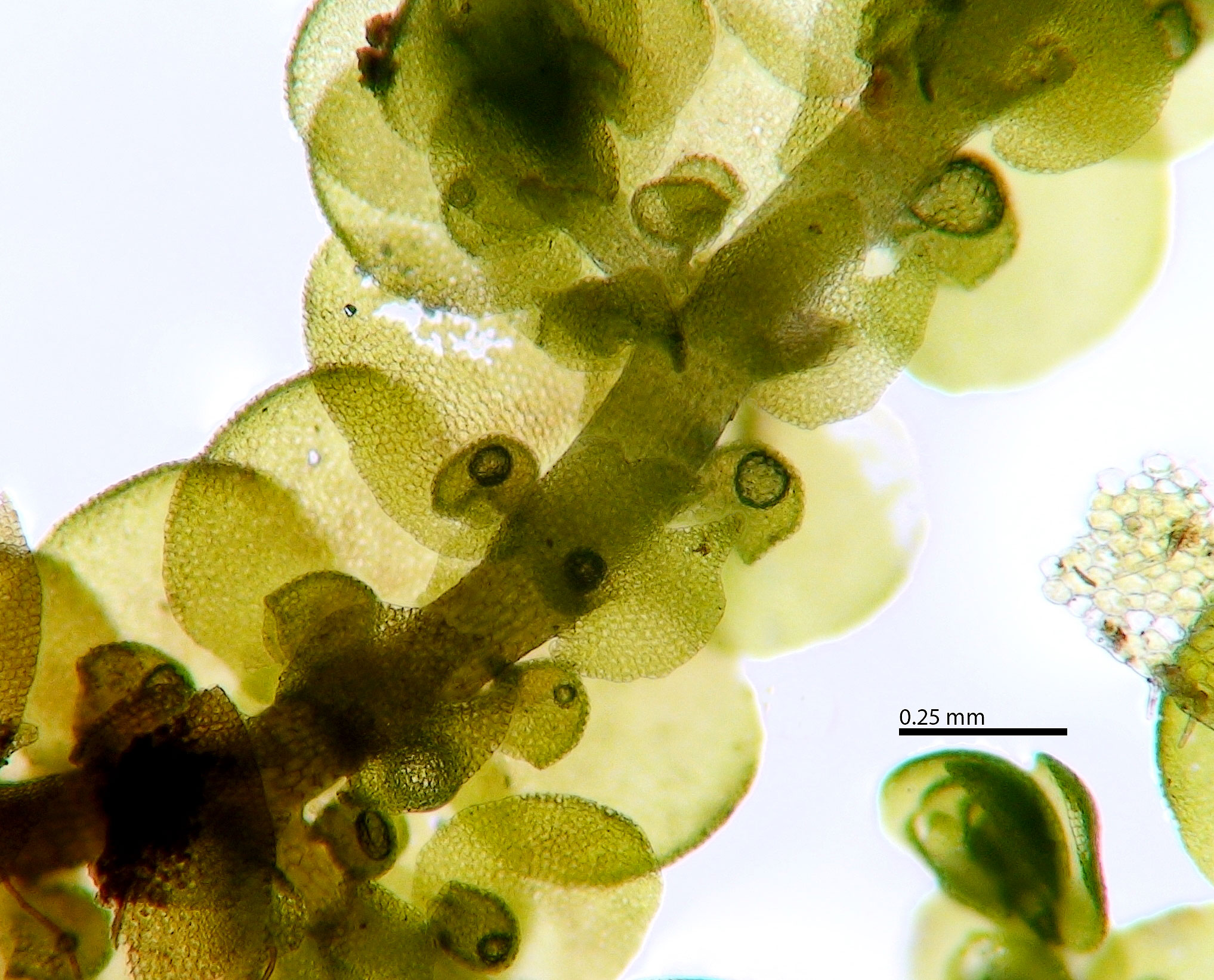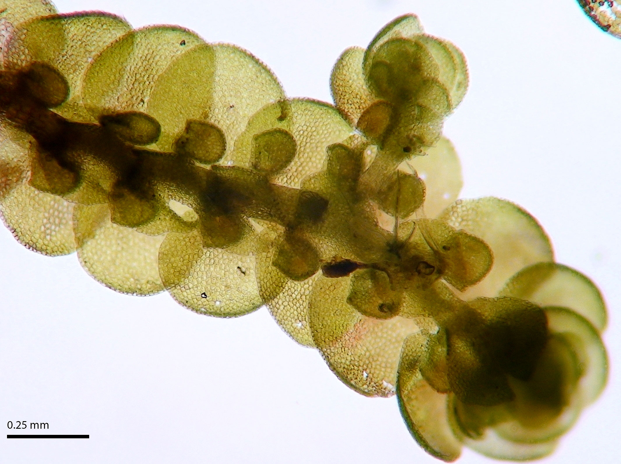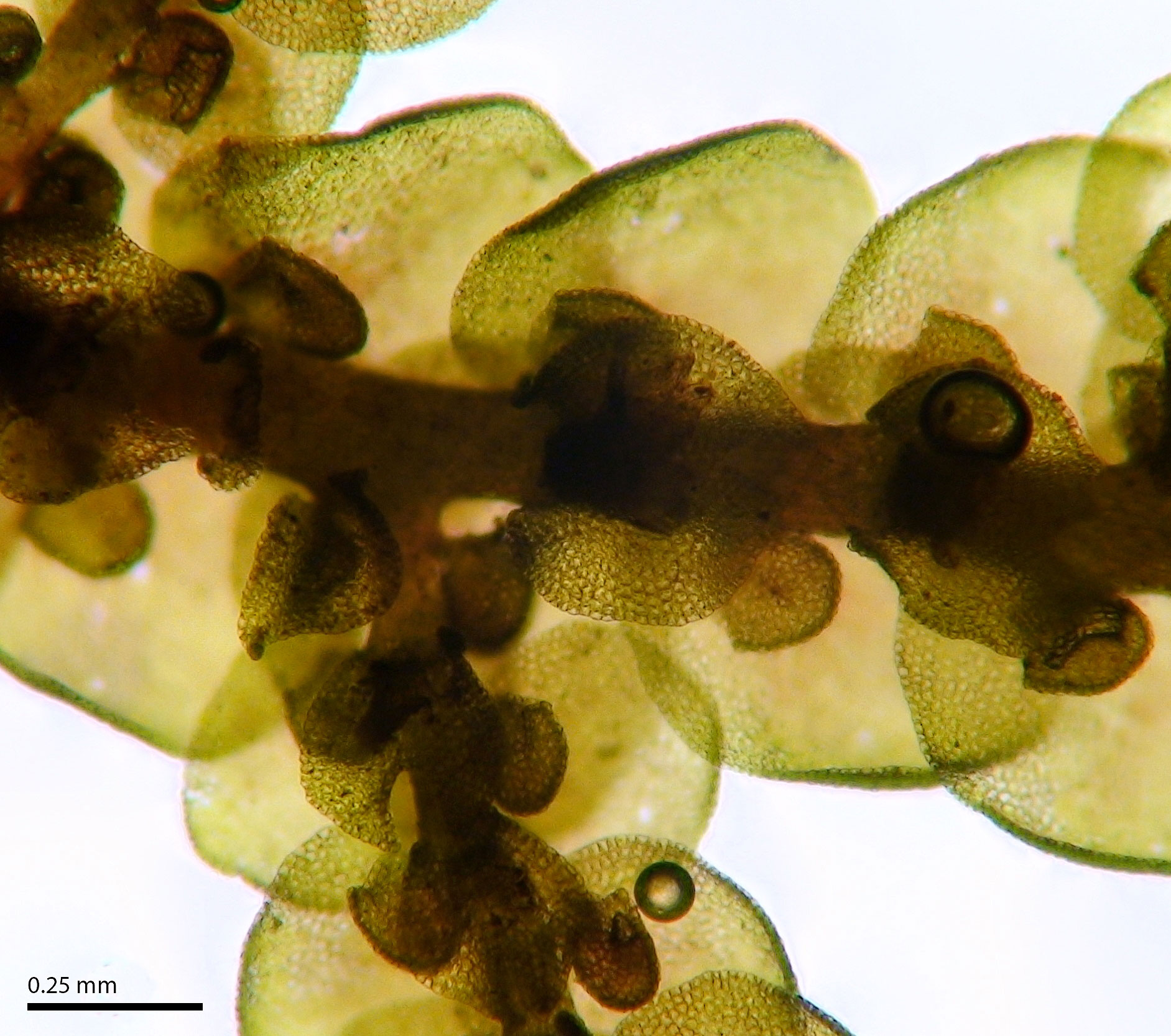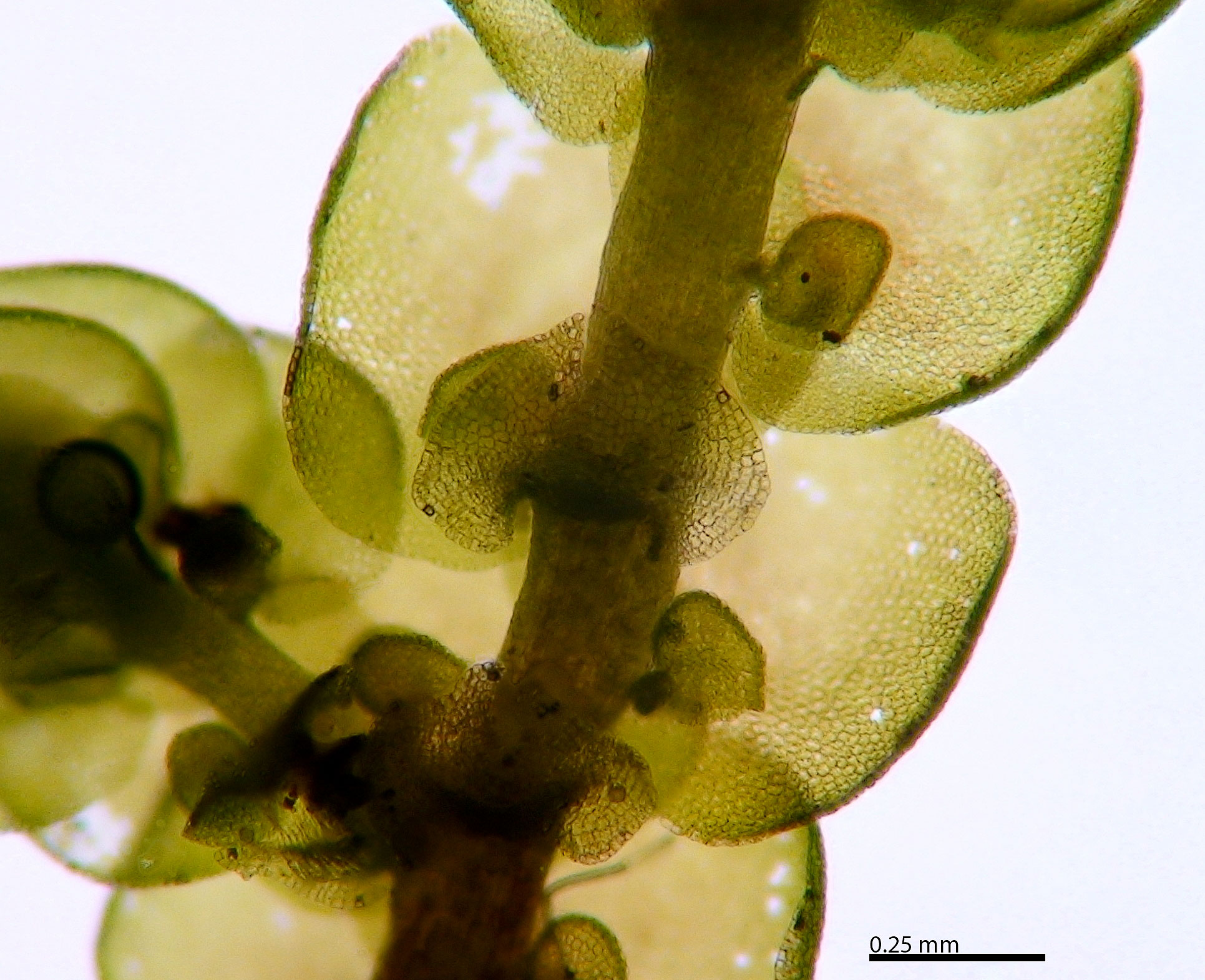 Shoot width: to just over 1 mm wide. Color: predominantly green. Cell walls in leaf lobe: with intermediate thickenings. Dorsal lobe insertion: cordate. Lobules: inflated lobules about as wide as long.