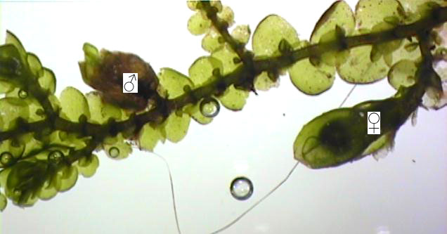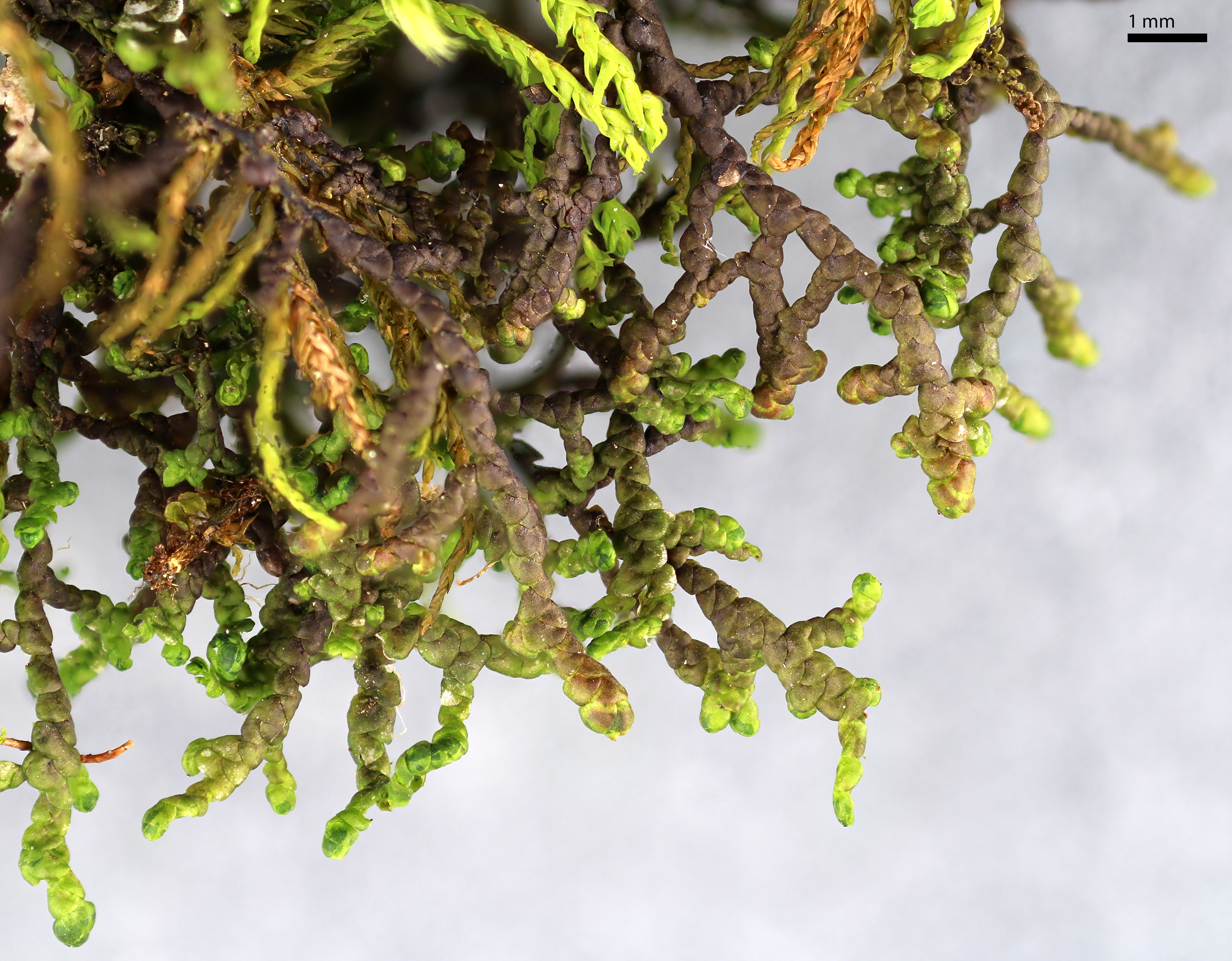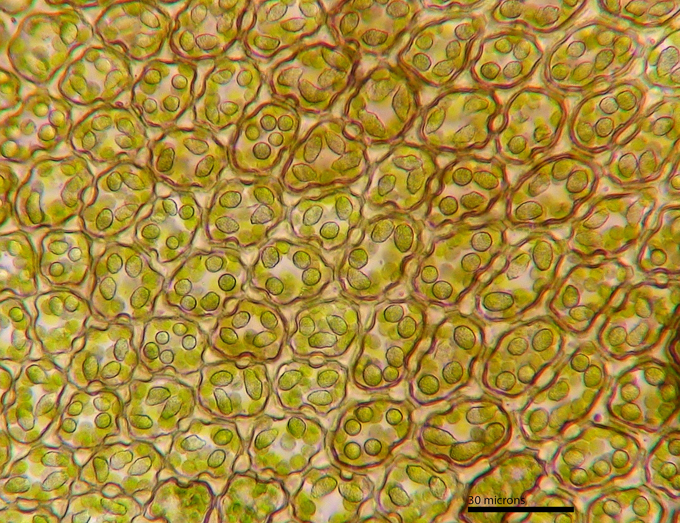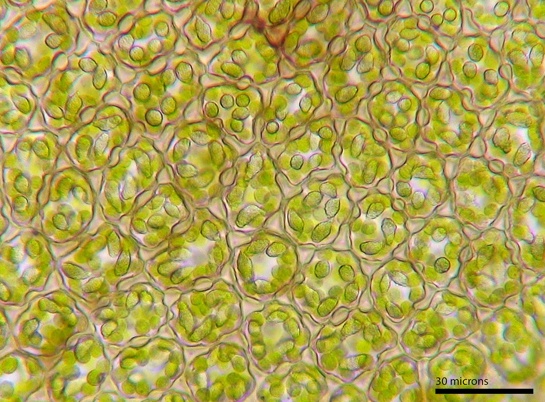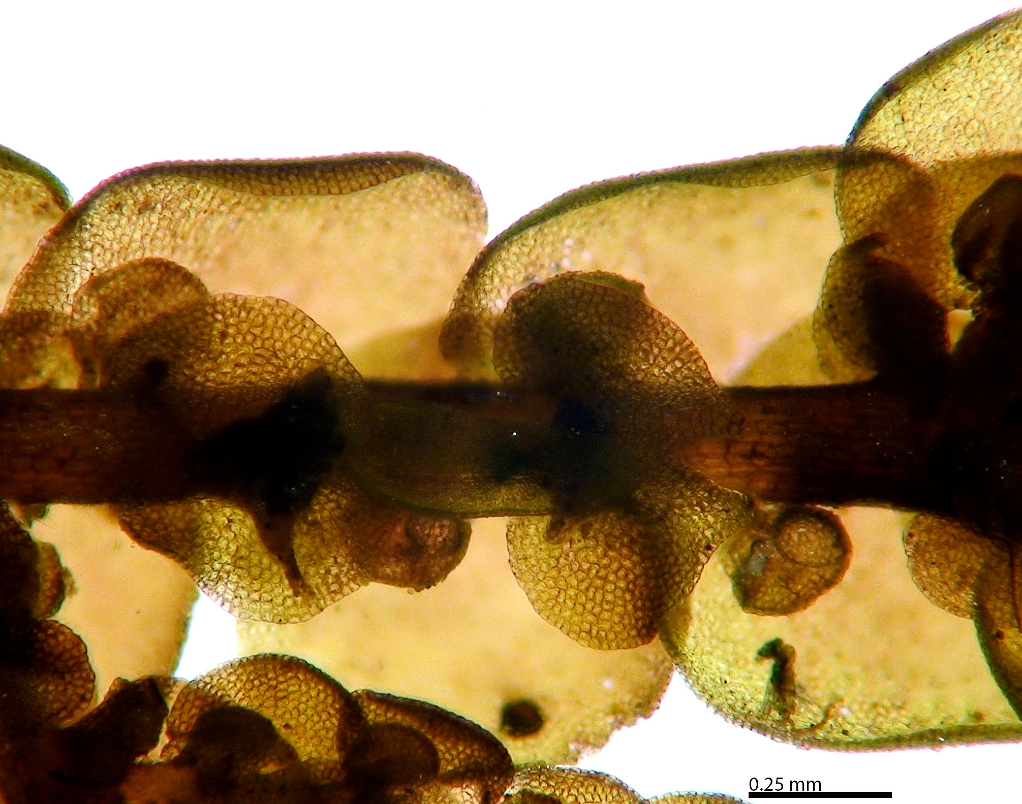 Shoot width: to just over 1 mm wide. Color: predominantly green. Cell walls in leaf lobe: with intermediate thickenings. Dorsal lobe insertion: cordate. Lobules: inflated lobules about as wide as long.