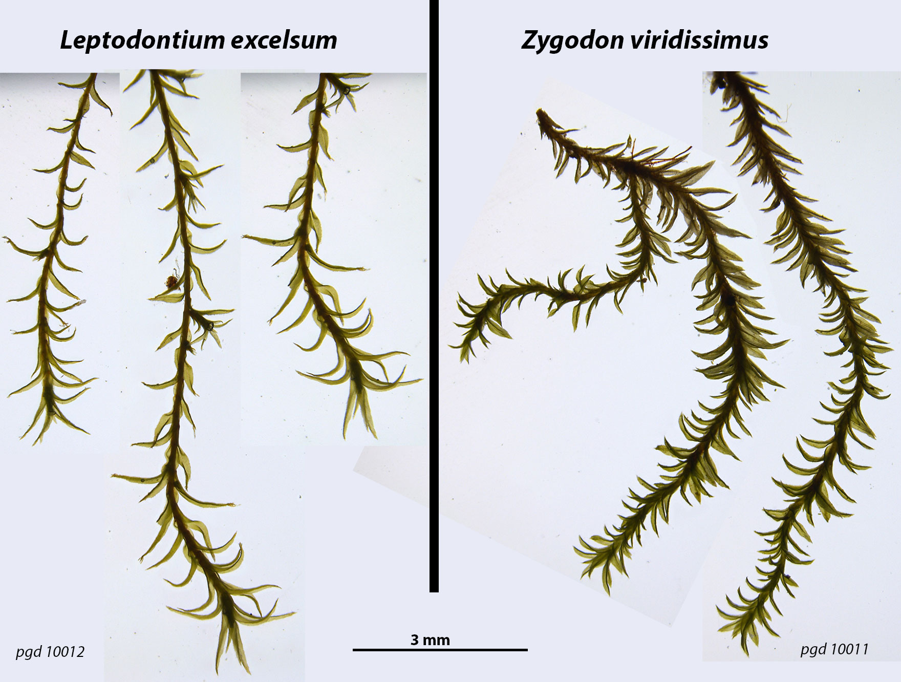 Leptodontium viticulosoides can be reliably identified in the field. It is most likely to be confused with co-occurring Zygodon viridissimus which differs in having more closely spaced leaves with leaf margins entire or rarely with an isolated tooth. Zygodon viridissimus typically forms small cushions consisting of closely spaced shoots with closely spaced leaves as compared to the loose tufts of elongated shoots with distant leaves characteristic of Leptodontium excelsum.