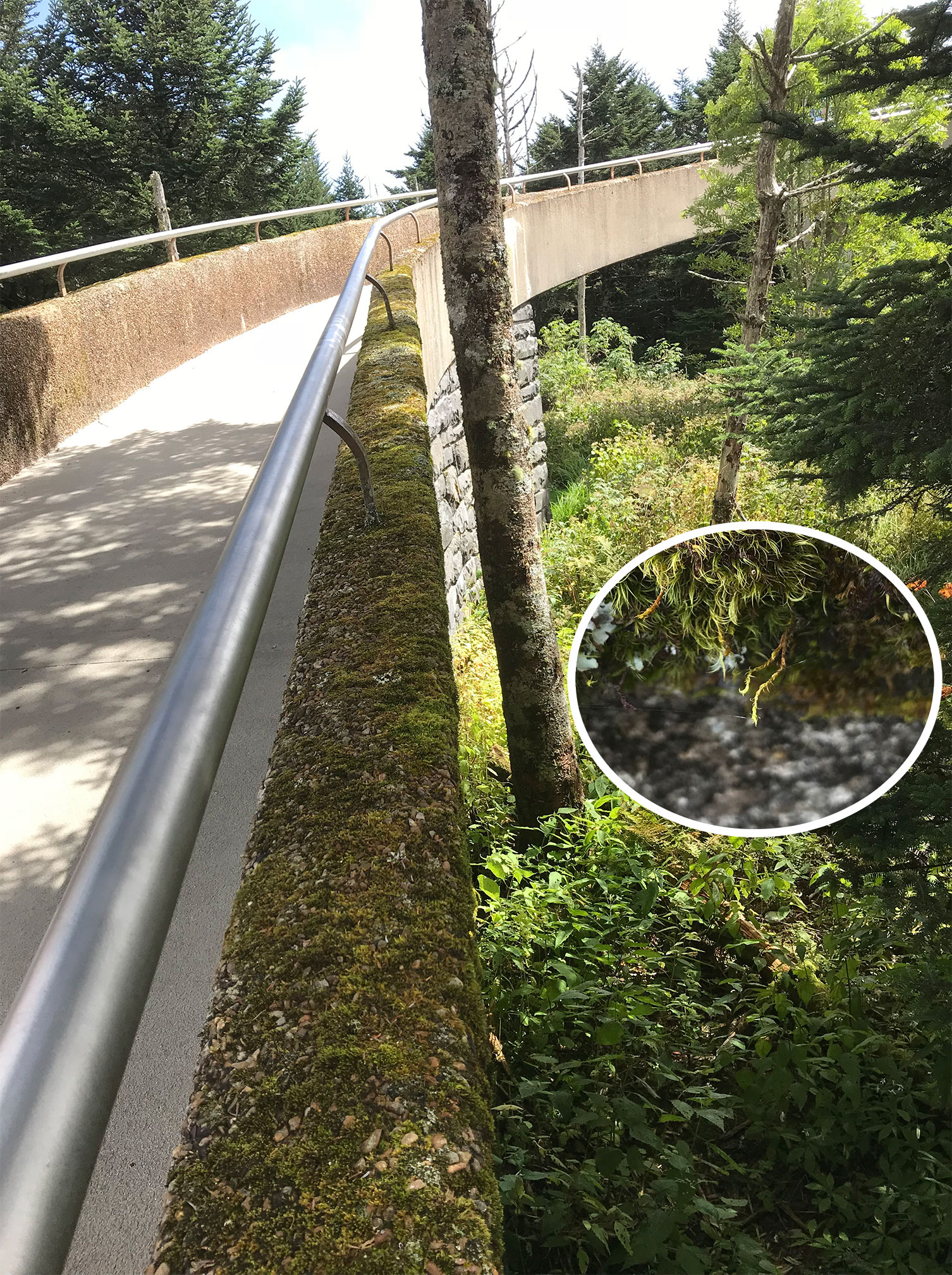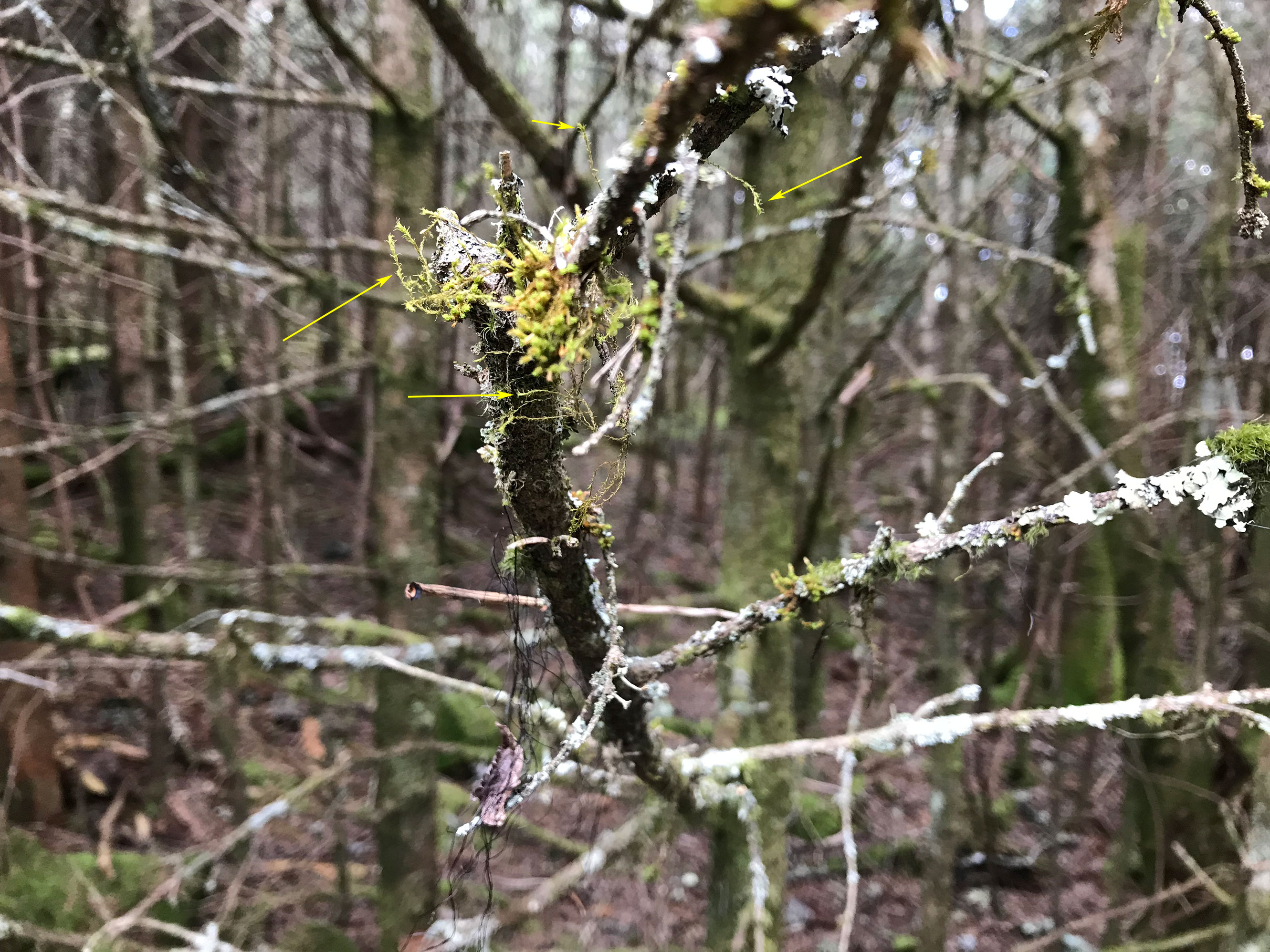Zander (1980, 1996) put forth the hypothesis that L. viticulosoides in the Southern Appalachians was spreading due to human induced environmental change (acid rain and associated insect infestations) that has led to the death of Fraser fir trees thereby producing a greater “availability of suitable, loose bark substrate.” Based on our observations, in the last 20 years L. viticulosoides has greatly increased in abundance and in luxuriance on Clingmans Dome. Its presence on Roan Mountain is far less noticeable with only small tufts seen on 1-3 fir trees from 1999-2018. Historically the species could not be found on Roan Mountain by Lewis Anderson who made a decided effort to find it there (Anderson 1951). To our knowledge, L. viticulosoides has yet to be found in the Fraser fir forests on Mt. Mitchell, N.C. or Mt. Rogers, Virginia.
