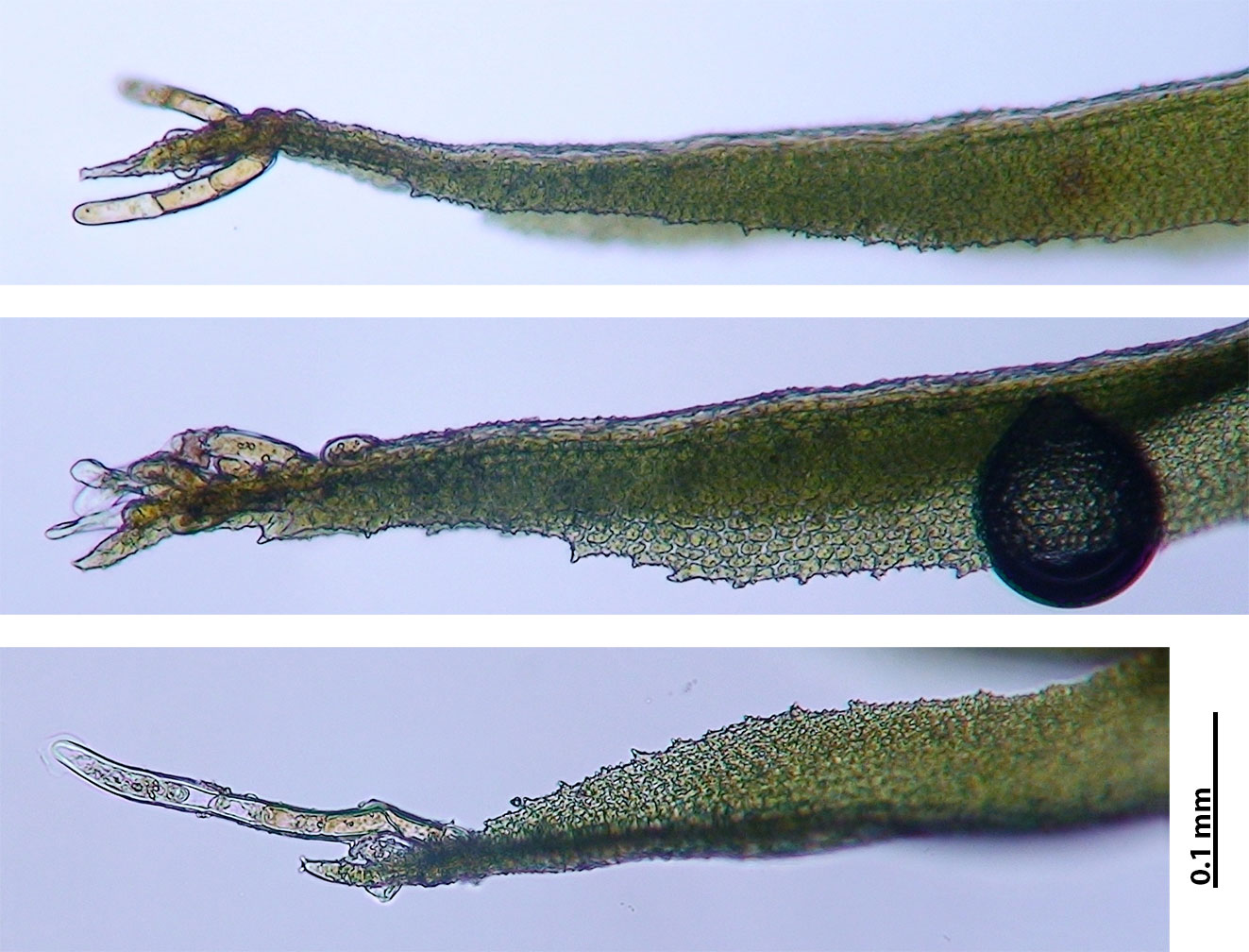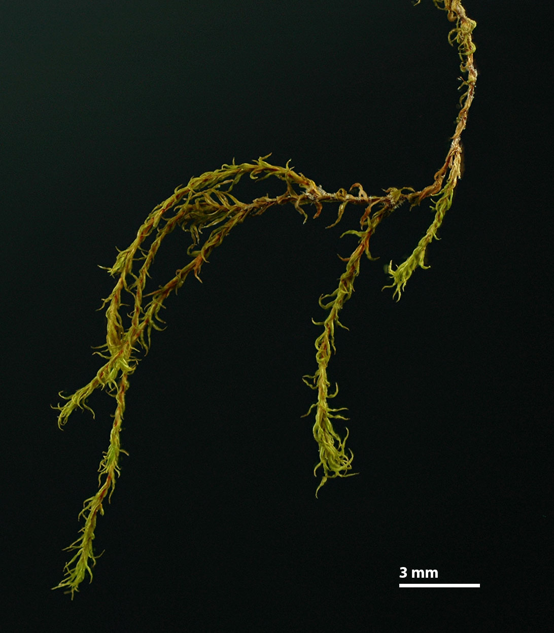 Shoots slender, flexuose, up to 7 cm long, usually yellow green occurring as isolated strands or forming large, loose tufts, often pendent. Leaves typically widely spreading, rather distant, long-lanceolate, apex narrowly acute, decurrent at base, costa extending to the leaf apex. Leaf margin coarsely serrate in the upper half of the leaf, recurved below. Leaf cells pluripapillose. Occasional leaves with rhizoids growing from leaf apices.
