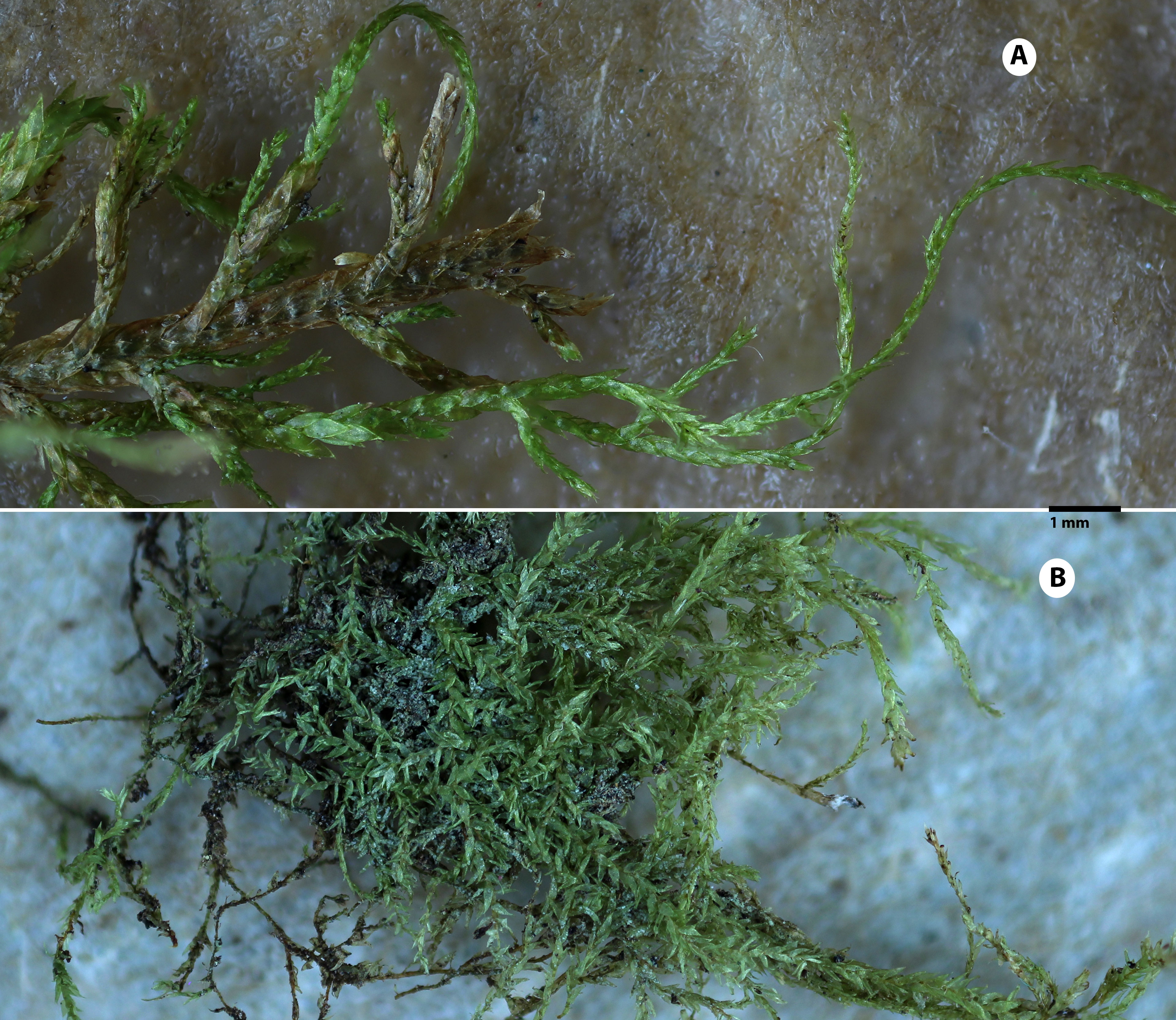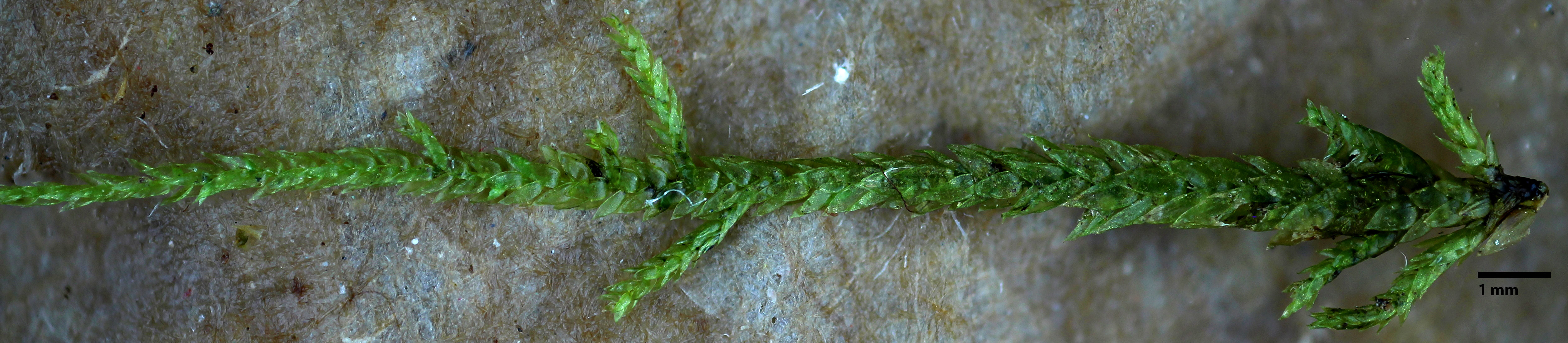 "Small, slender plants in flat, shiny, bright-green, yellow-green, or yellow-brown mats, creeping, freely and irregularly branched, scarcely recognizable in the field. Stems creeping or curved-ascending; branches straight, horizontal, slender and often nearly filiform; pseudoparaphyllia and brood branches none. Stem leaves erect, not particularly crowded, 0.5-1.0 mm long, moderately concave, oblong-ovate or oblong-lanceolate, sharply or bluntly acute; costae often 1/4 - 1/2 the leaf length; cells oblong-linear, somewhat flexuose, not thick-walled, finely prorulose at back; subquadrate alar cells few and inconspicuous. Branch leaves similar, small, 0.25-0.5 mm long. Inflorescences and sporophytes unknown." Quoted text from Anderson (1996). In addition, leaf margins are serrulate especially towards the leaf apex and narrowly recurved towards the leaf base; leaves are narrowly decurrent.