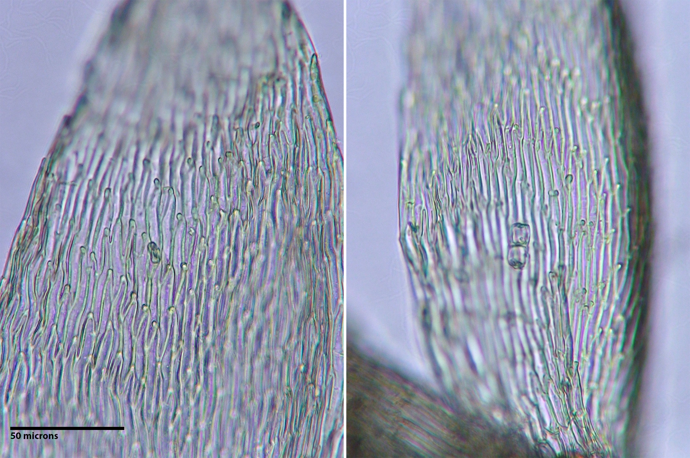 Abaxial leaf surfaces showing thick cell walls and papillosity due to projecting cell ends similar to the papillosity in L. sharpii, but papillae are thicker in P. filiforme. Leptohymenium sharpii also has thinner cell walls.