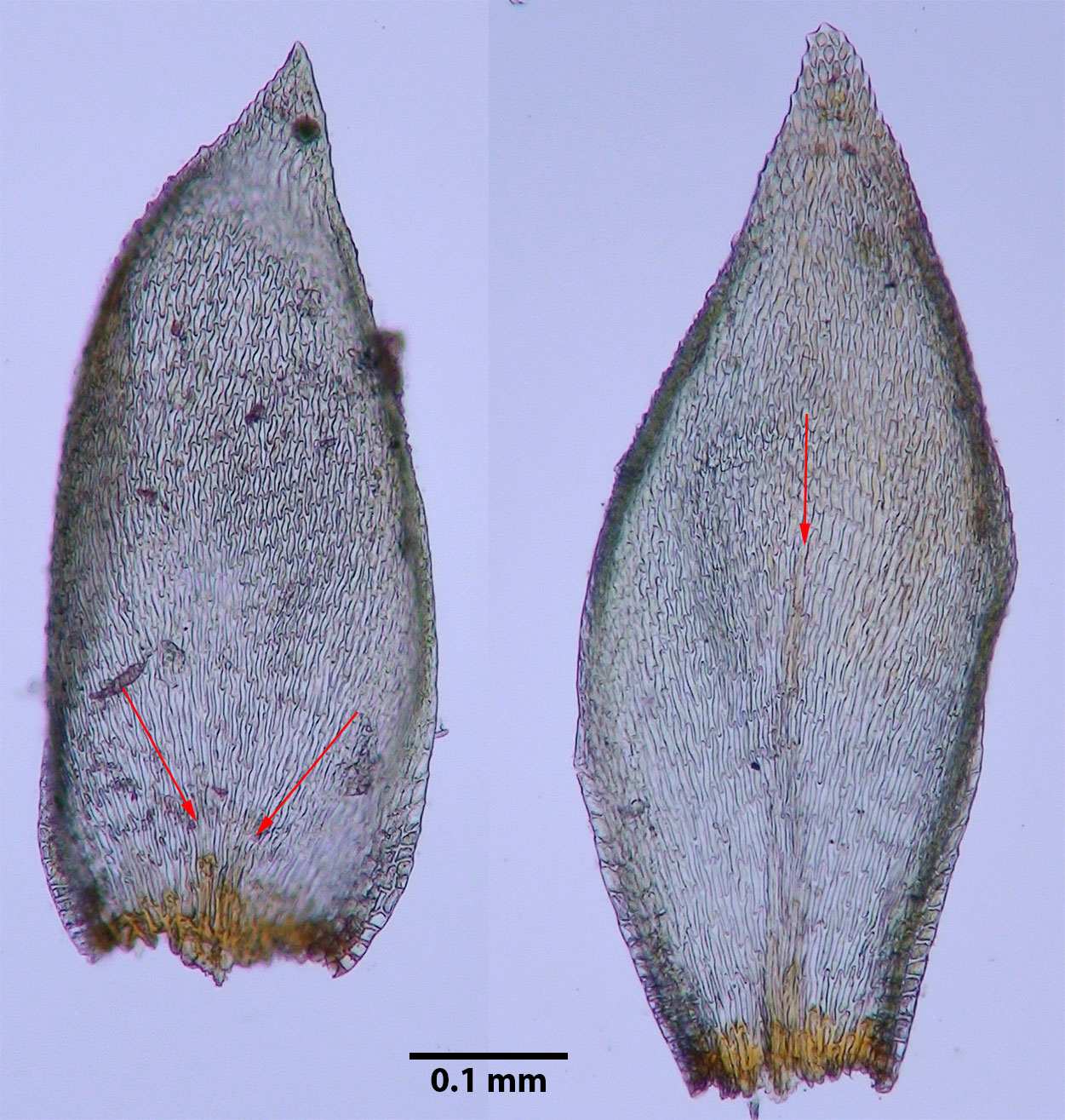 Alar cells are small, quadrate and inconspicuous. The leaf bases in the left column were taken from robust shoot sectors (notice the discoloration); leaf bases in the right column were taken from flagelliform sectors of the same specimen.