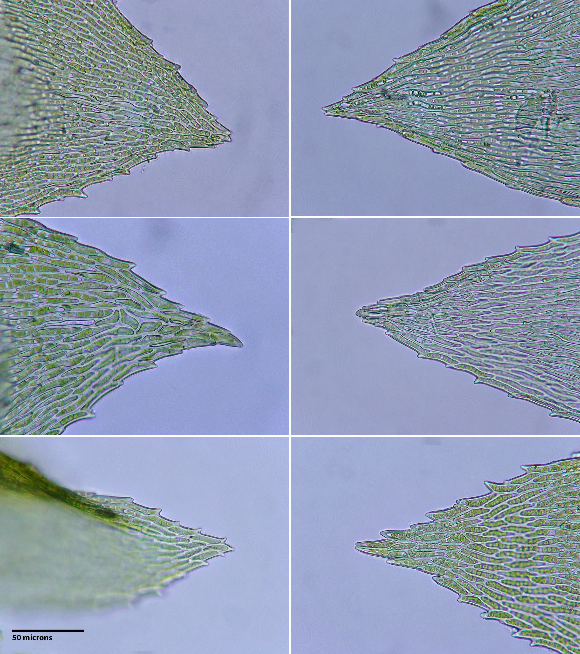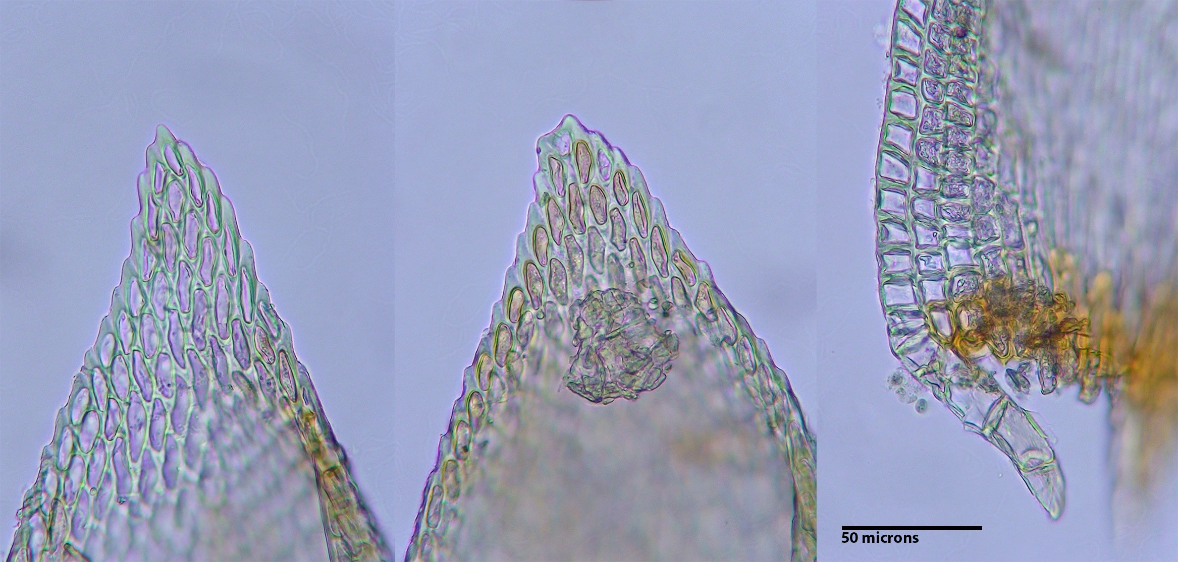 Leaf tips in the left column from larger leaves of robust stem sectors; right column from flagelliform sectors. In confirming the identification of this collection, Bill Buck (NY) commented (e-mail, October 2018), "Note the fairly prominent prorulose cells and how the leaf apex is often a pair of cells rather than just a single cell." Prorulose cells are shown in the next photograph.