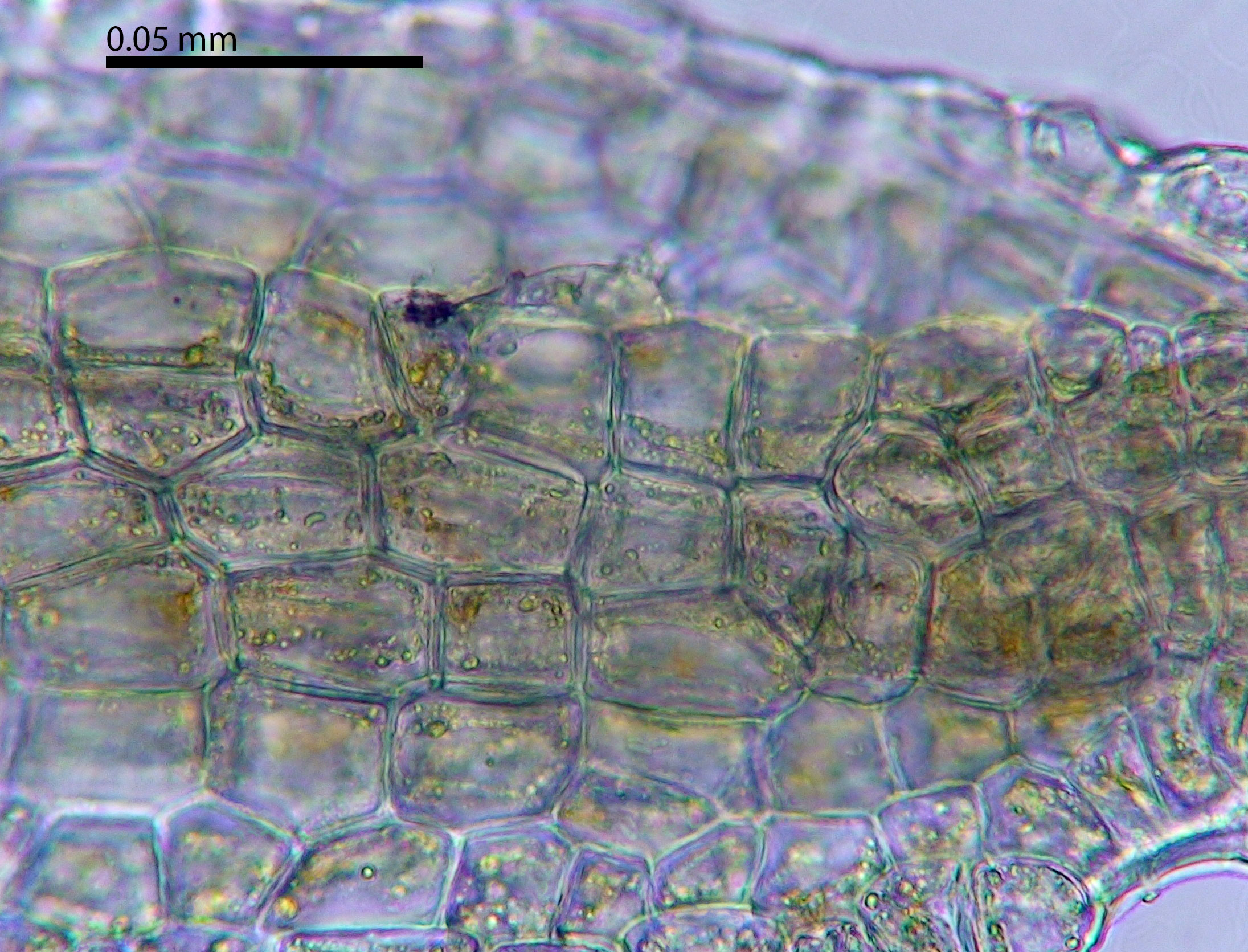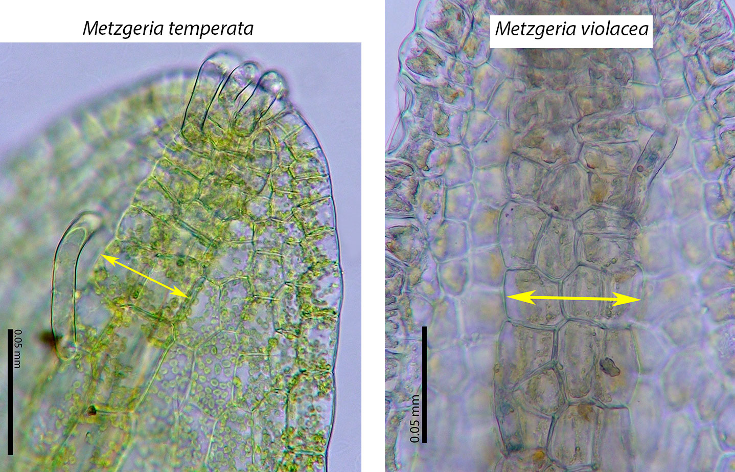 The simplest way to distinguish between M. violacea and the similar M. consanguinea is to count the epidermal cells of the costa in attenuate branches, 2 in M. consanguinea and at least 3 in M. violacea.