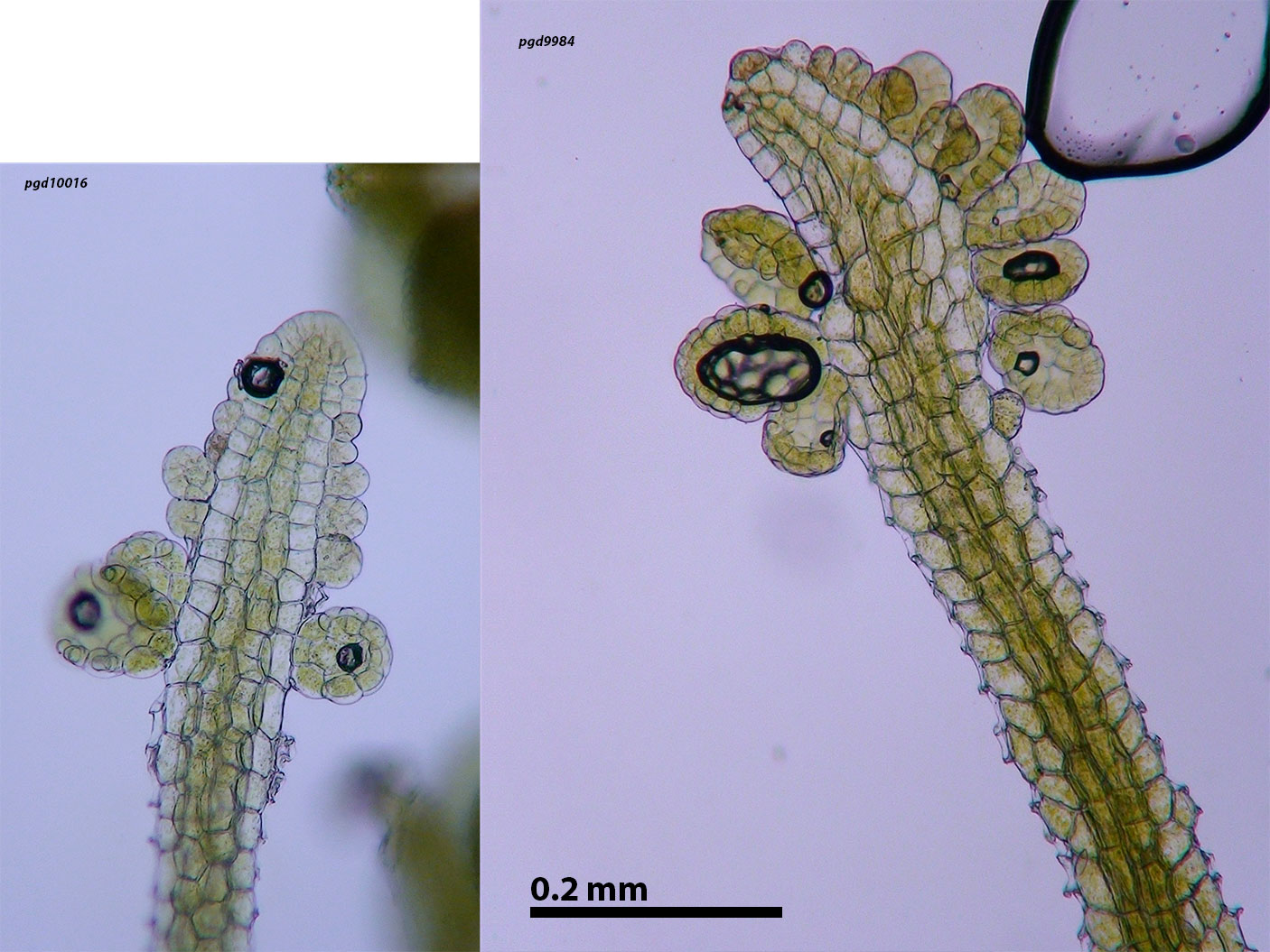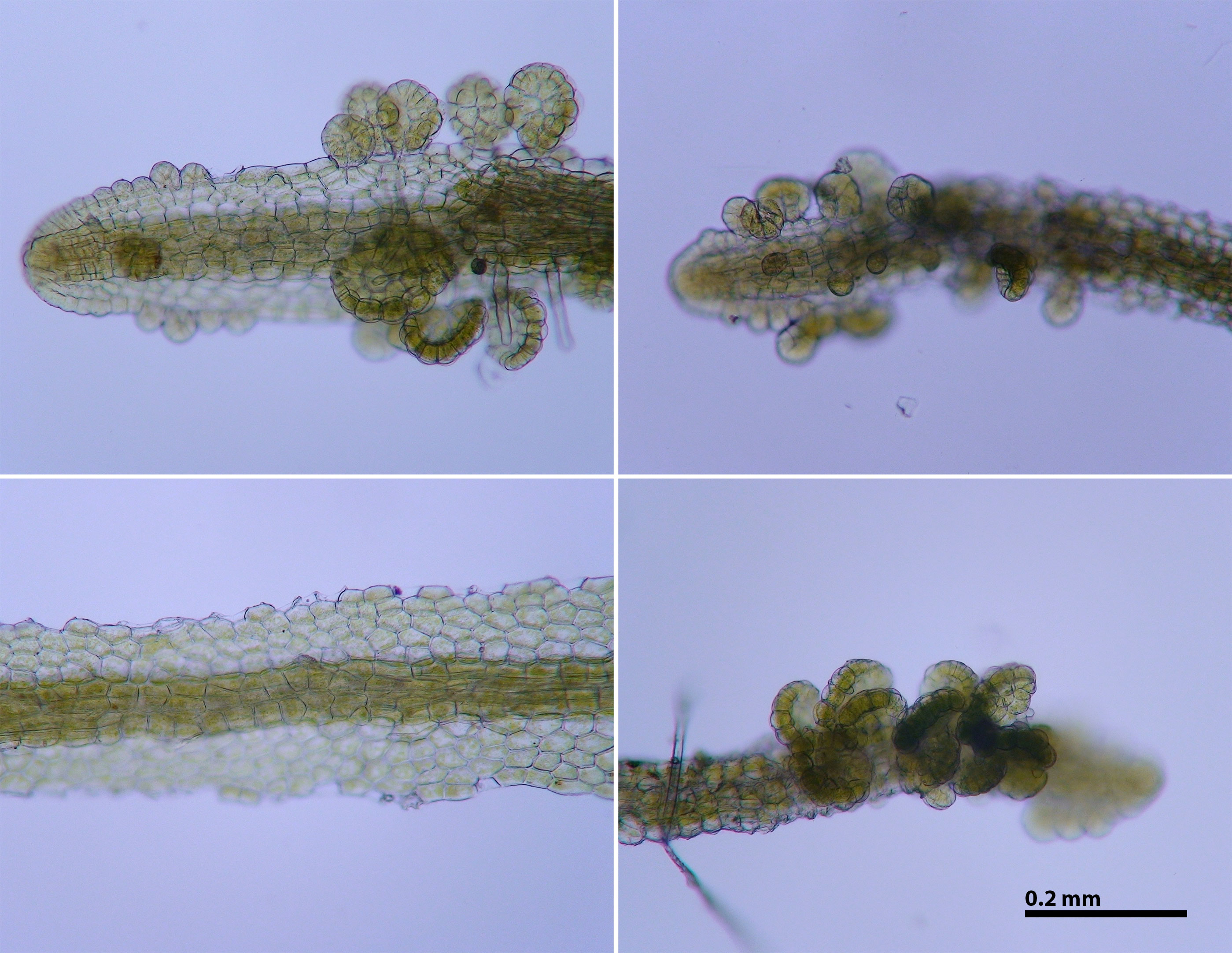 Attenuate branches, at left, showing 3-4 epidermal cells; at right, showing gemmae arising over the costa.