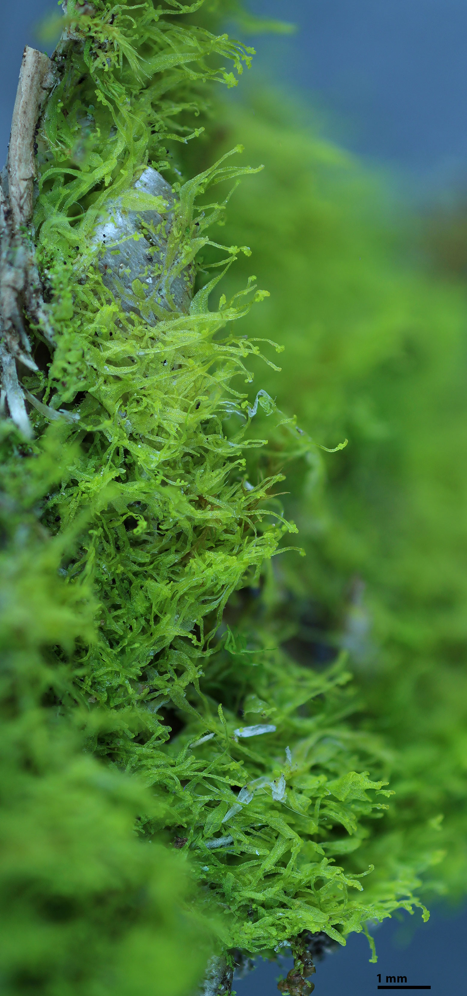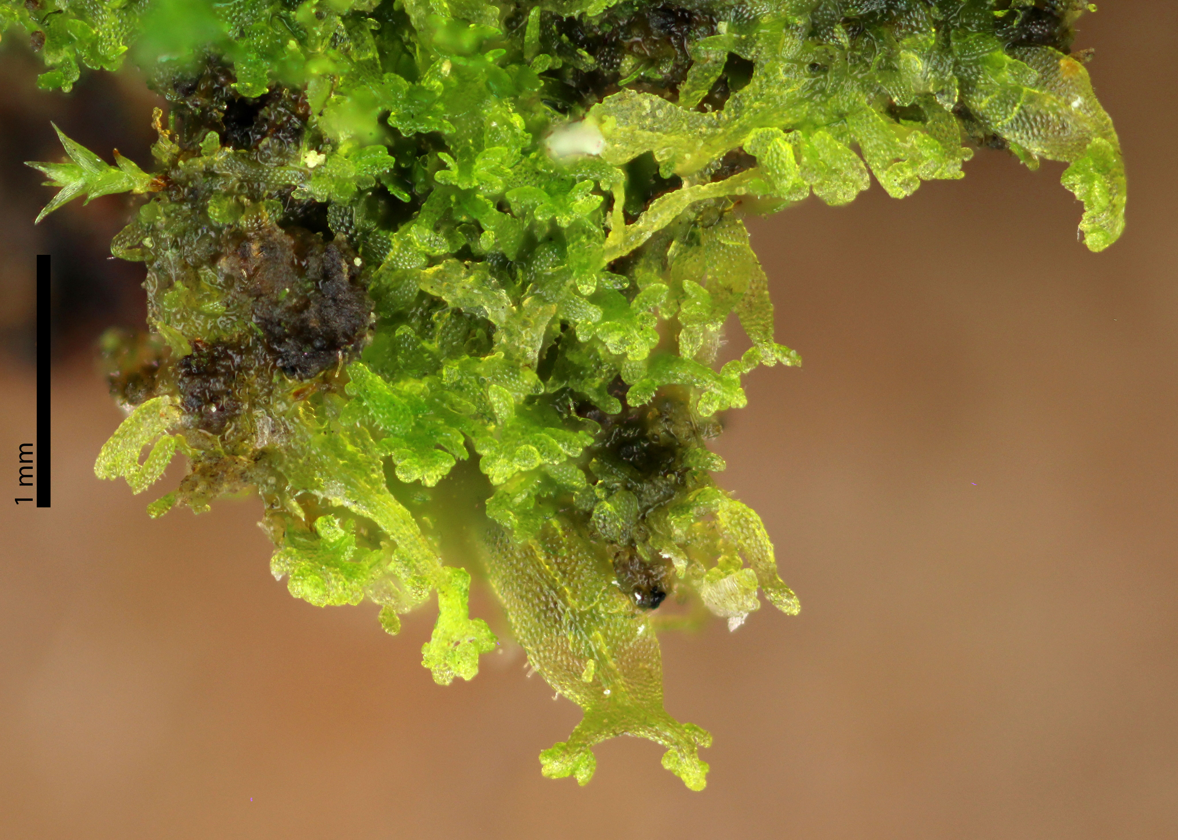 Plants yellow-green, ribbon-like, furcately branched, thalli up to ca. 1.5 mm wide forming thin mats. Thalli costate with hairs mostly limited to thallus margins and the ventral side of the costa. Plants producing erect, ascending, attenuate branches bearing gemmae near the branch apex, gemmae originate from the laminal margins of attenuate branches and from the dorsal and ventral surfaces of the costa of attenuate branches. Costa of attenuate branches with 3-4 rows of epidermal cells on both the dorsal and ventral sides. Plants usually developing a blue coloration in all or part of the thallus after preservation by drying.