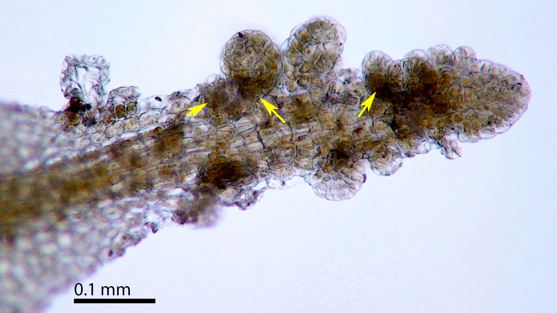 Yellow arrows point to gemmae arising on the dorsal surface of the costa.