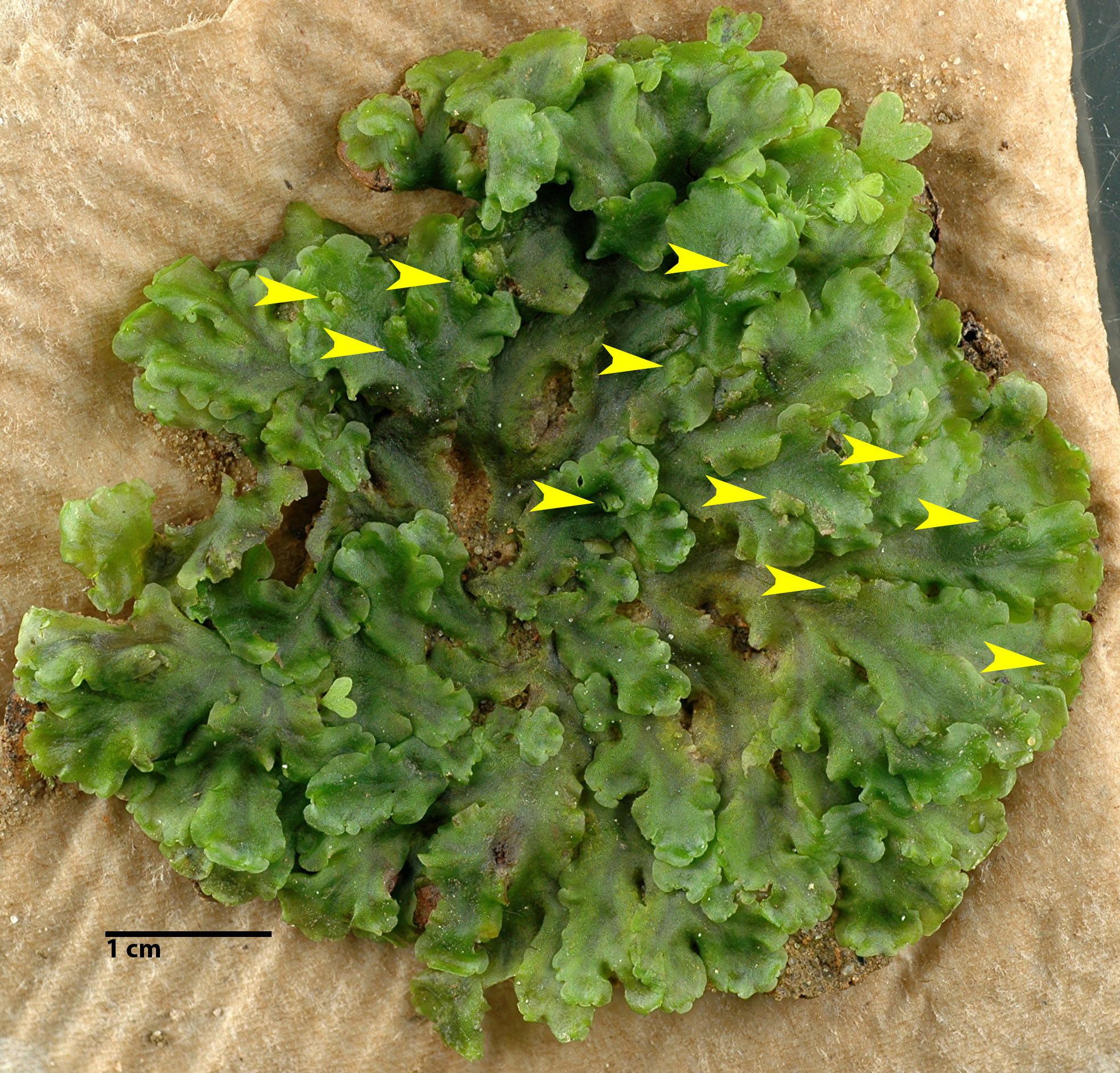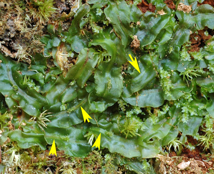 The yellow arrows indicate female involucres; the rosette growth on bare soil suggests this mat originated from very few spores.