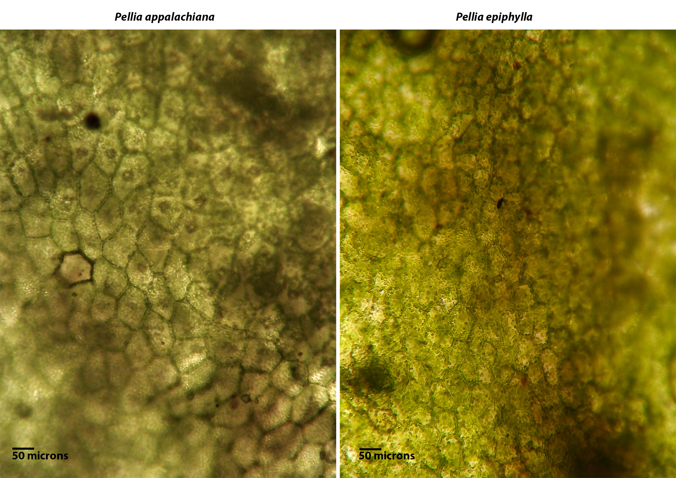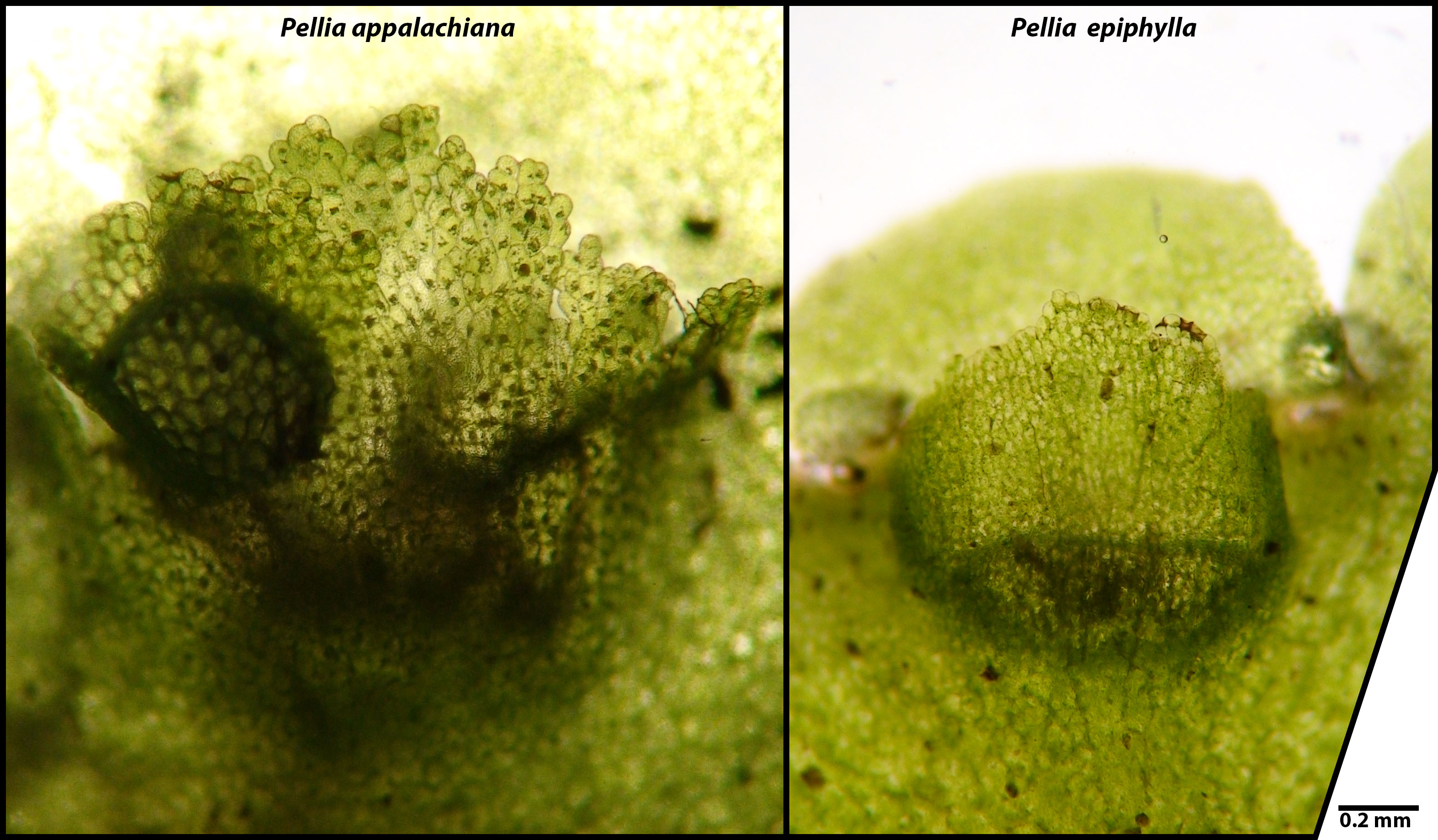 There may be distinctions in cell size between our southeastern species of Pellia, but the potential for size overlap and atypical dimensions when growing under particularly wet conditions, makes cell size less than an ideal marker. In plants found growing together, the cells of P. appalachiana are clearly larger than those of P. epiphylla.