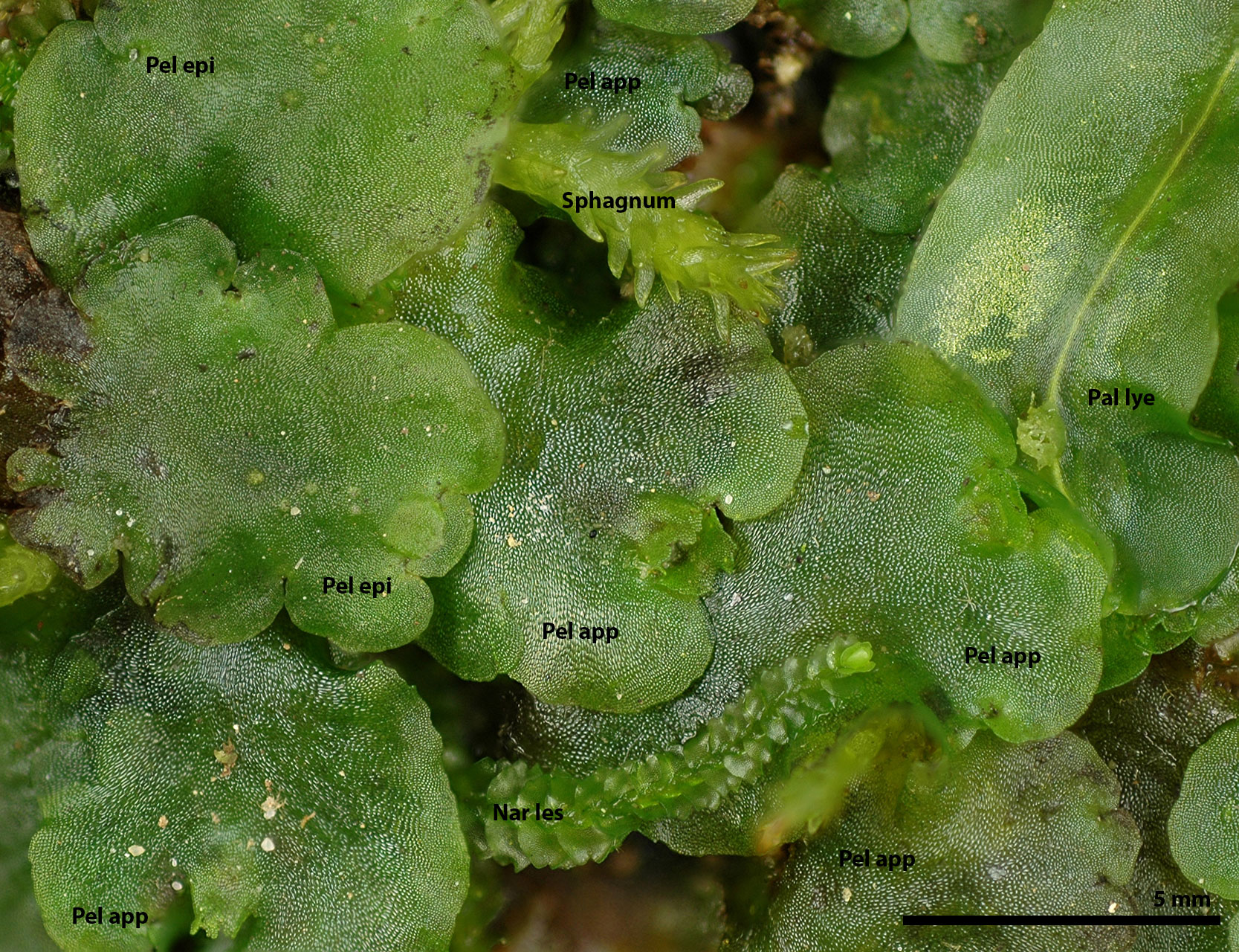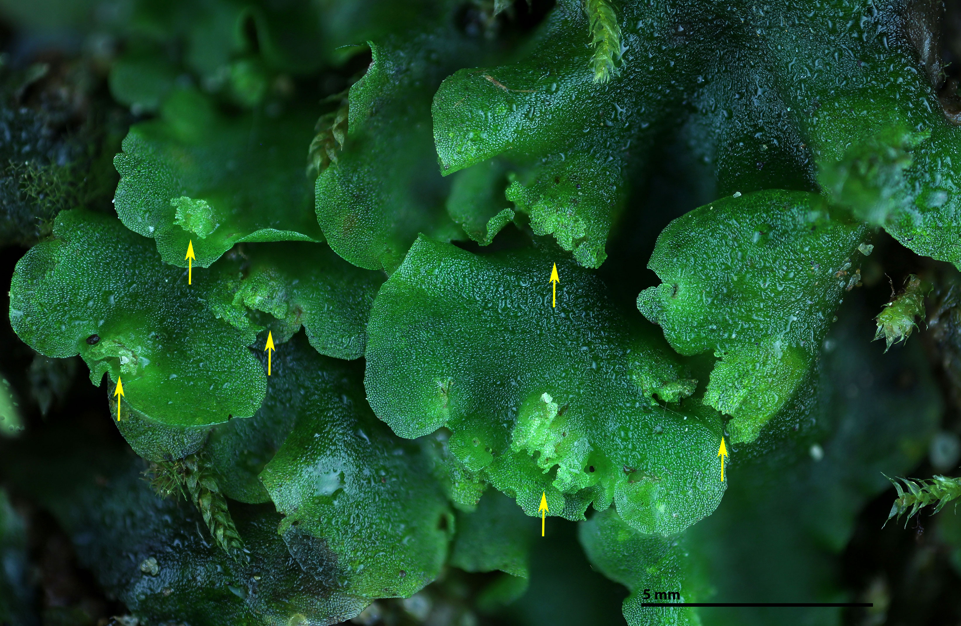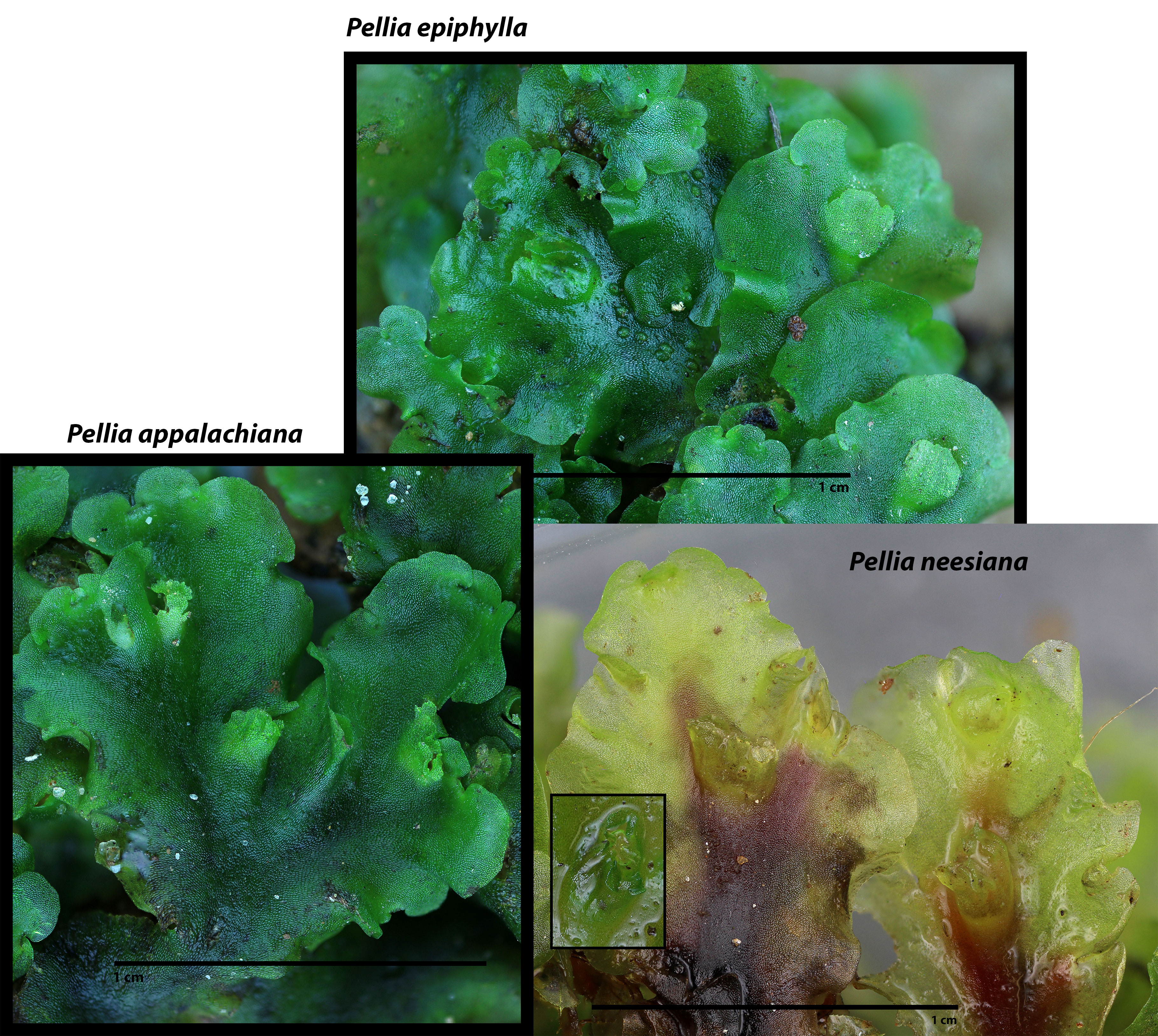 In most collections, P. epiphylla is quickly identified by the presence of antheridial pustules posterior to the female involucre.