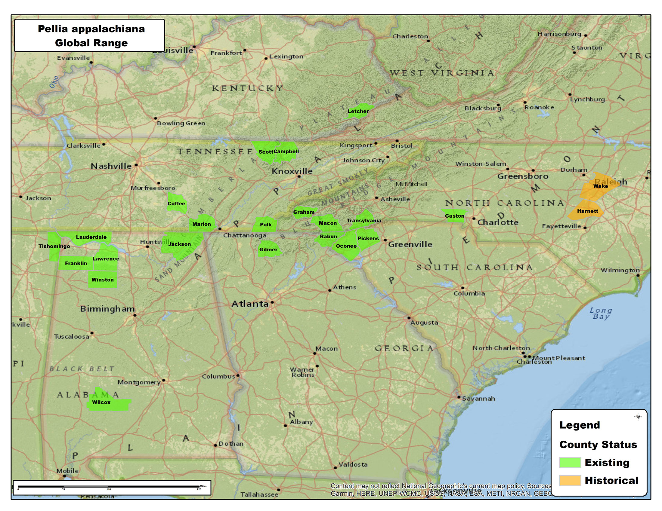 Endemic to southeastern U.S.A. Alabama, Georgia, Kentucky, North Carolina, South Carolina, Tennessee. Pellia appalachiana occurs broadly in the southeastern U.S., without affinity to physiographic provinces. Schuster (1992, p. 472) mentioned “possibly similar plants have been seen once, in eastern Minnesota (Schuster 1991a)" [Unfortunately this work was never published.]. Given an increase in critical collecting, it may well be that Pellia appalachiana will prove to be widely distributed in the Midwestern and Northeastern U.S. [The species was not named until 1991 and since then almost all records on the bryophyte portal throughout the known range are those of a single collector, P.G. Davison.]